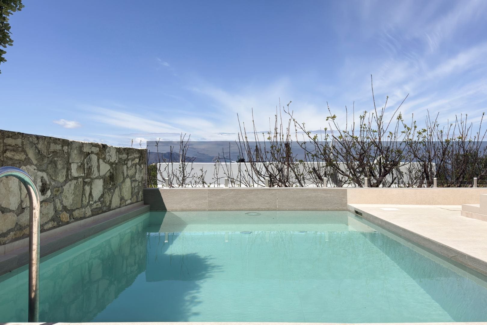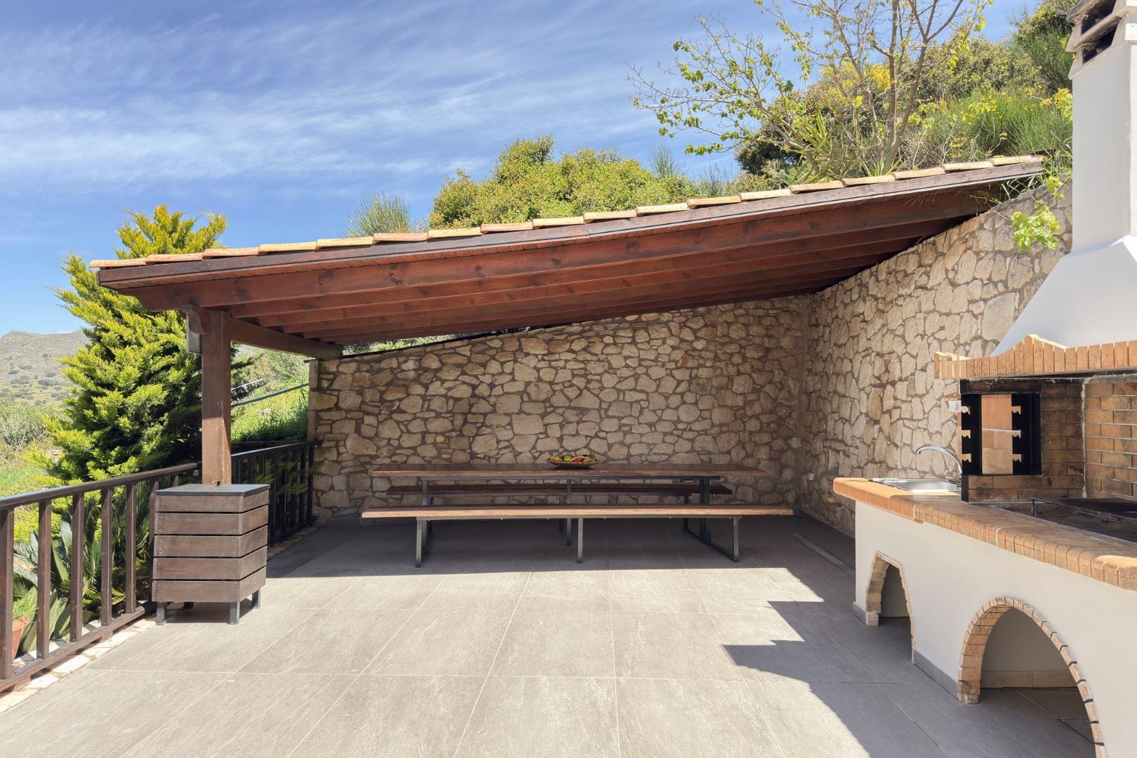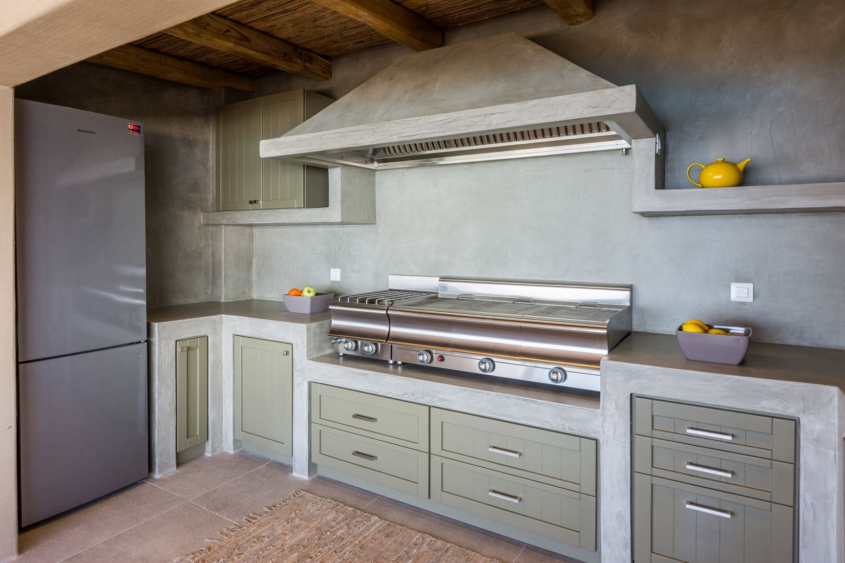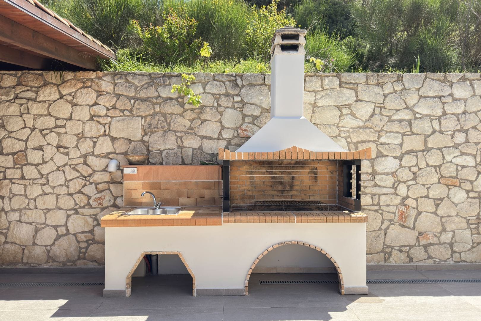 The villa’s living room is a cozy space with a fireplace, perfect for relaxing and enjoying the tranquil ambiance. A dining area and a fully equipped kitchen, complete with a refrigerator, dishwasher, and washing machine, allow guests to prepare and share meals with ease. The villa’s outdoor spaces include a private pool and a barbeque area, ideal for unwinding while taking in the stunning views of the surrounding landscape.