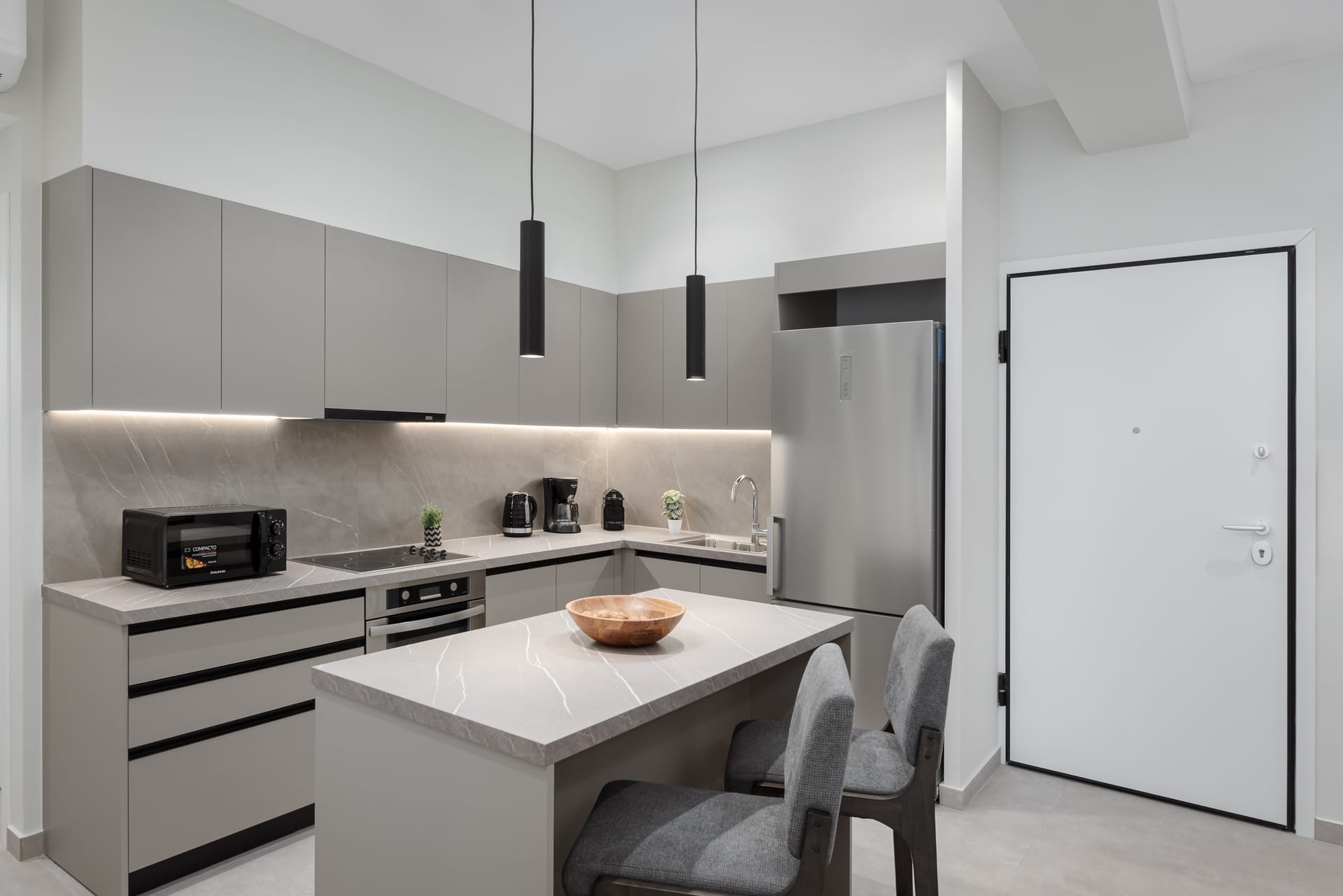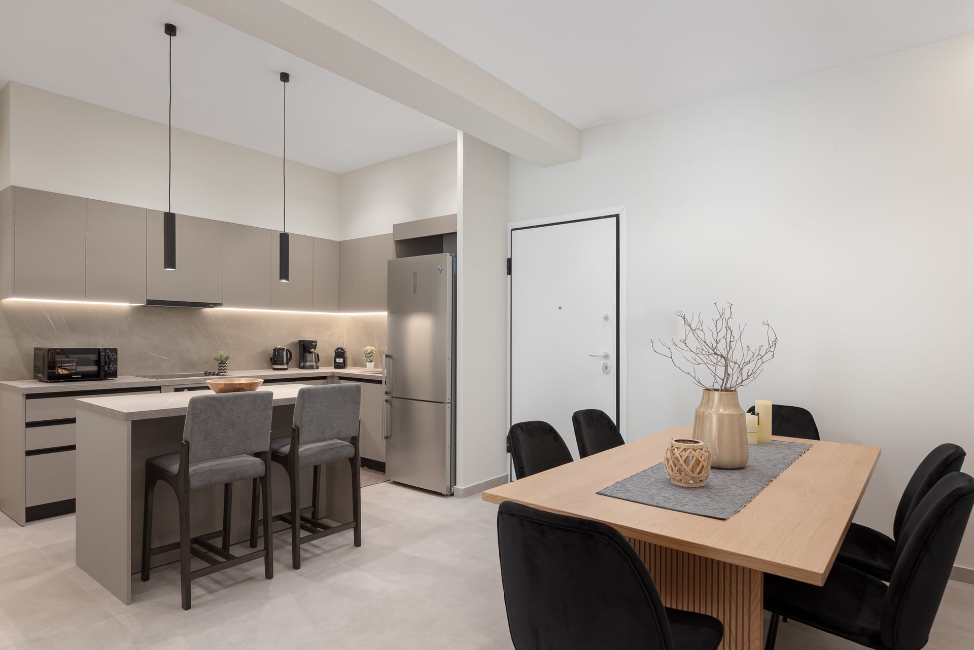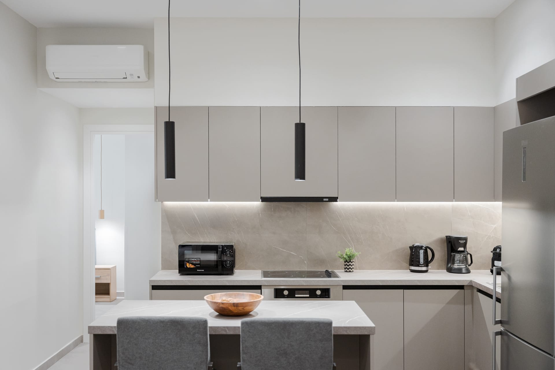 The spacious living room, equipped with air conditioning and a smart TV, provides a relaxing environment for unwinding after a day of exploration. Adjacent to it, the modern, fully equipped kitchen offers all the necessary appliances for convenient meal preparation, along with a dining table, perfect for enjoying meals in a cozy setting.