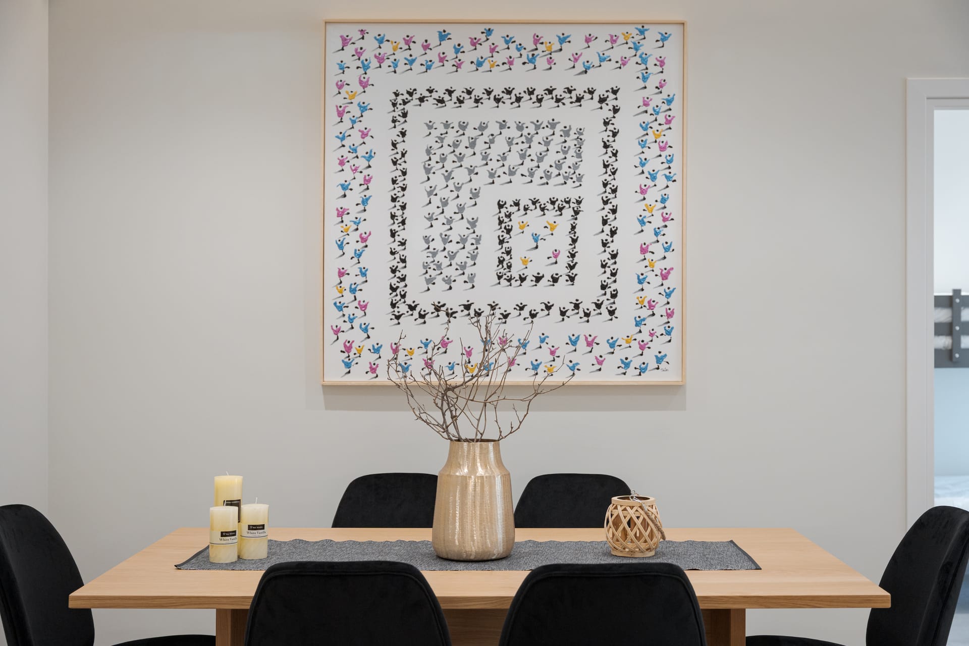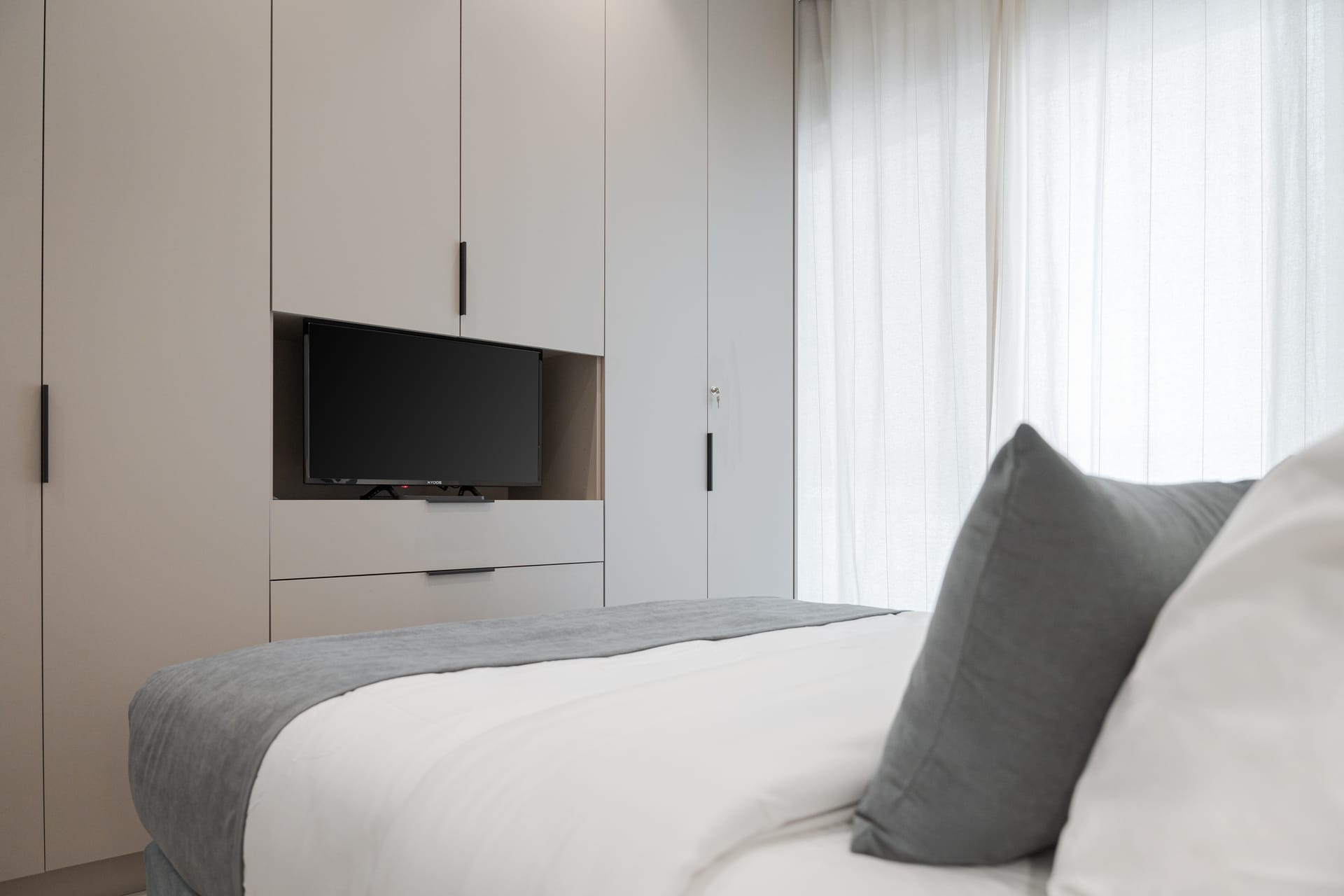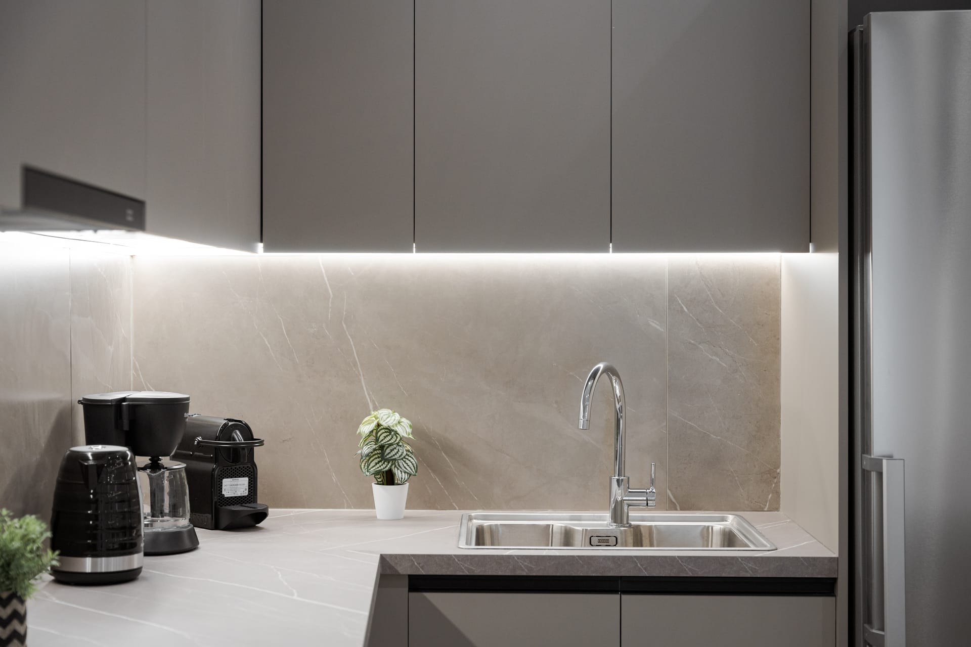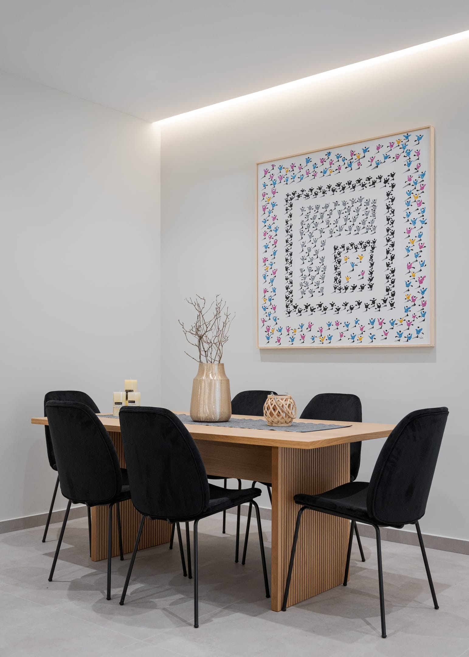The spacious living room, equipped with air conditioning and a smart TV, provides a relaxing environment for unwinding after a day of exploration. Adjacent to it, the modern, fully equipped kitchen offers all the necessary appliances for convenient meal preparation, along with a dining table, perfect for enjoying meals in a cozy setting.