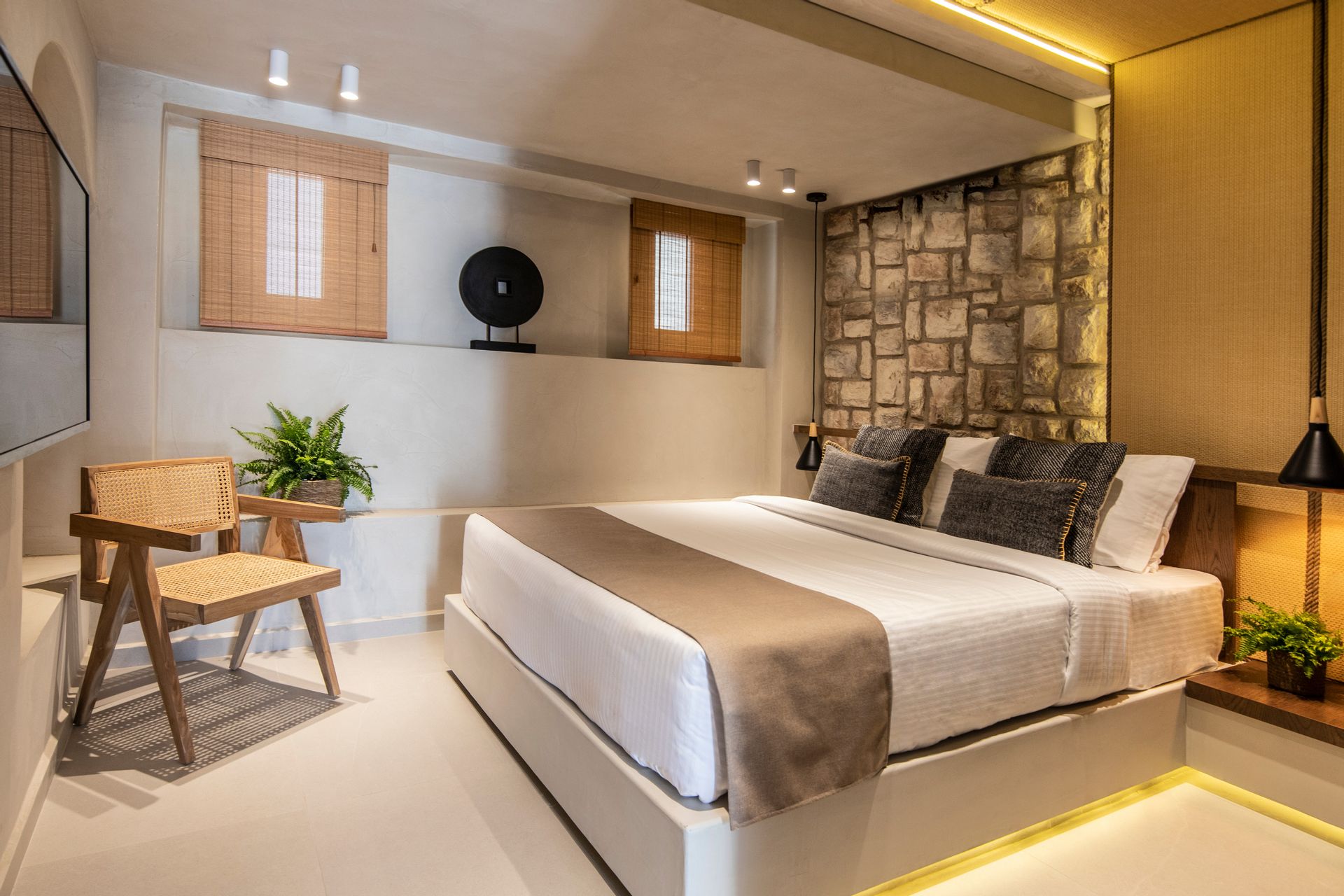 This well-appointed suite features two distinct bedrooms—the master bedroom with a king-size bed and an en-suite bathroom, and the second bedroom with two twin beds (which can be converted to a double bed upon request). Both bedrooms come with 43-inch Smart TVs, providing access to global satellite channels and Netflix. The suite also includes two luxurious bathrooms, each equipped with a walk-in shower and eco-friendly amenities certified by ECOCERT. To enhance your experience, plush bathrobes, slippers, and pool towels are provided for your comfort.