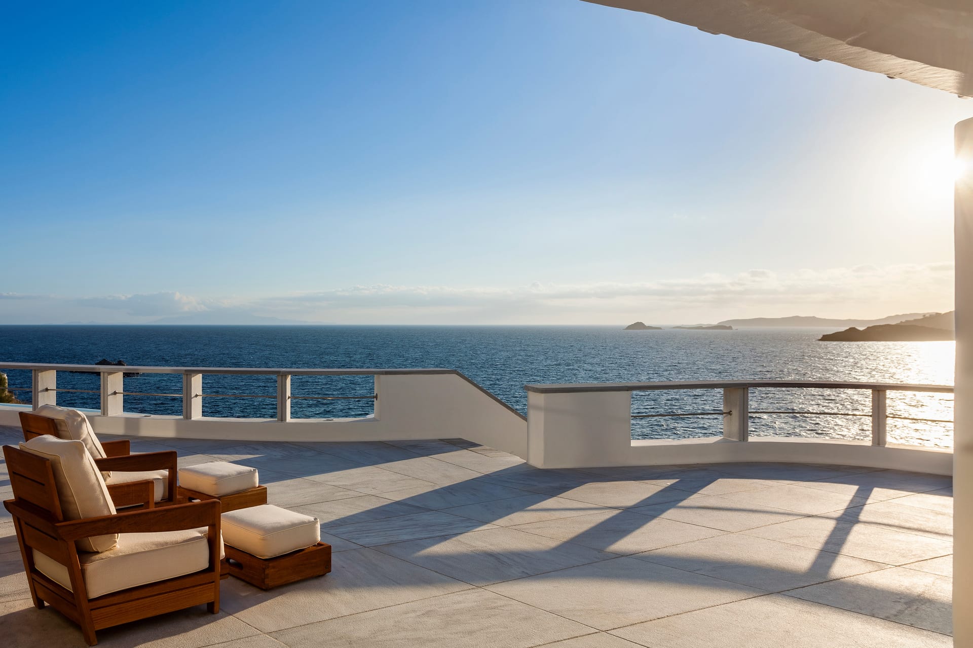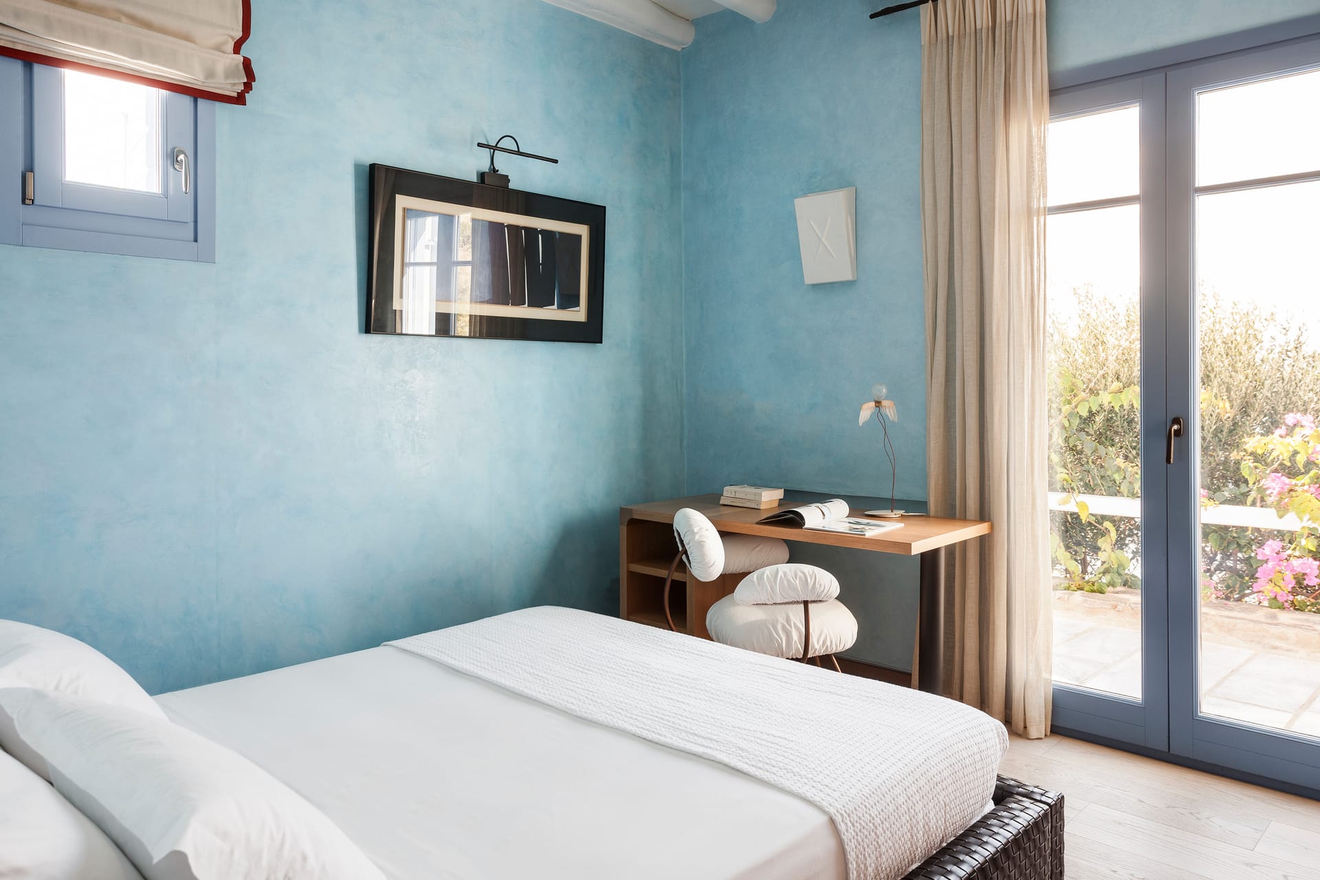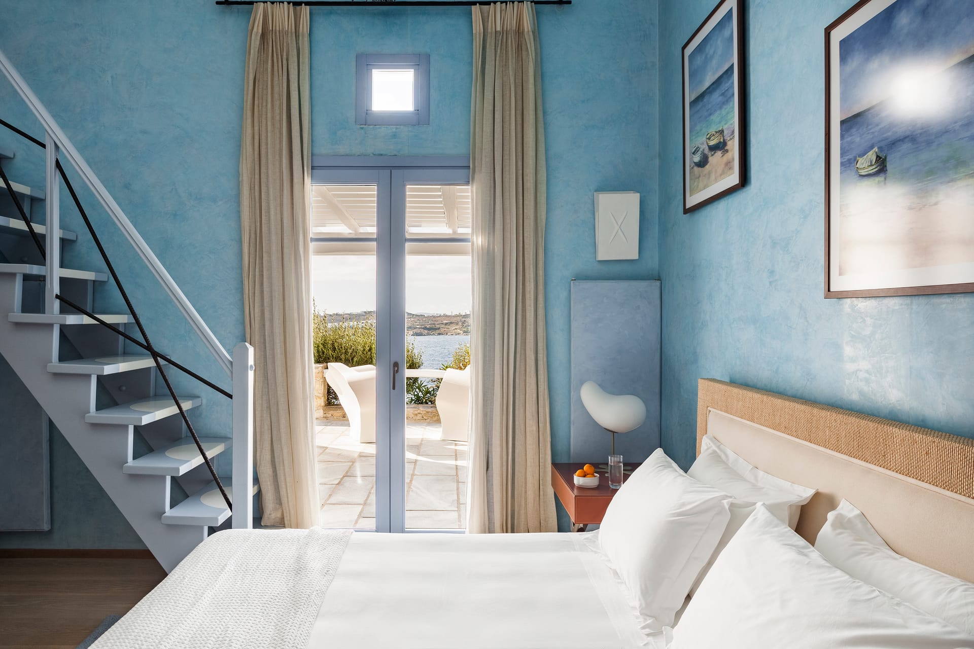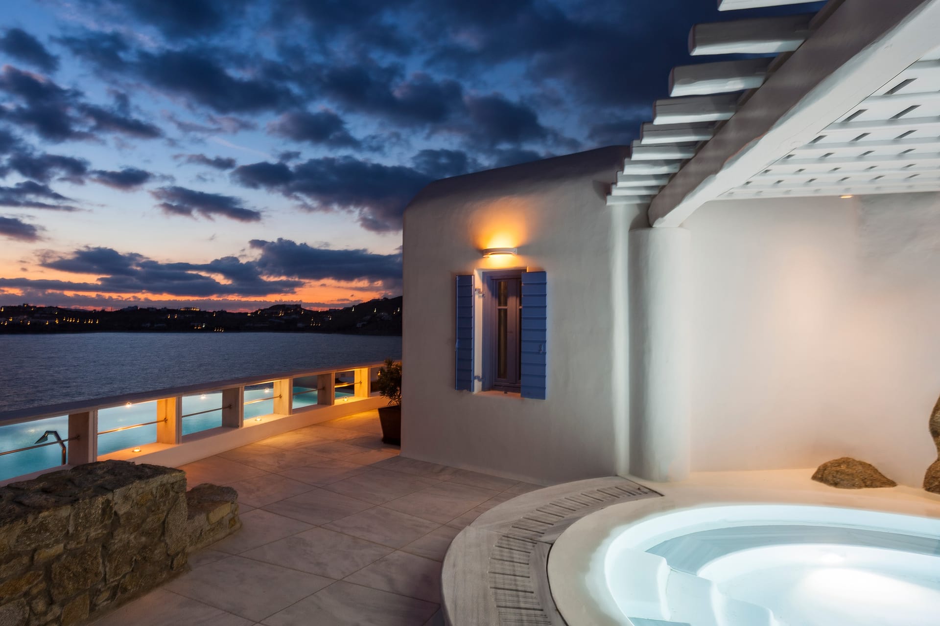 Otherworldly Villa Olympia is perched on the waterfront of the Agios Lazaros Mykonos private 10-Villa estate and enjoys an enviable view of Delos and Rhenea islands over a majestic drop to the sea, offering the picture-perfect Mykonos sunset and direct access to the sea and jetty. The Alberto Pinto-inspired frescoes, adorning the walls with images from Greek Mythology, are original works created in honor of the Olympic Games that were hosted in Greece in 2004. The world-renown designer, Alberto Pinto, intended the indoor colors and designs to distract and inspire guests from the over-powering natural beauty of the island, and the curvaceous furniture is intended to complement the island’s unique rounded Cycladic architecture, where 90-degree angles are all but absent. The unique experience of entering the Pinto inspired villa provides the supreme cocooning effect intended. In contrast to the interior, the exterior of Villa Olympia draws upon the magnificent, fiery-colored, stone-chiseled walls and broad flagstones to blend into the natural zeitgeist of the island’s wild-side, offering up an uninterrupted frame from within which to view Apollo’s birthplace, Delos, and the myriad of Cycladic islands scattered beyond it into the distance.