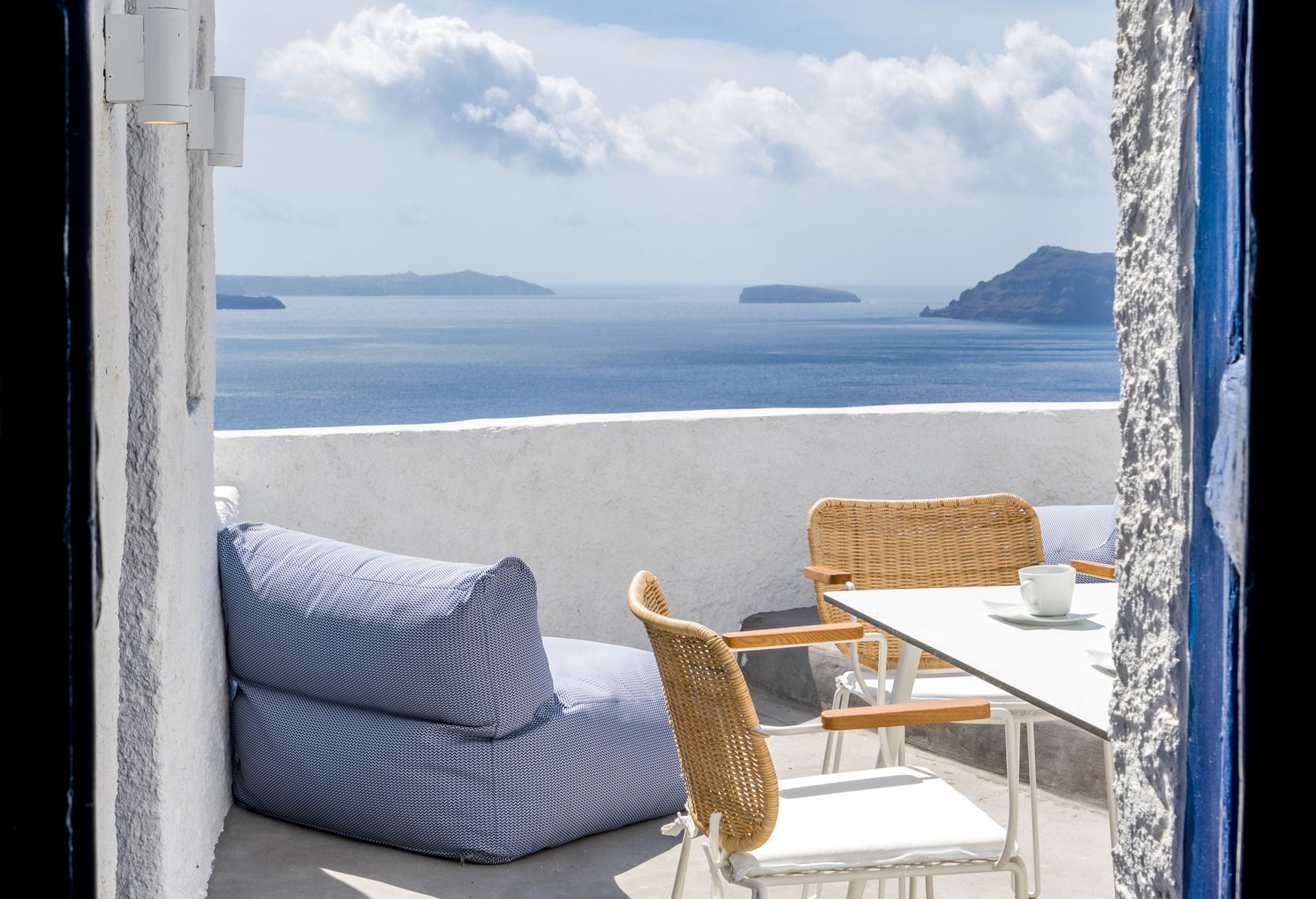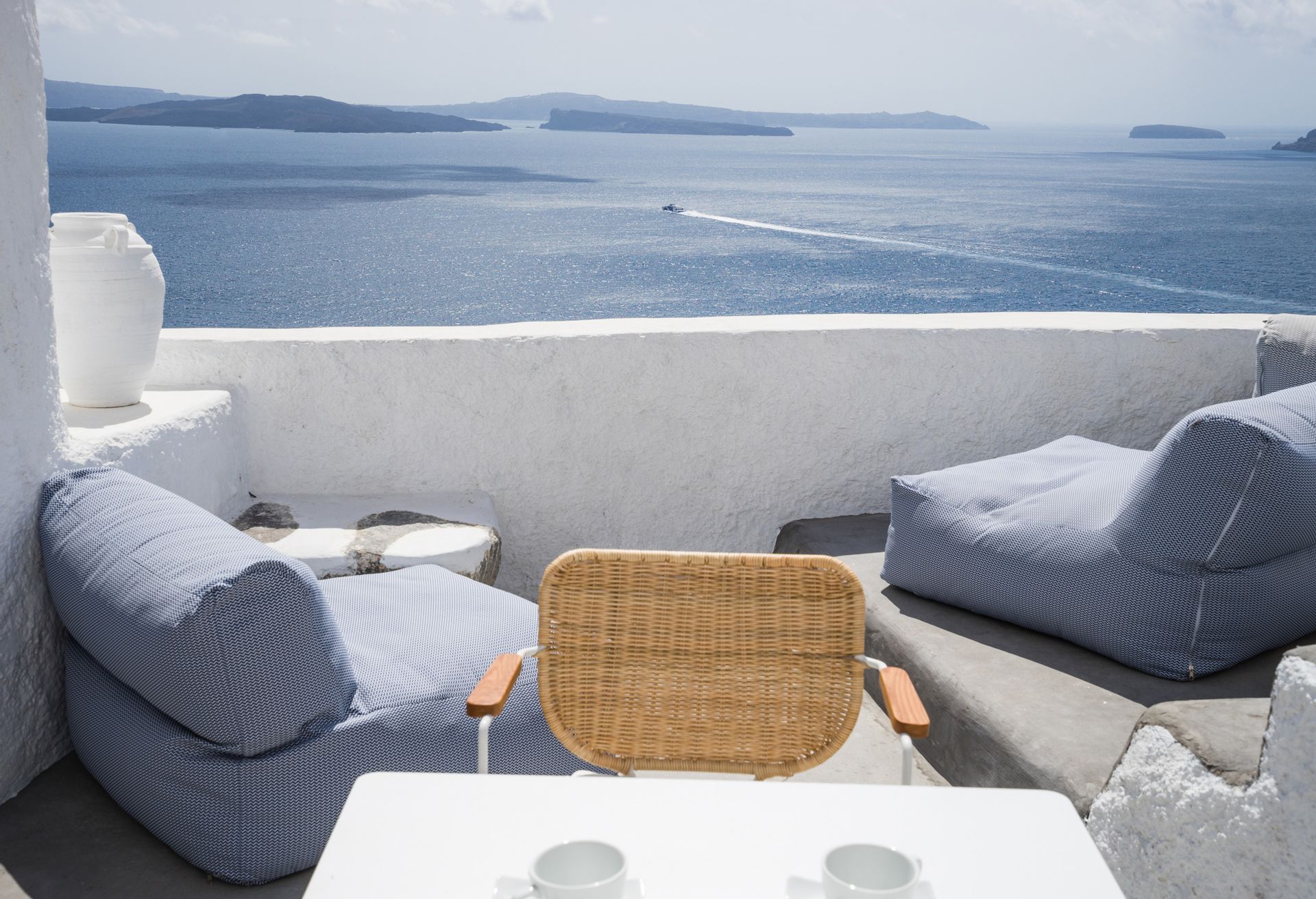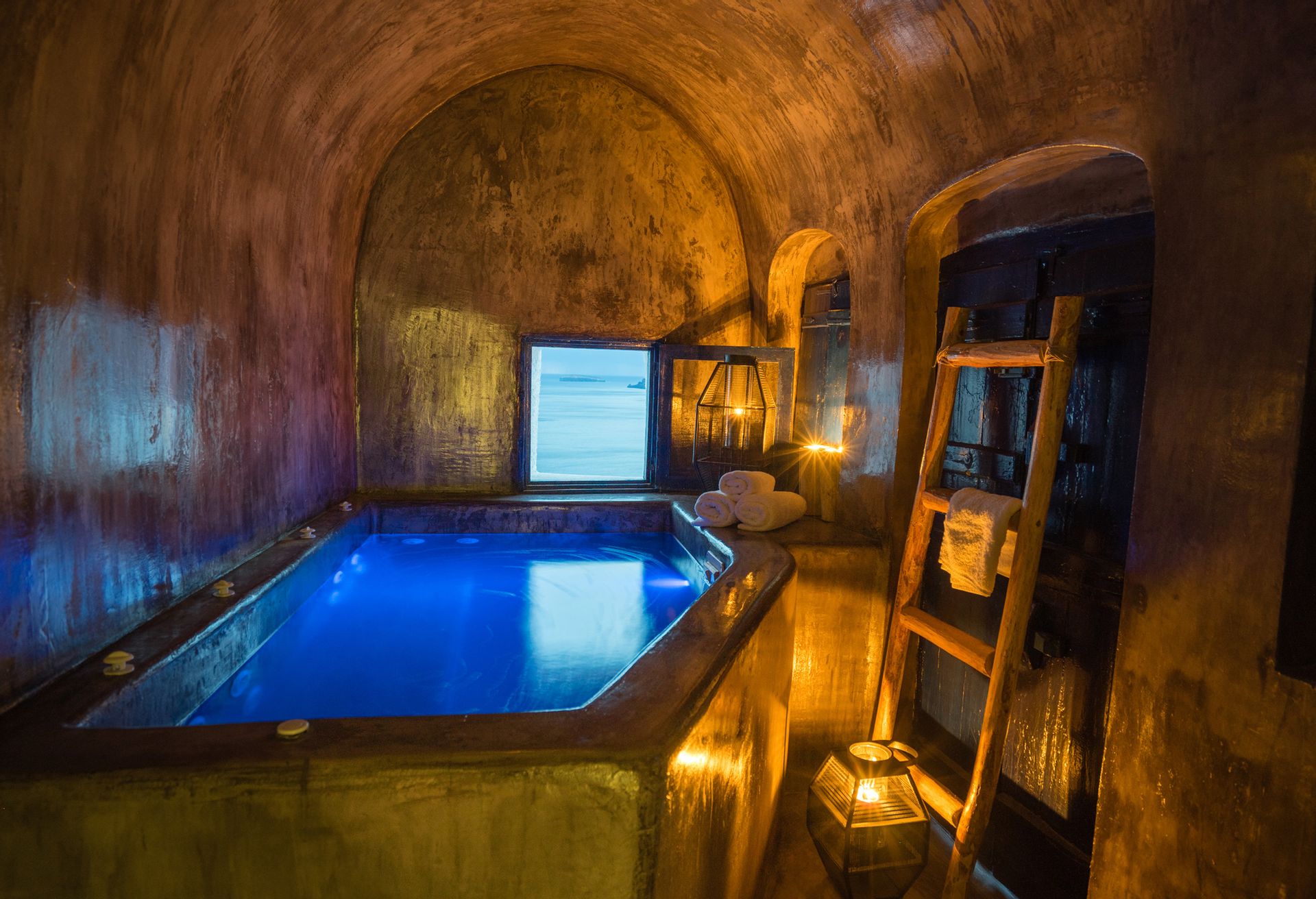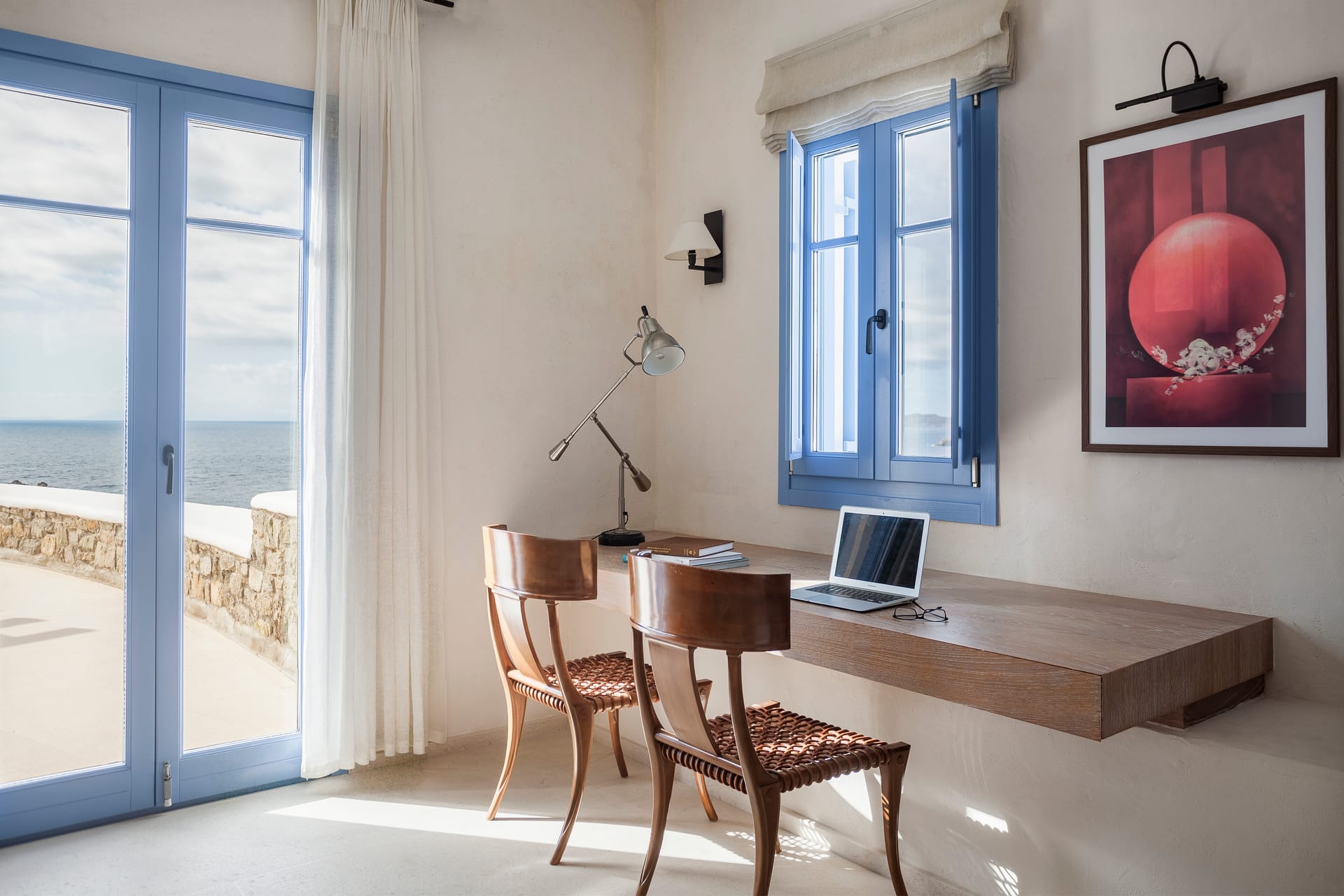 Otherworldly Villa Olympia is perched on the waterfront of the Agios Lazaros Mykonos private 10-Villa estate and enjoys an enviable view of Delos and Rhenea islands over a majestic drop to the sea, offering the picture-perfect Mykonos sunset and direct access to the sea and jetty. The Alberto Pinto-inspired frescoes, adorning the walls with images from Greek Mythology, are original works created in honor of the Olympic Games that were hosted in Greece in 2004. The world-renown designer, Alberto Pinto, intended the indoor colors and designs to distract and inspire guests from the over-powering natural beauty of the island, and the curvaceous furniture is intended to complement the island’s unique rounded Cycladic architecture, where 90-degree angles are all but absent. The unique experience of entering the Pinto inspired villa provides the supreme cocooning effect intended. In contrast to the interior, the exterior of Villa Olympia draws upon the magnificent, fiery-colored, stone-chiseled walls and broad flagstones to blend into the natural zeitgeist of the island’s wild-side, offering up an uninterrupted frame from within which to view Apollo’s birthplace, Delos, and the myriad of Cycladic islands scattered beyond it into the distance.