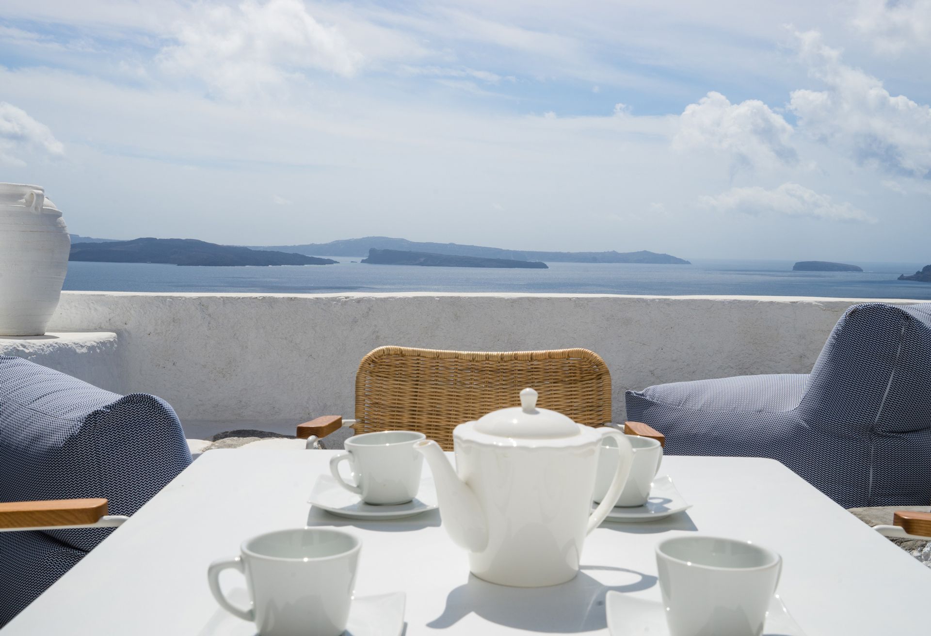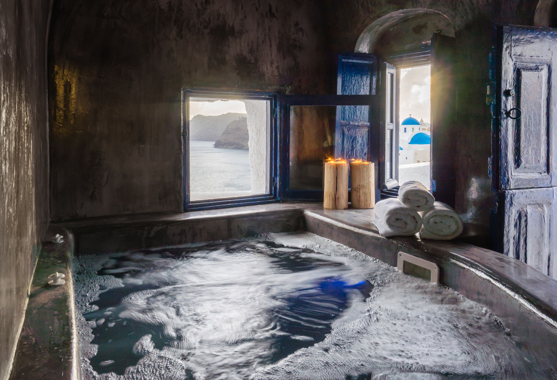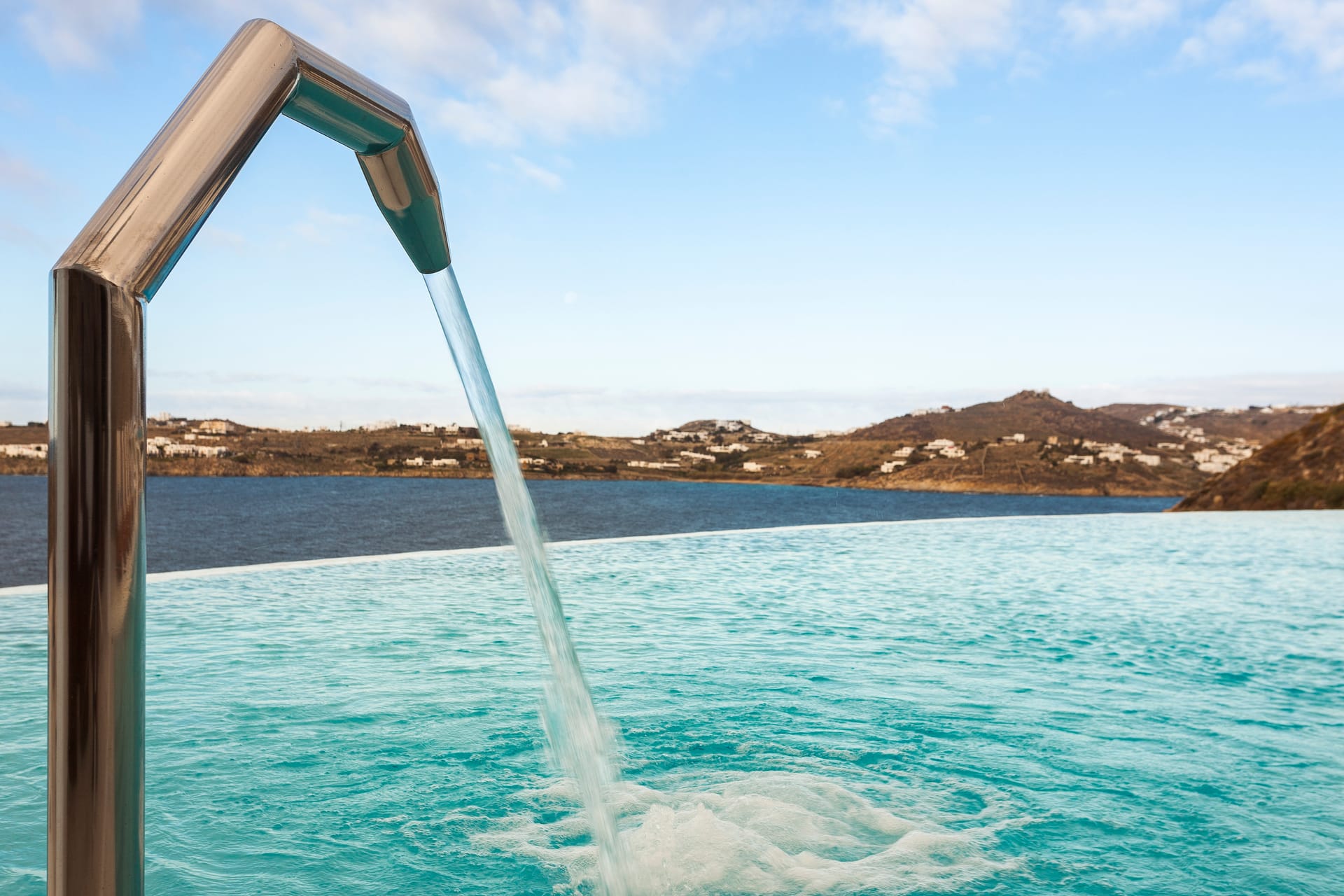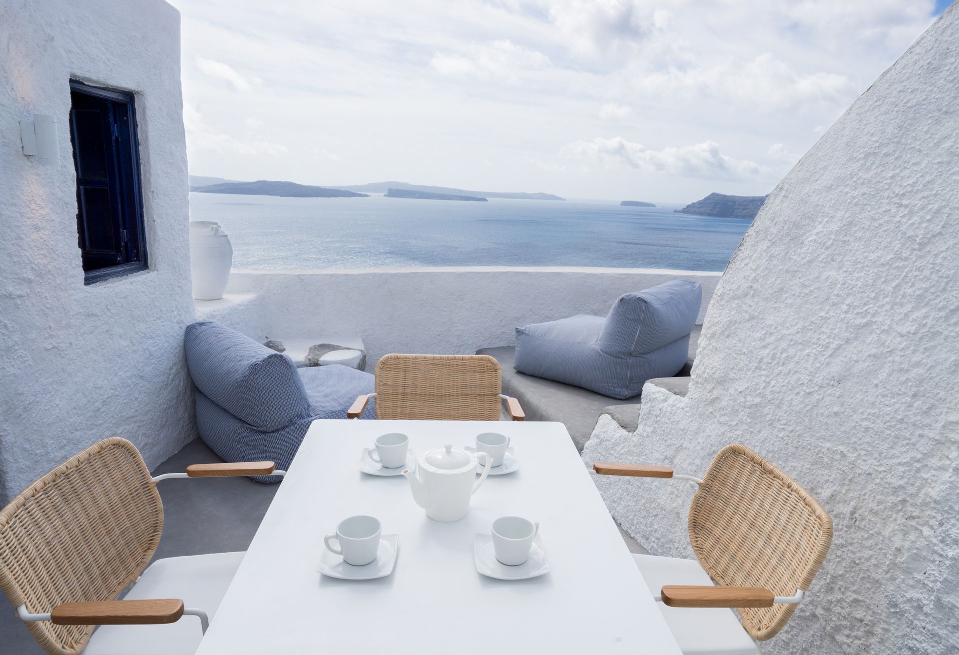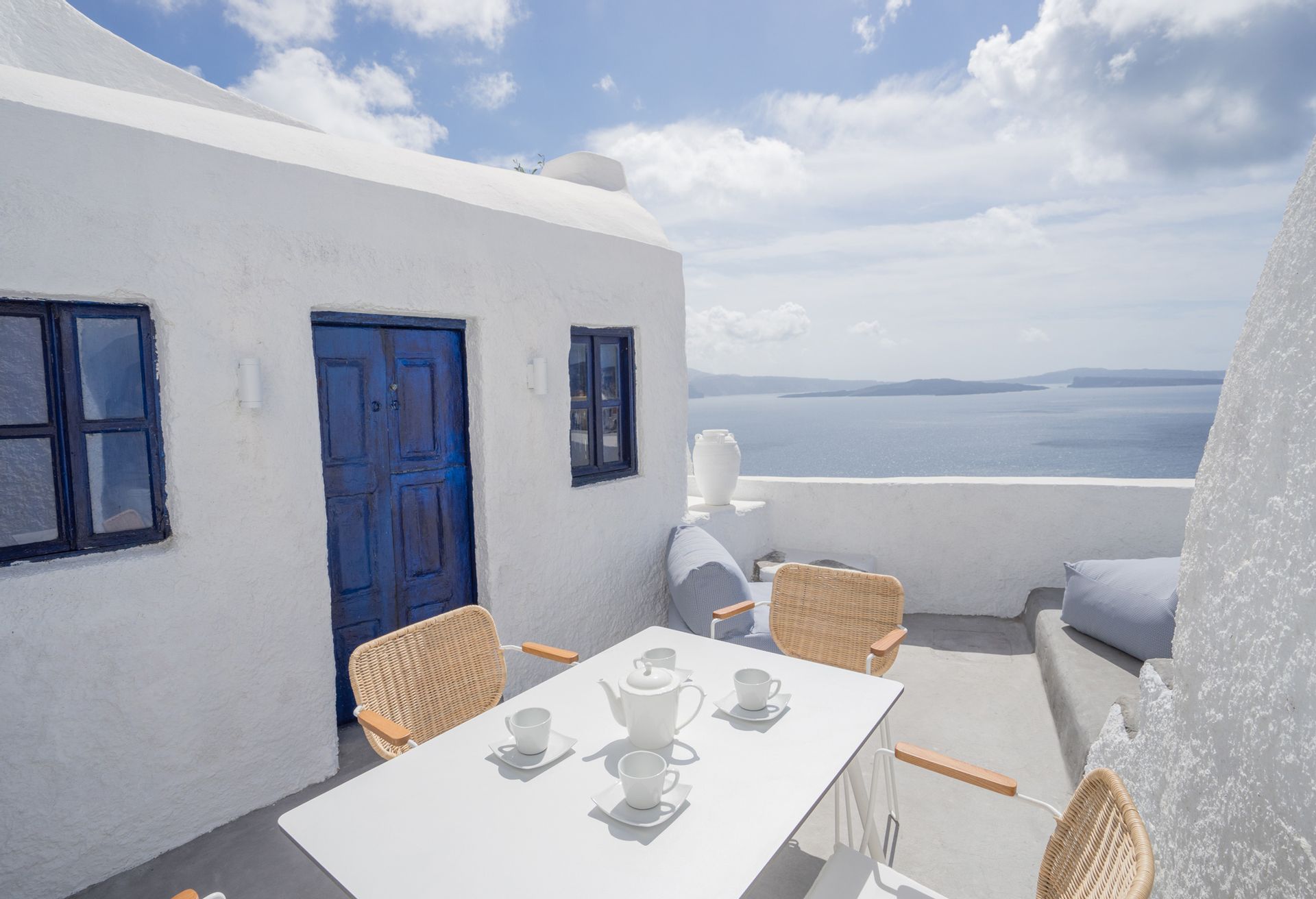 Otherworldly Villa Olympia is perched on the waterfront of the Agios Lazaros Mykonos private 10-Villa estate and enjoys an enviable view of Delos and Rhenea islands over a majestic drop to the sea, offering the picture-perfect Mykonos sunset and direct access to the sea and jetty. The Alberto Pinto-inspired frescoes, adorning the walls with images from Greek Mythology, are original works created in honor of the Olympic Games that were hosted in Greece in 2004. The world-renown designer, Alberto Pinto, intended the indoor colors and designs to distract and inspire guests from the over-powering natural beauty of the island, and the curvaceous furniture is intended to complement the island’s unique rounded Cycladic architecture, where 90-degree angles are all but absent. The unique experience of entering the Pinto inspired villa provides the supreme cocooning effect intended. In contrast to the interior, the exterior of Villa Olympia draws upon the magnificent, fiery-colored, stone-chiseled walls and broad flagstones to blend into the natural zeitgeist of the island’s wild-side, offering up an uninterrupted frame from within which to view Apollo’s birthplace, Delos, and the myriad of Cycladic islands scattered beyond it into the distance.