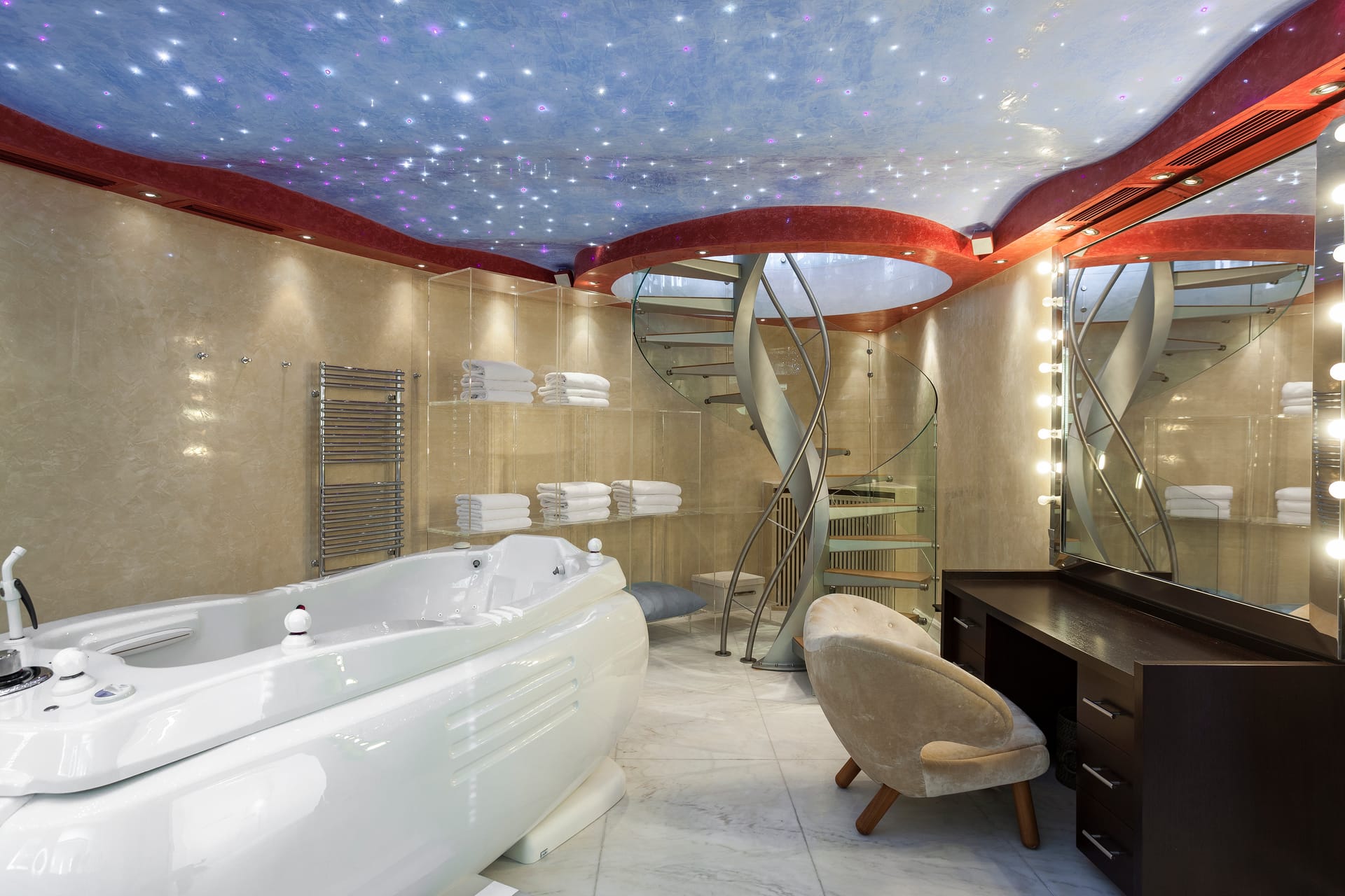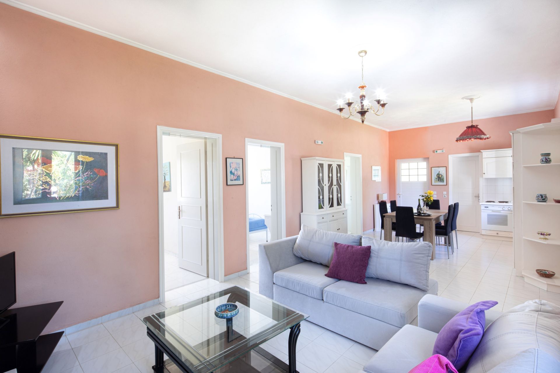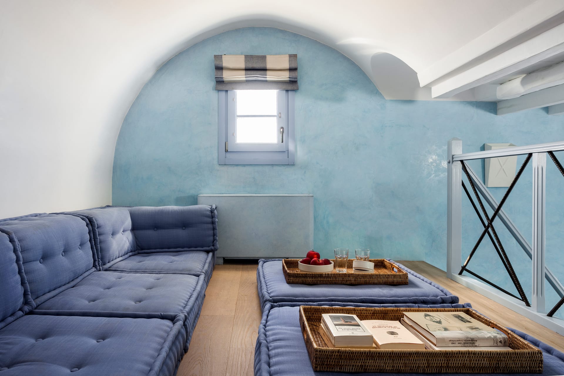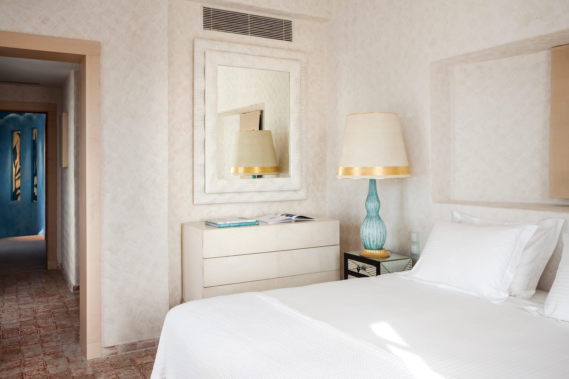 Otherworldly Villa Olympia is perched on the waterfront of the Agios Lazaros Mykonos private 10-Villa estate and enjoys an enviable view of Delos and Rhenea islands over a majestic drop to the sea, offering the picture-perfect Mykonos sunset and direct access to the sea and jetty. The Alberto Pinto-inspired frescoes, adorning the walls with images from Greek Mythology, are original works created in honor of the Olympic Games that were hosted in Greece in 2004. The world-renown designer, Alberto Pinto, intended the indoor colors and designs to distract and inspire guests from the over-powering natural beauty of the island, and the curvaceous furniture is intended to complement the island’s unique rounded Cycladic architecture, where 90-degree angles are all but absent. The unique experience of entering the Pinto inspired villa provides the supreme cocooning effect intended. In contrast to the interior, the exterior of Villa Olympia draws upon the magnificent, fiery-colored, stone-chiseled walls and broad flagstones to blend into the natural zeitgeist of the island’s wild-side, offering up an uninterrupted frame from within which to view Apollo’s birthplace, Delos, and the myriad of Cycladic islands scattered beyond it into the distance.