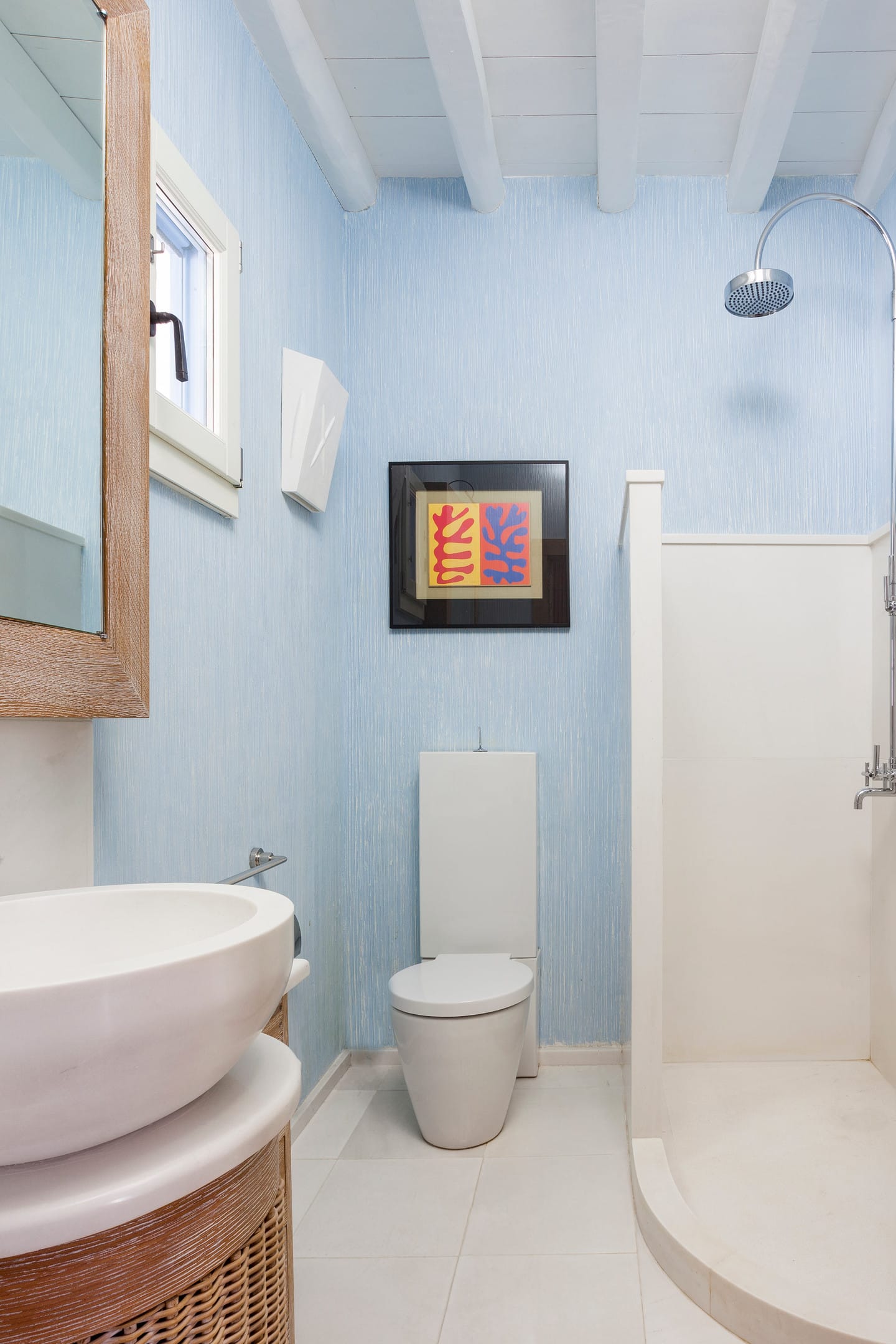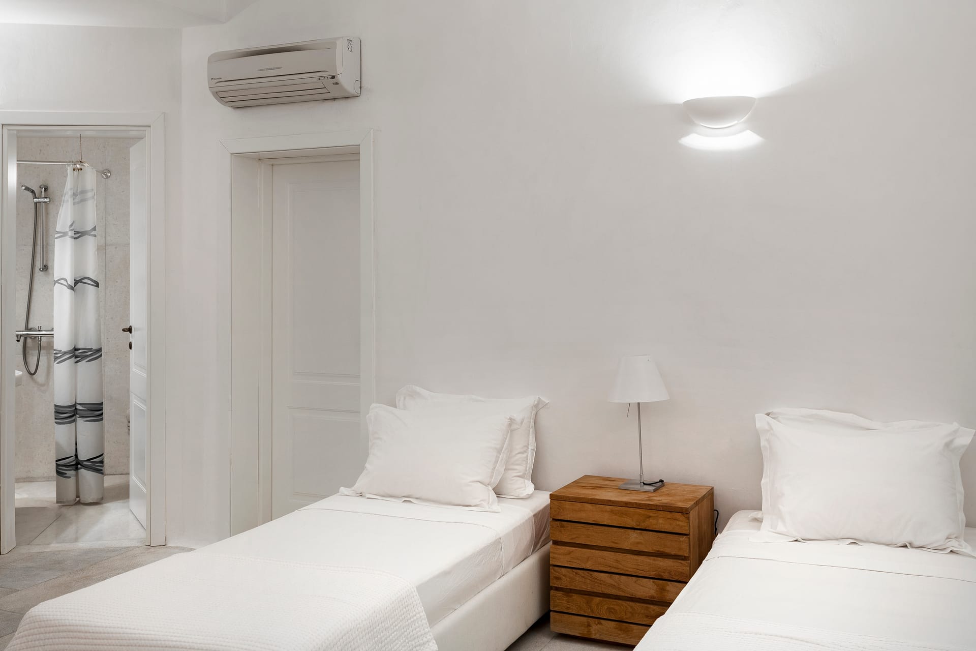 A third large professional fully equipped kitchen allows for plenty of room to prepare parties or events in support of the two kitchens on the floor above. There are two staff rooms each one with en-suite bathroom. An elevator runs throughout the three levels. Villa Olympia boasts an outdoor Jacuzzi for 10-14 people, 2 large BBQs, a wood oven, an outdoor dining table, a fully equipped Gym & Beauty Parlor, a Thalassotherapy spa, a Turkish hammam and two levels of lounging areas in front of the 261m2 infinity pool that flows off into the Aegean horizon. The brilliant white interiors and exteriors and the subtle tasteful decorations reflect the Mykonian-elegance the island is known for, so you can totally immerse yourself in the spirit of the island. The refurbished luxury estate has daily, complimentary maid service-so you don’t lift a finger, 24/7 CCTV monitoring at the periphery of the estate- so unauthorized people are detectable, Netflix- to quench your thirst for relaxed adventure, flat-screen TVs- so everyone can watch, back-up generators- to face the frequent local electric shortages, a desalination plant- so you can ignore the frequent local water shortages, and a 24/7 gate-access control. The pool can be heated for a fee.