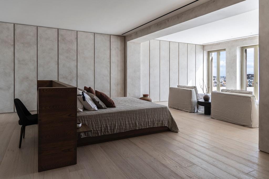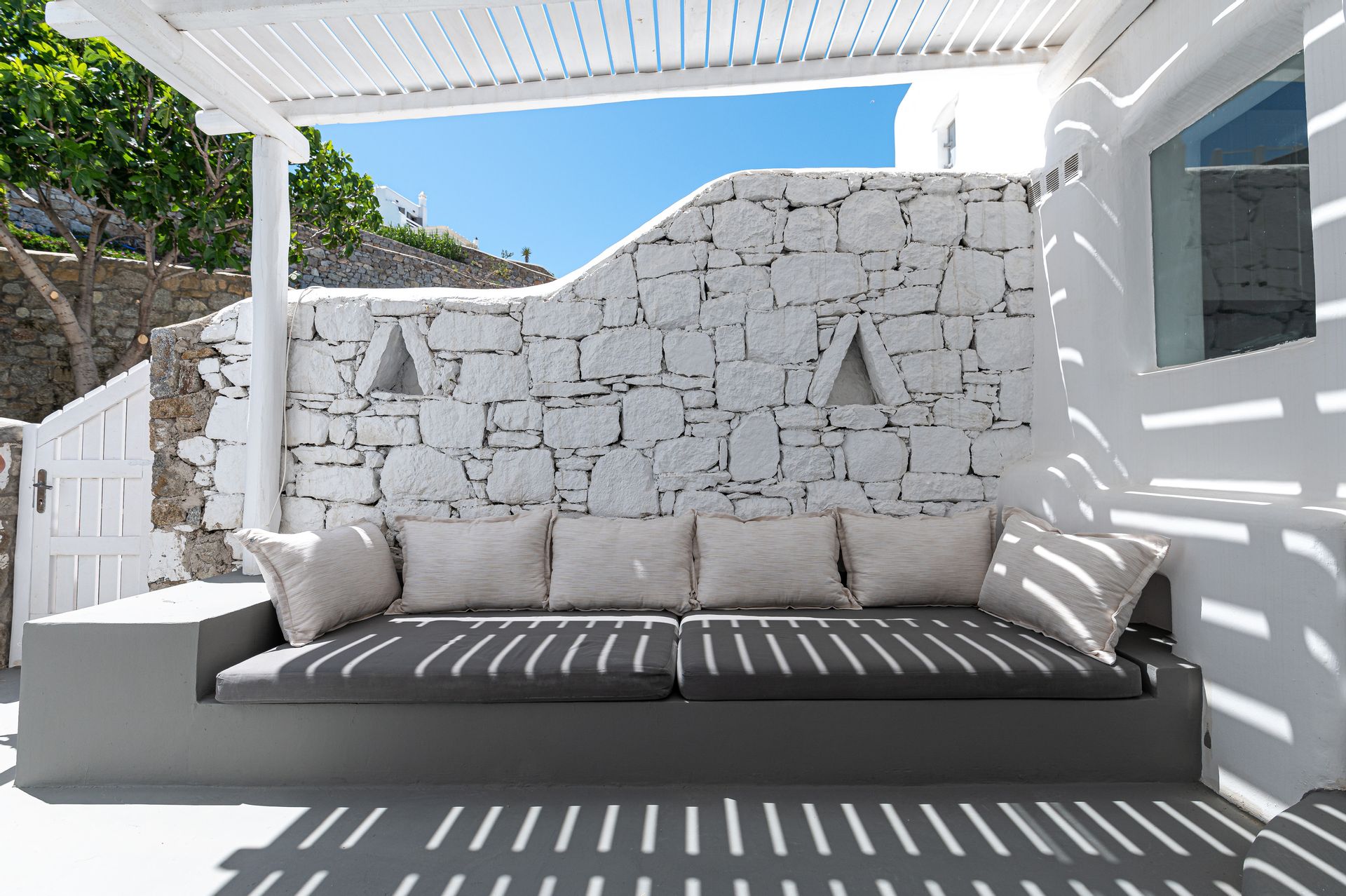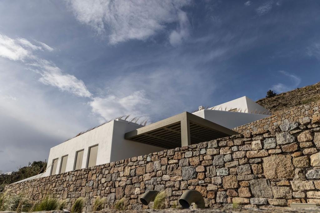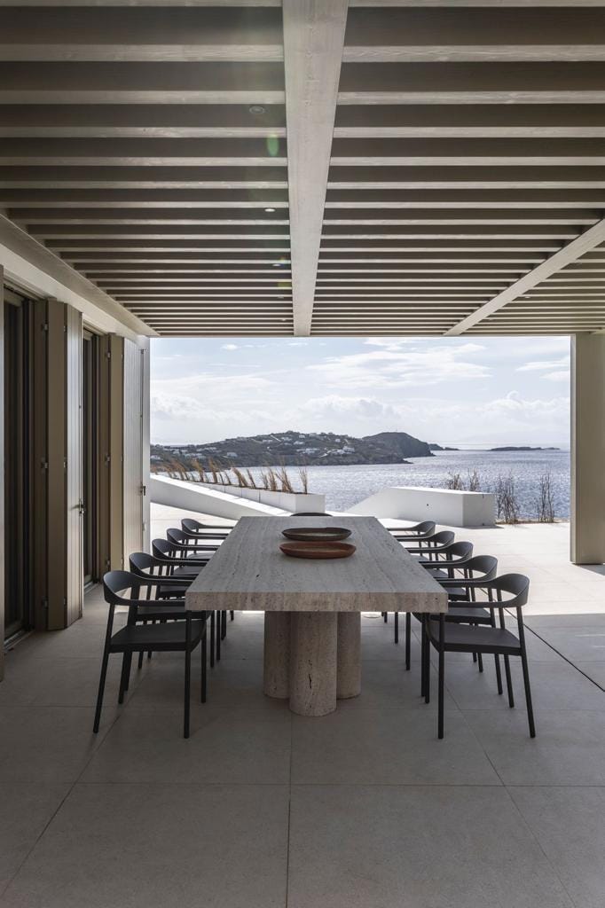 Outside, a vast expanse of land beckons, adorned with an inviting infinity pool that seemingly merges with the azure waters of the Aegean Sea. Adjacent to the pool, an enchanting grand dining area awaits, offering an idyllic setting for al fresco gatherings under the starlit sky. Here, you can revel in the captivating panoramic view of the bay, with the picturesque Delos island standing majestically in the distance, a timeless reminder of the region’s rich heritage.