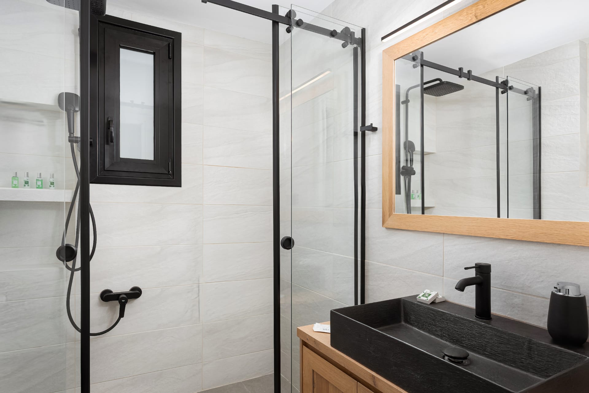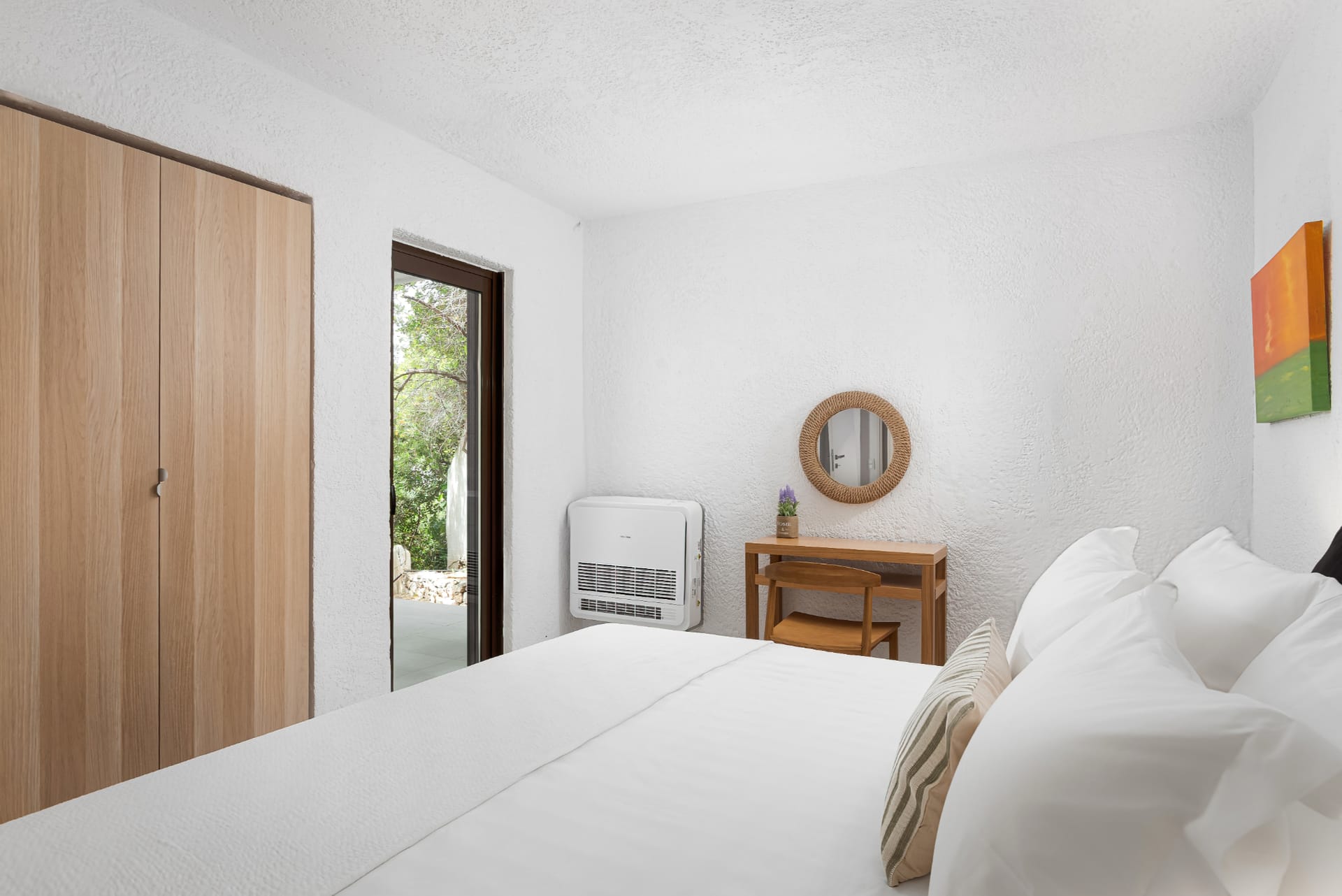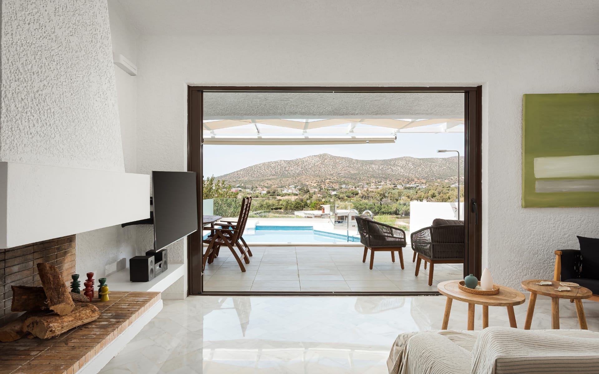 The true highlight of the villa lies outdoors. The private pool is set on a sun-drenched terrace with panoramic views of the Aegean Sea. The outdoor seating area, and BBQ facilities make it an ideal setting for laid-back afternoons or sunset dinners with family and friends. From the terrace, you can enjoy uninterrupted views of the lush landscape, sparkling sea, and sandy beach just a short stroll away.