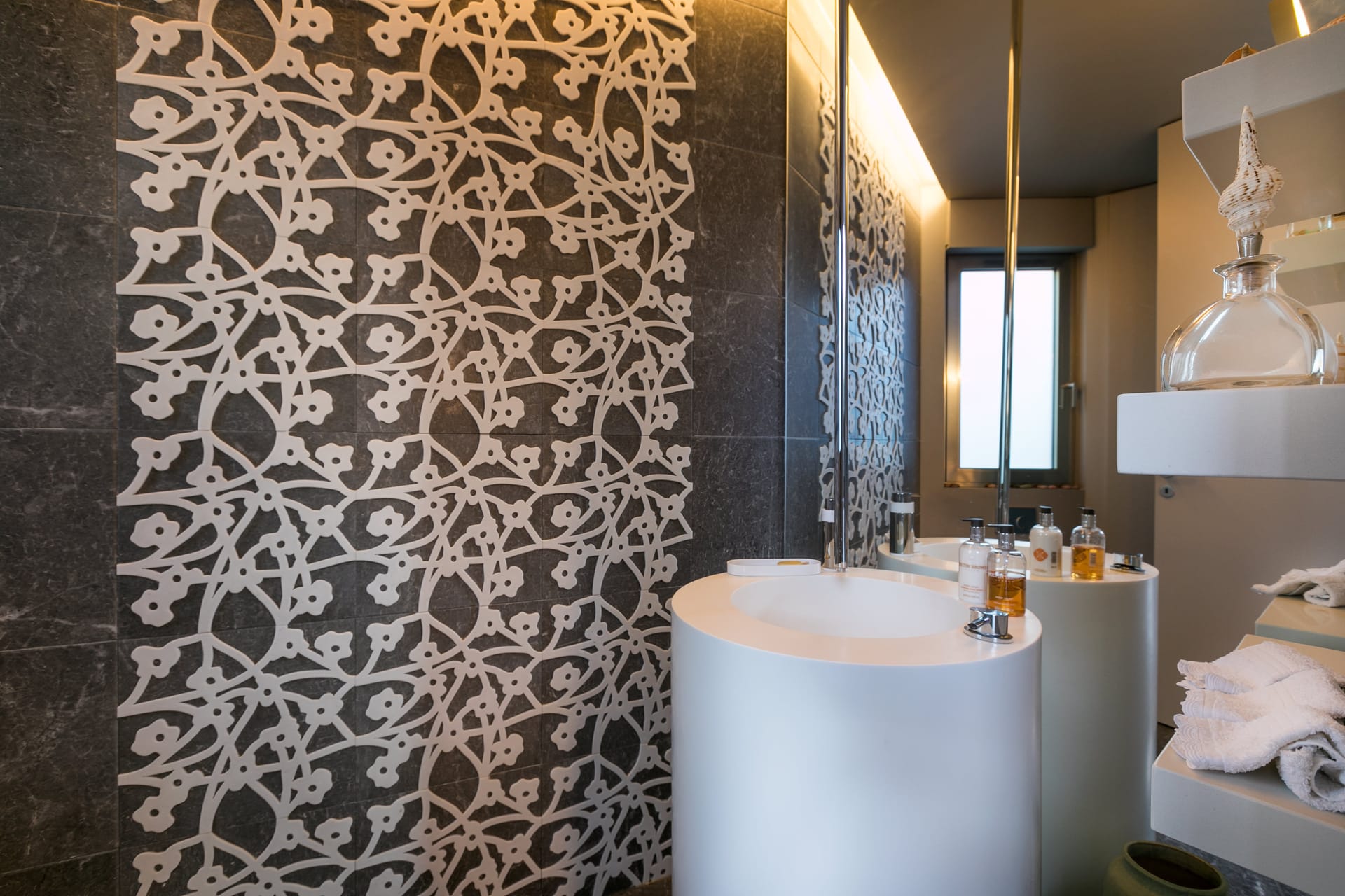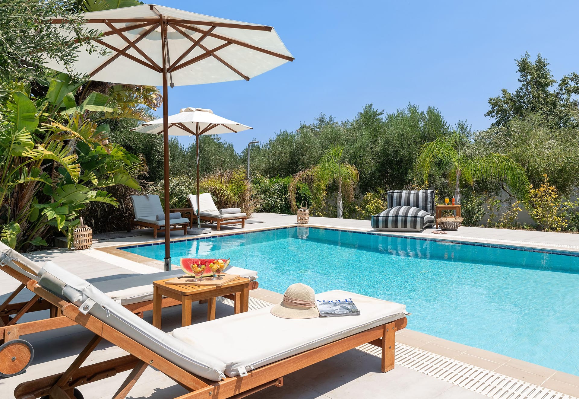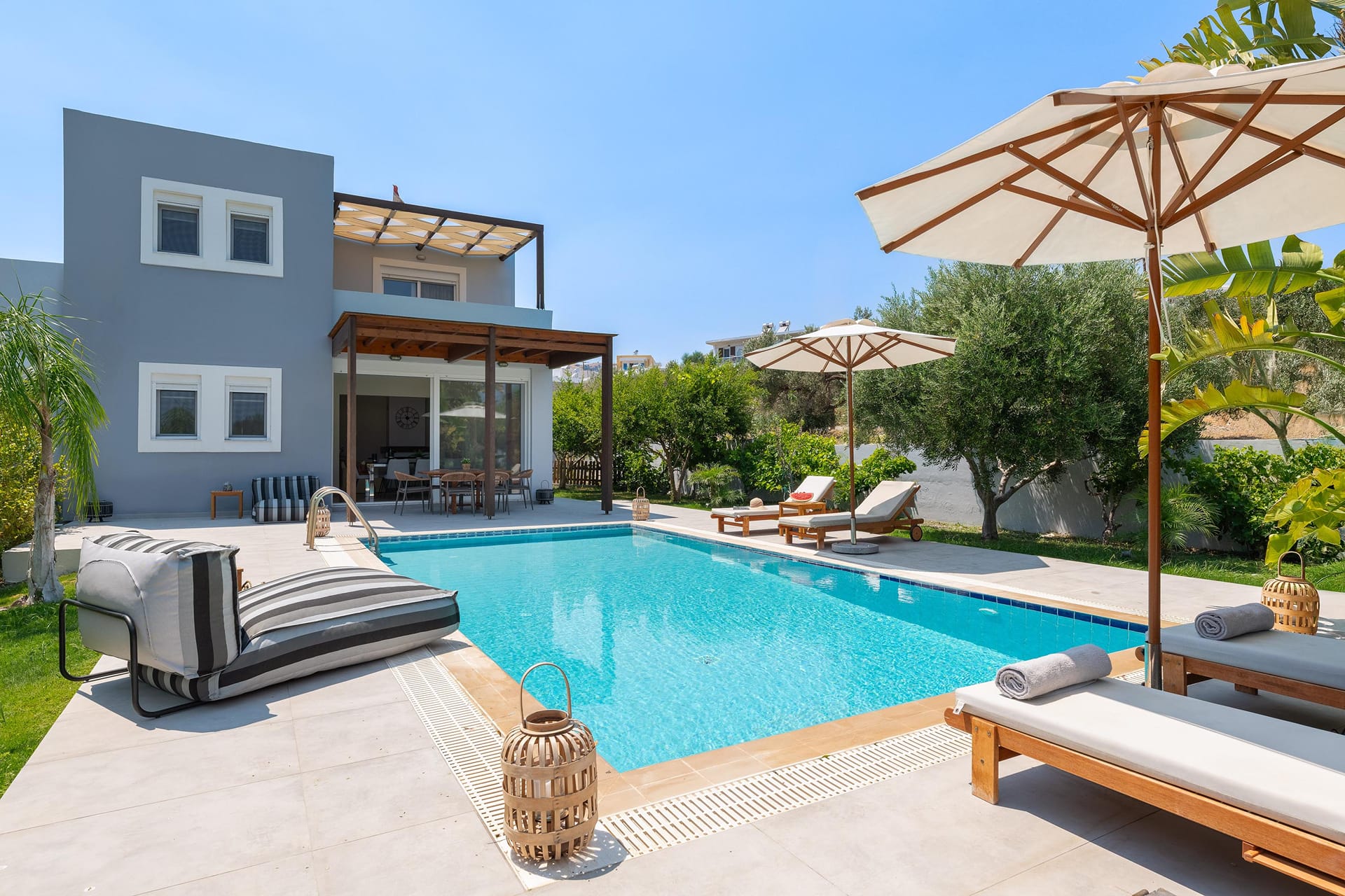 The outdoor terrace serves as the villa’s crown jewel. Here, you’ll likely spend most of your time. It features a sparkling plunge pool with views of the private garden, creating a peaceful and serene setting. Ample loungers and several al fresco dining areas allow you to fully enjoy the Greek sunshine. Large sliding doors connect the terrace to the indoor living spaces, merging outdoor and indoor luxury seamlessly.