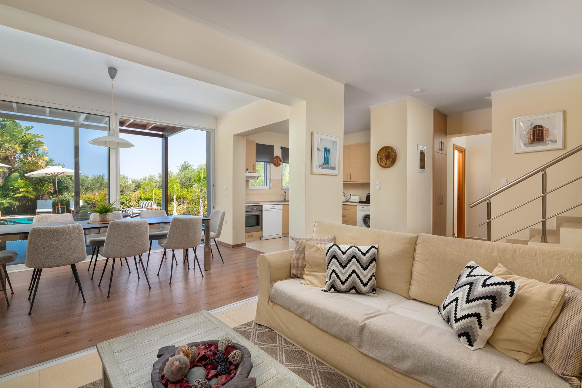 For early risers, the sunrises from the terrace are breathtaking, casting a magical glow over the serene landscape. With its blend of communal spaces for gathering and quiet corners for solitude, Villa Philoxenia is designed for ultimate comfort.