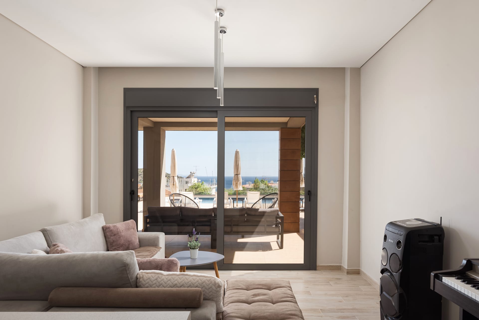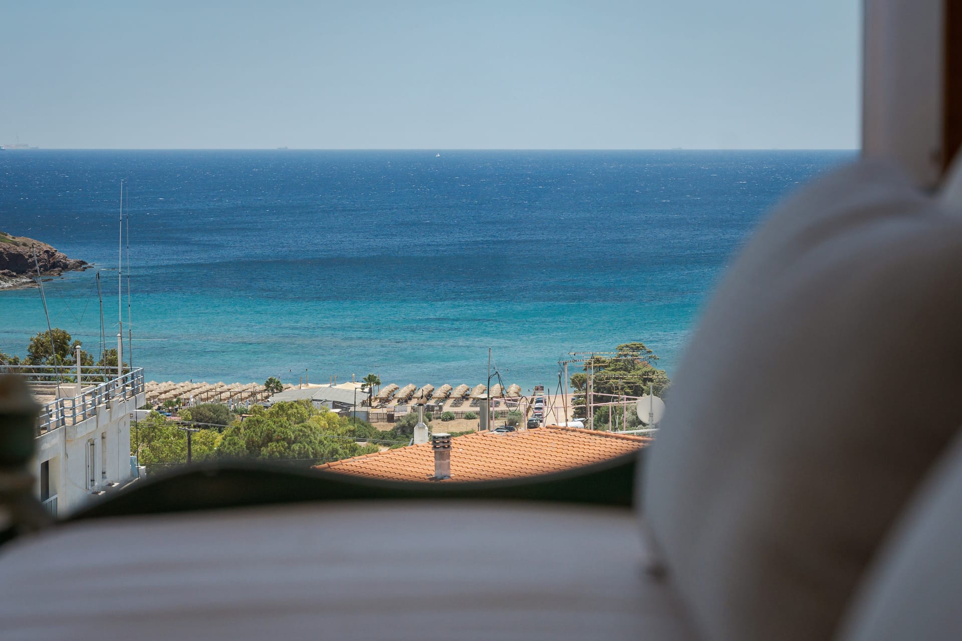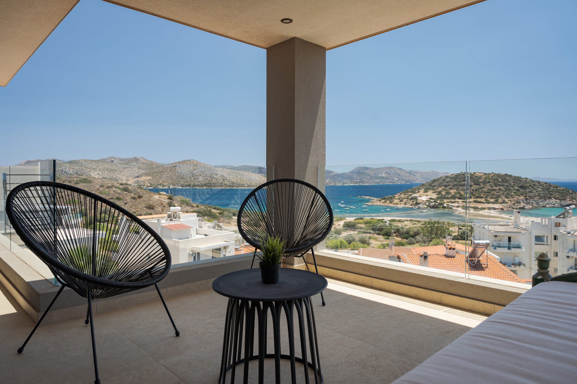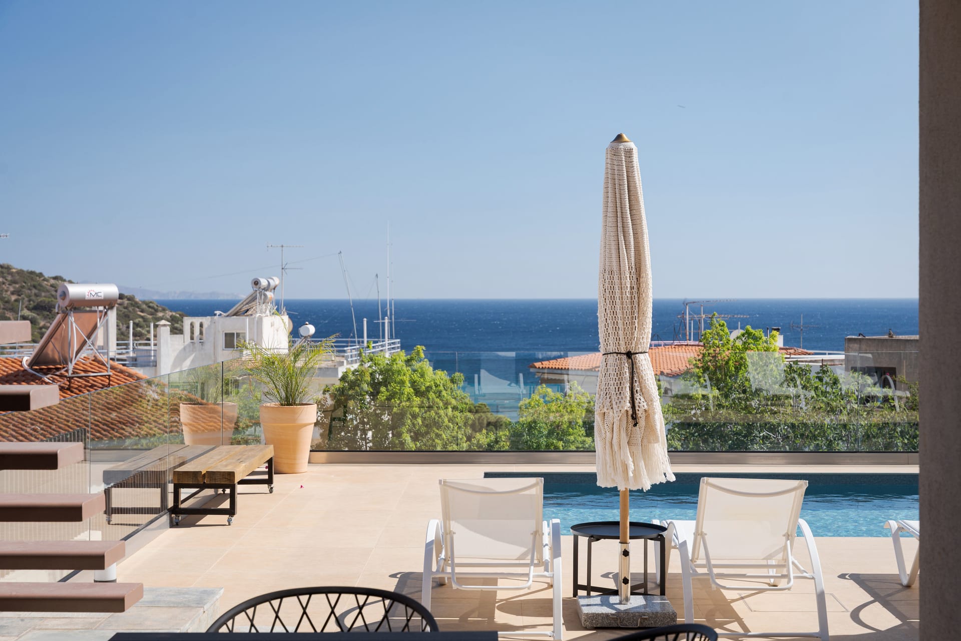 Outdoors, guests can enjoy a private patio ideal for dining or lounging in the sun, as well as a balcony that offers uninterrupted views of the coastline—an ideal spot for morning coffee or evening drinks. Whether you're cooling off in the pool, enjoying alfresco meals, or simply soaking in the calm atmosphere, every corner of Villa Nefeli is designed to elevate your stay.