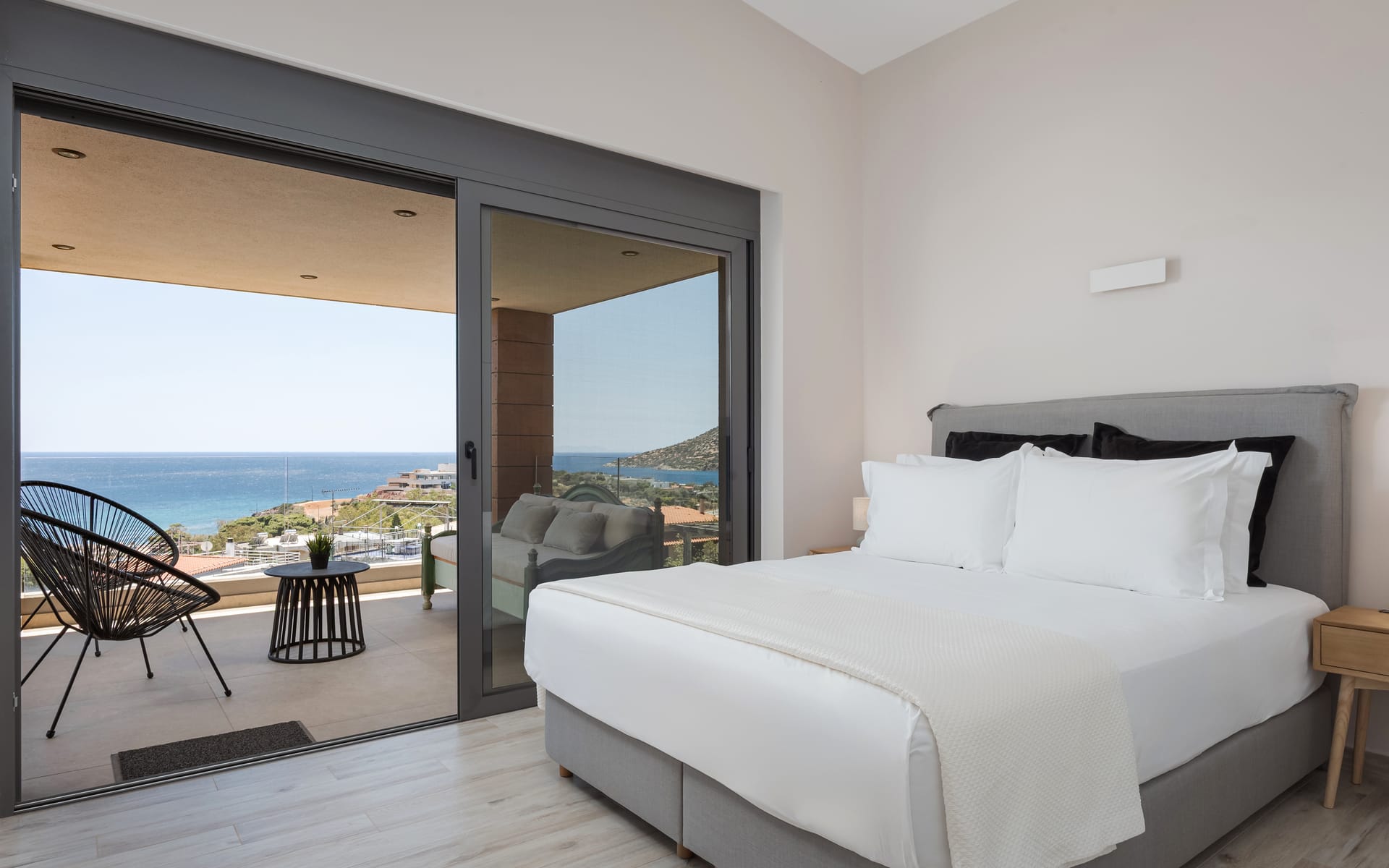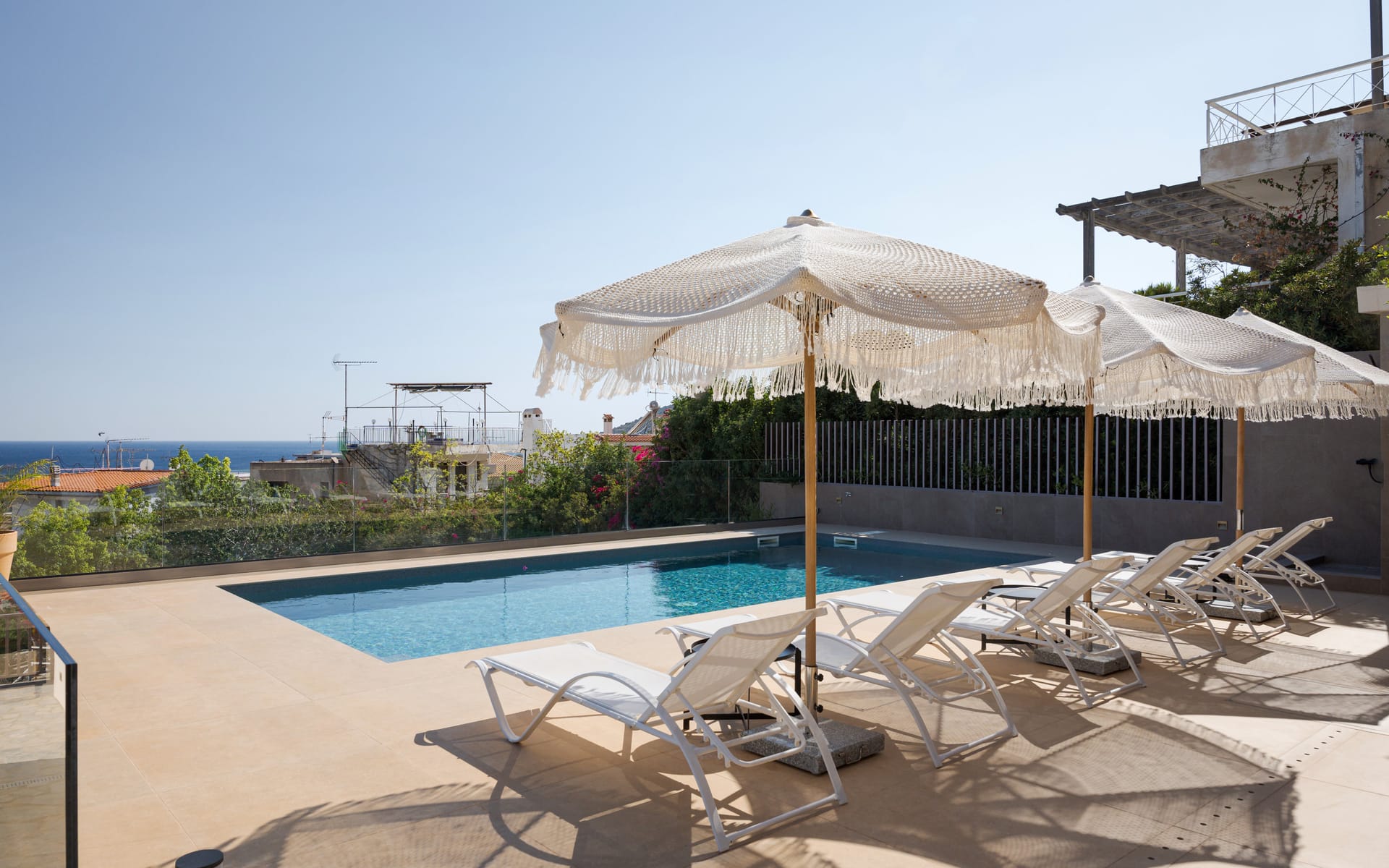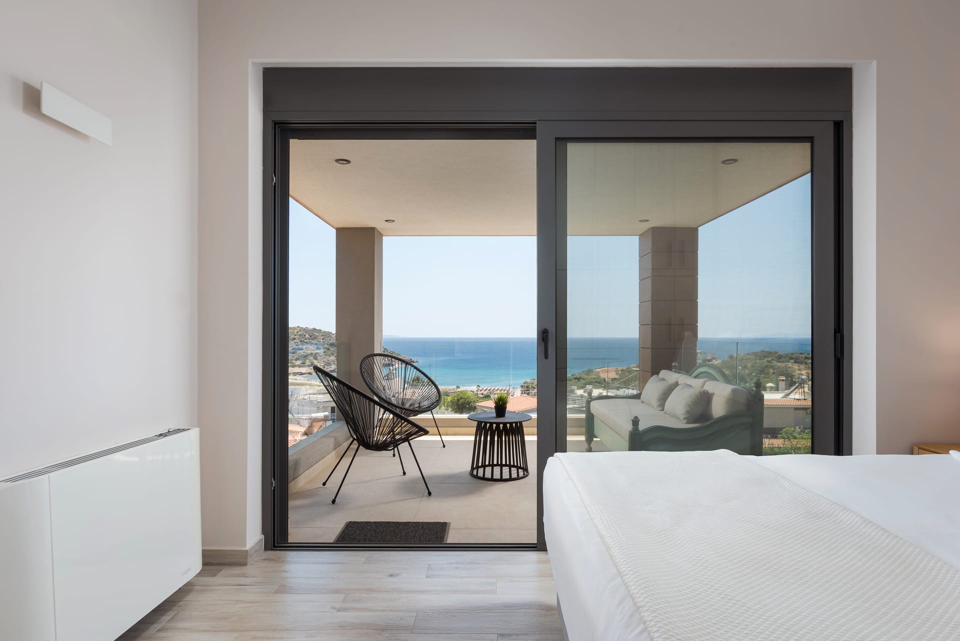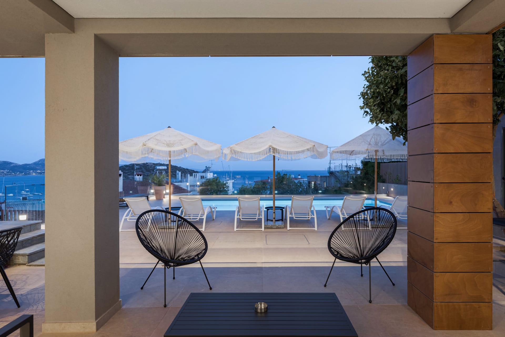 Outdoors, guests can enjoy a private patio ideal for dining or lounging in the sun, as well as a balcony that offers uninterrupted views of the coastline—an ideal spot for morning coffee or evening drinks. Whether you're cooling off in the pool, enjoying alfresco meals, or simply soaking in the calm atmosphere, every corner of Villa Nefeli is designed to elevate your stay.