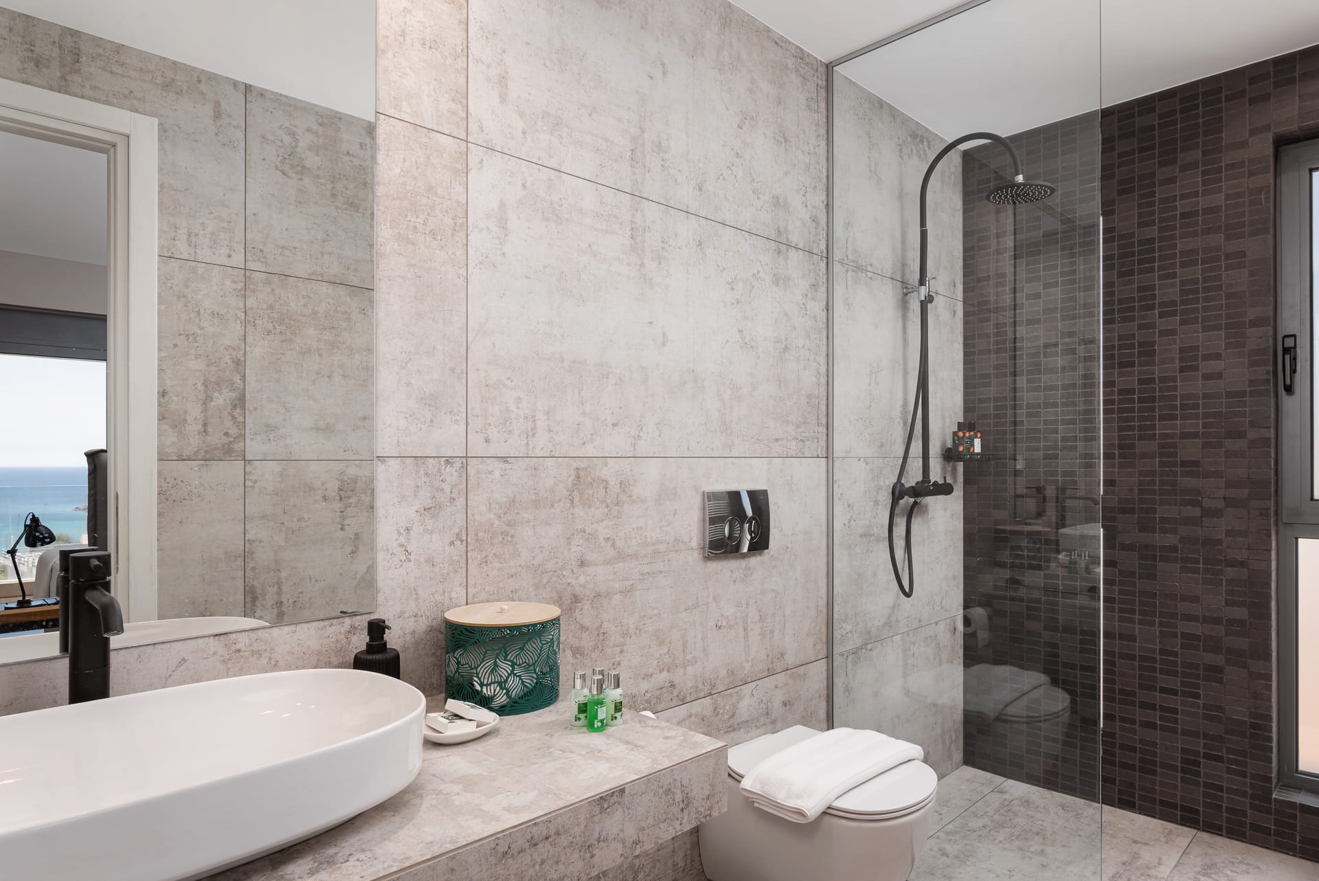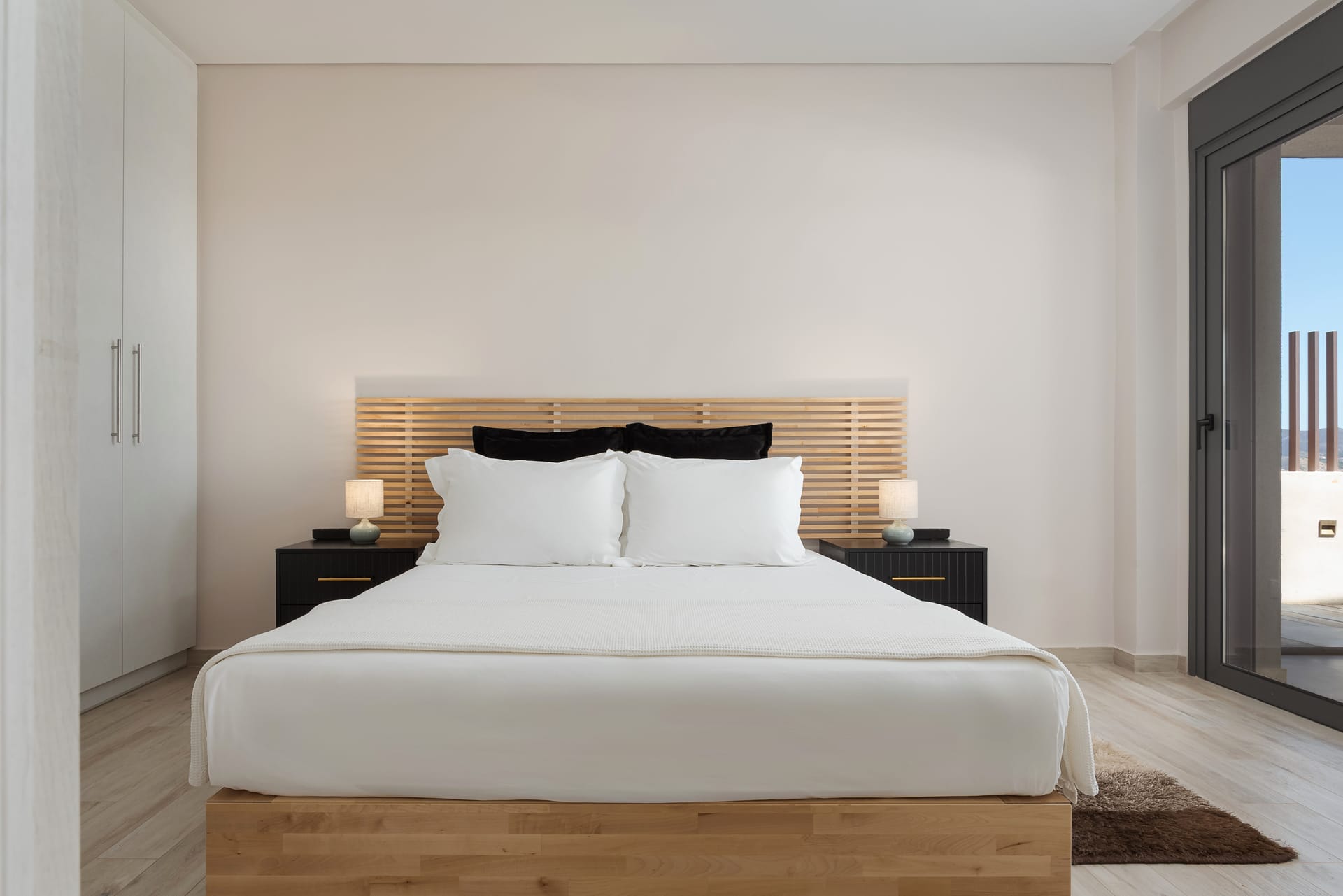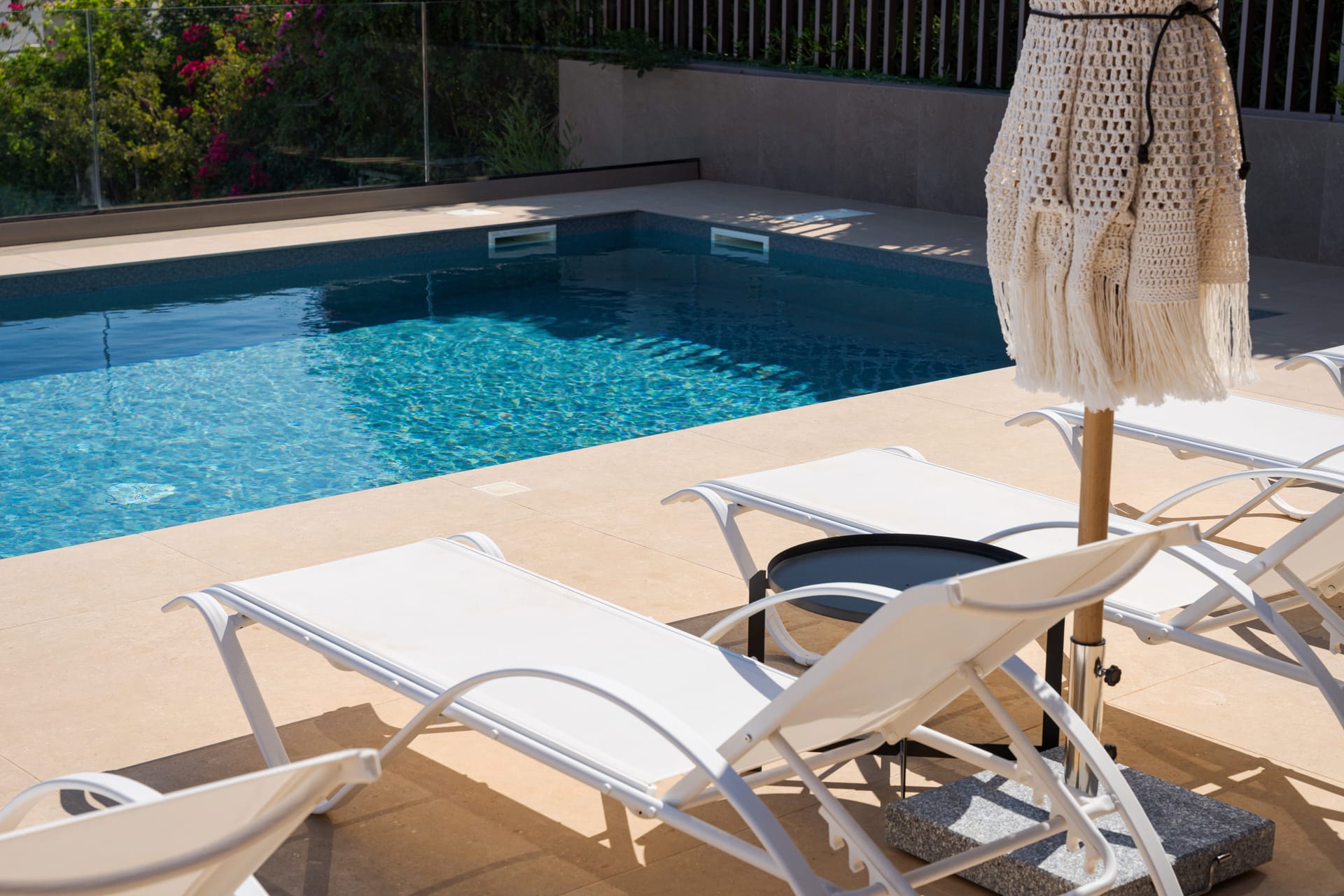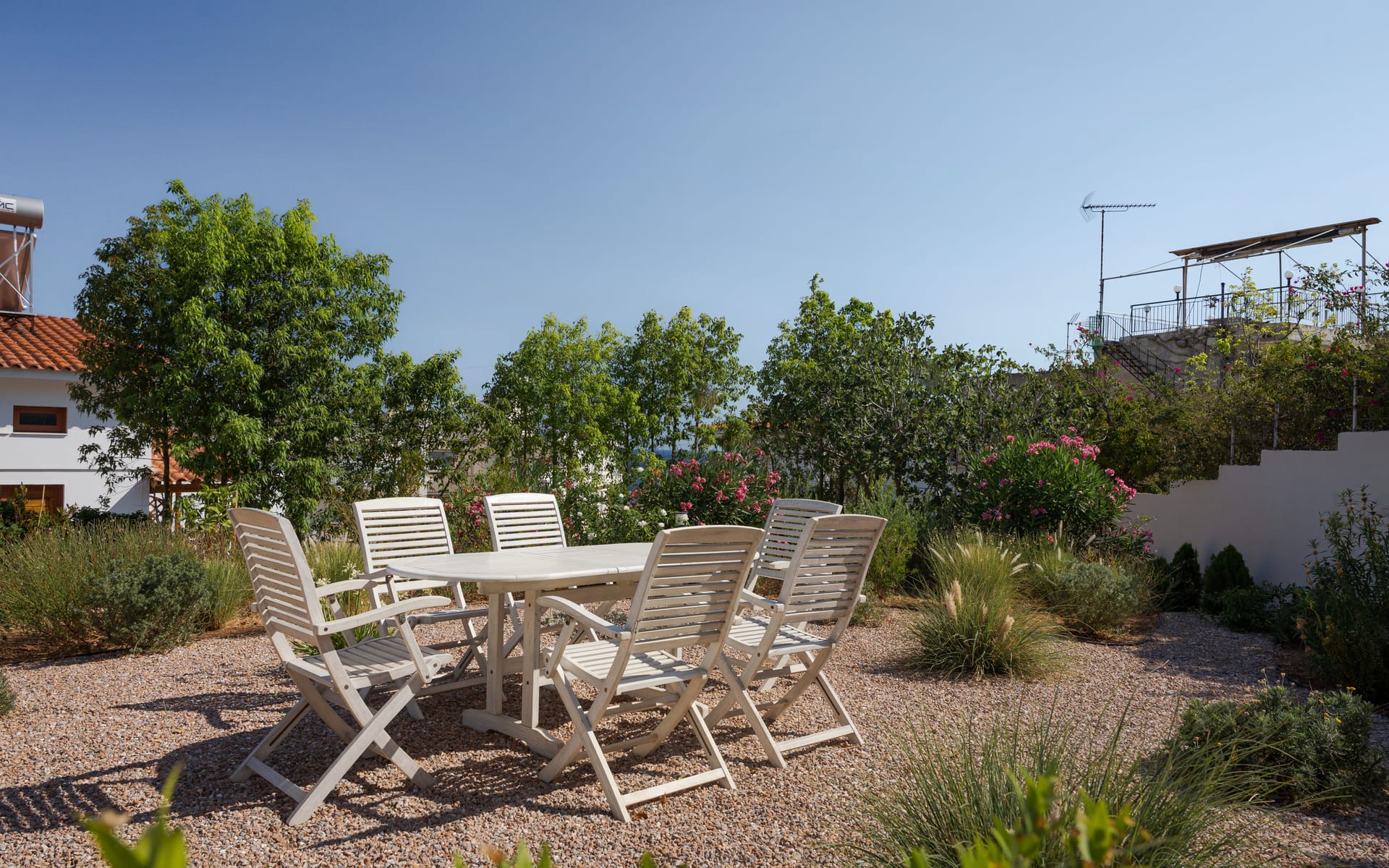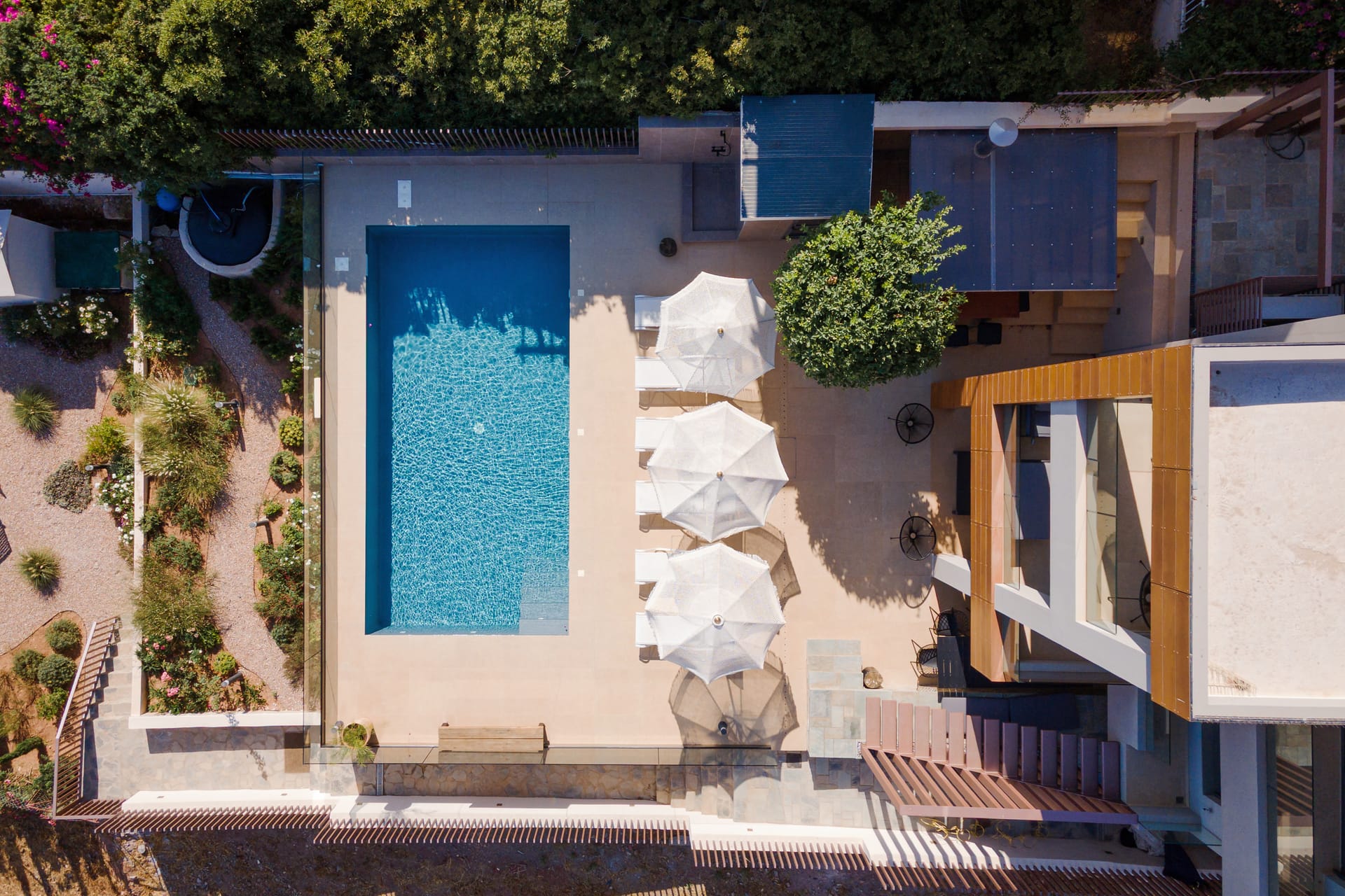 Outdoors, guests can enjoy a private patio ideal for dining or lounging in the sun, as well as a balcony that offers uninterrupted views of the coastline—an ideal spot for morning coffee or evening drinks. Whether you're cooling off in the pool, enjoying alfresco meals, or simply soaking in the calm atmosphere, every corner of Villa Nefeli is designed to elevate your stay.