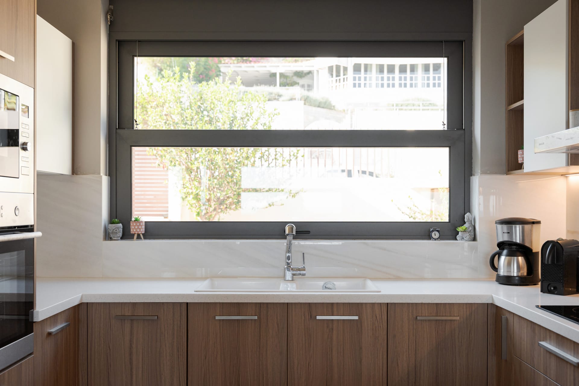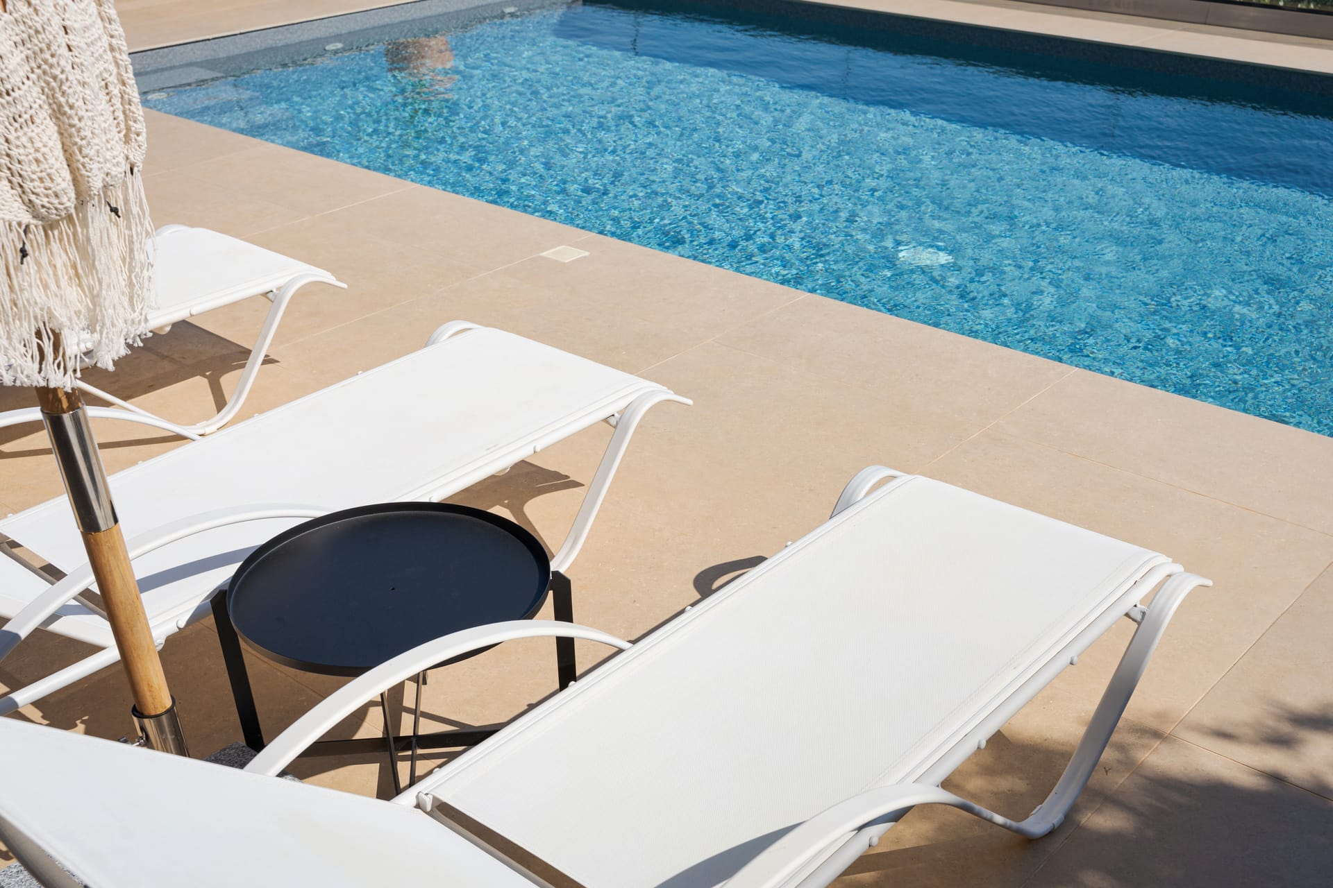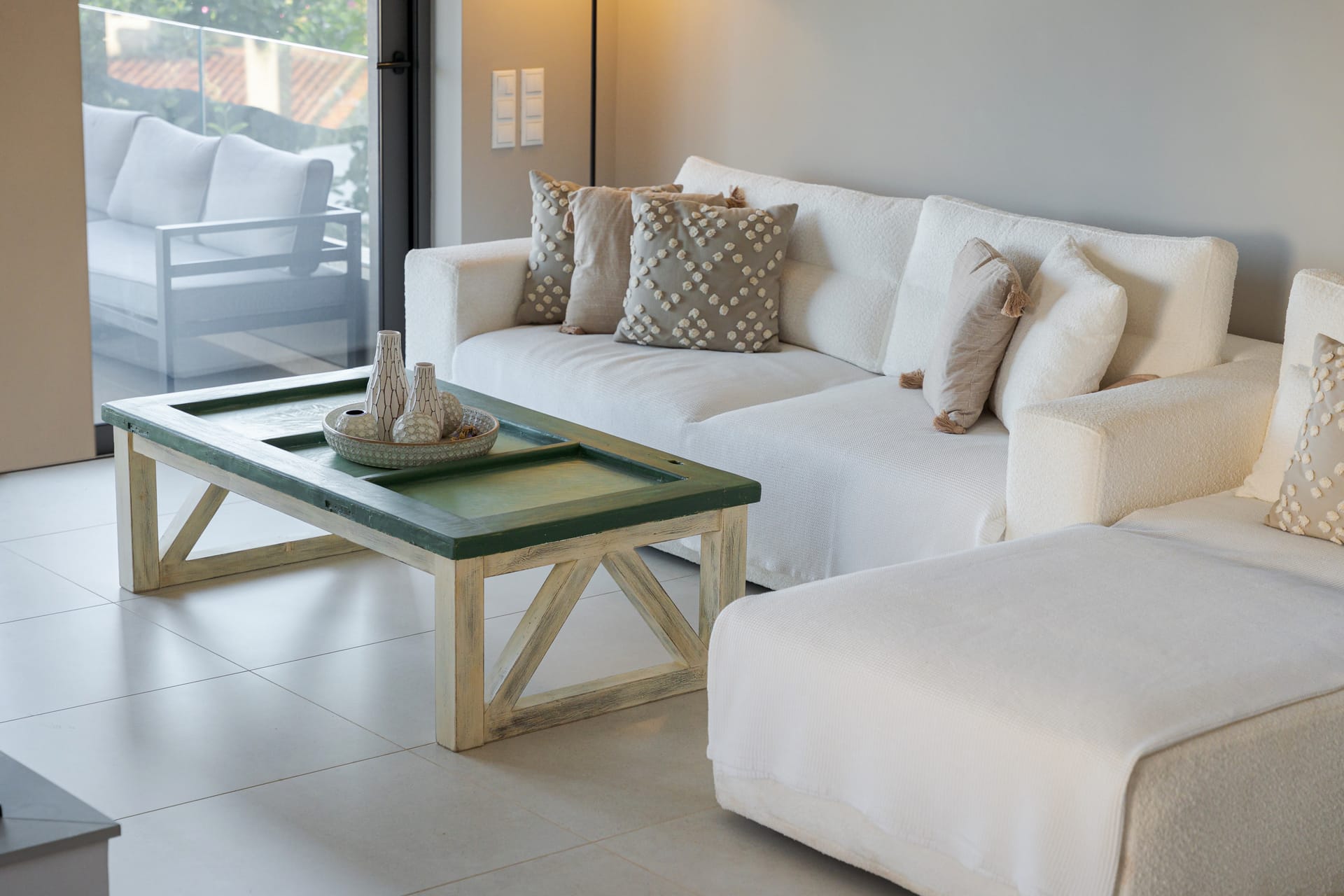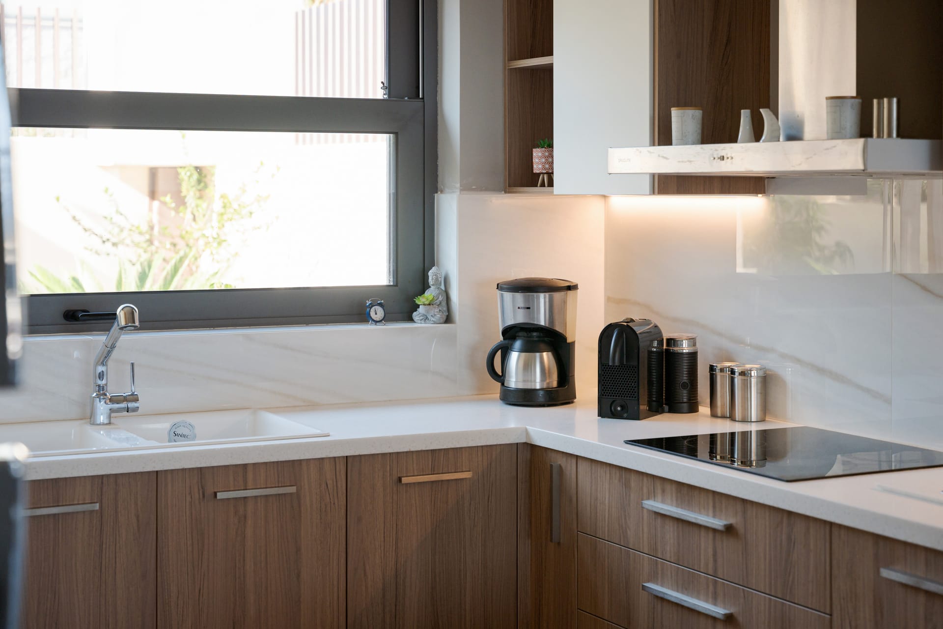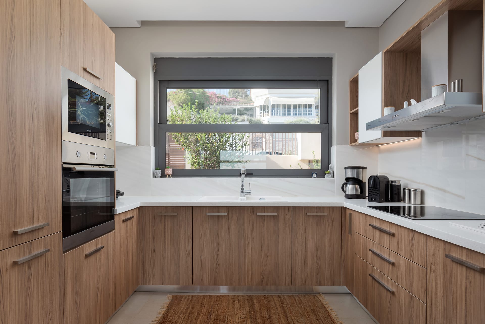 The spacious interior features two bright and inviting living rooms, ideal for relaxing or entertaining, along with two fully equipped kitchens designed to meet every culinary need. The villa offers four beautifully appointed bedrooms, each furnished with a queen-size bed, providing comfort and privacy for up to eight guests. An additional single sofa bed is available, allowing the villa to comfortably accommodate a total of nine guests. Five modern bathrooms ensure convenience for larger groups, with two bathrooms offering en-suite access for added comfort and exclusivity.