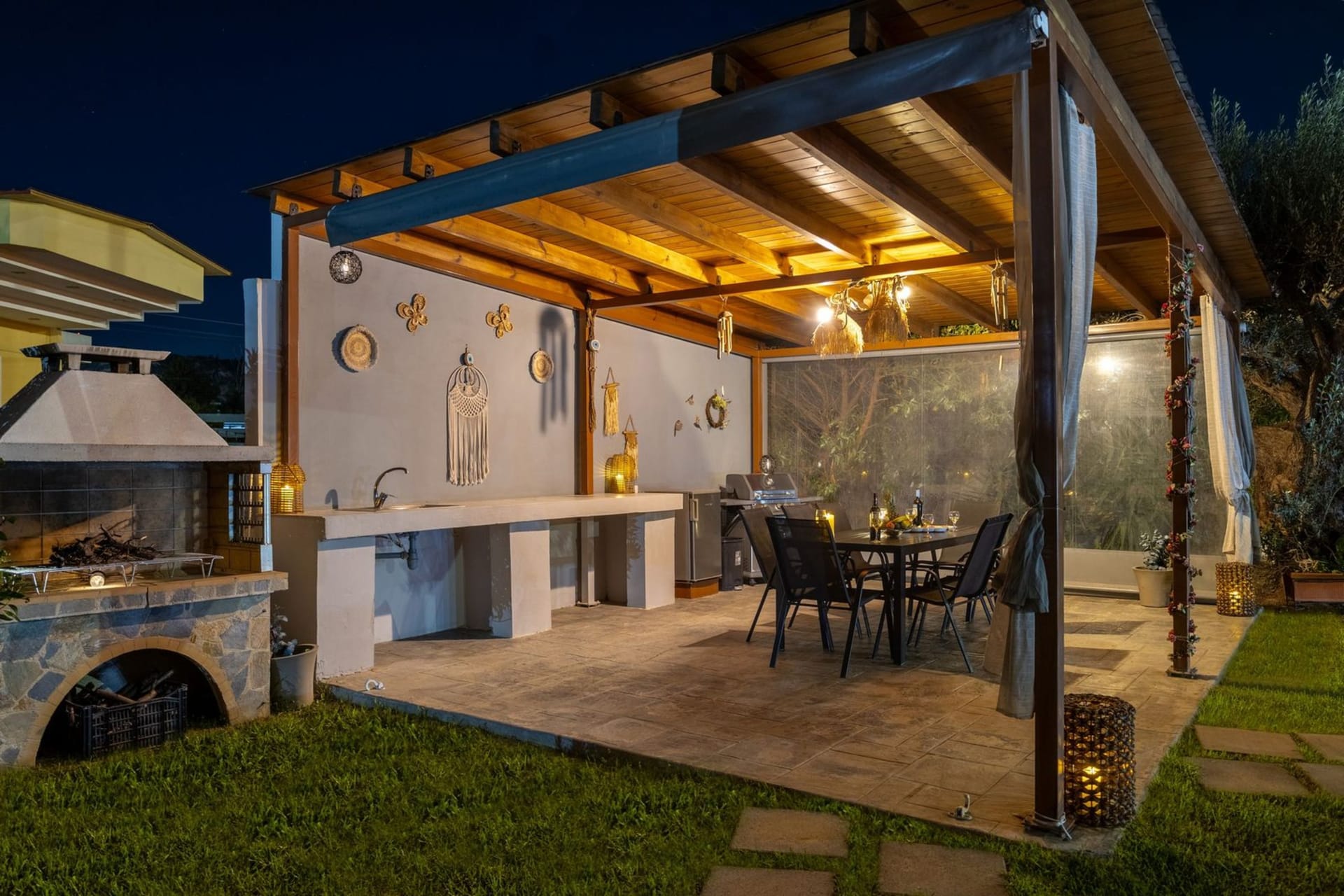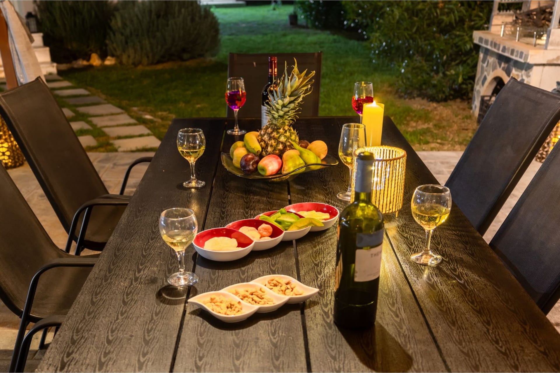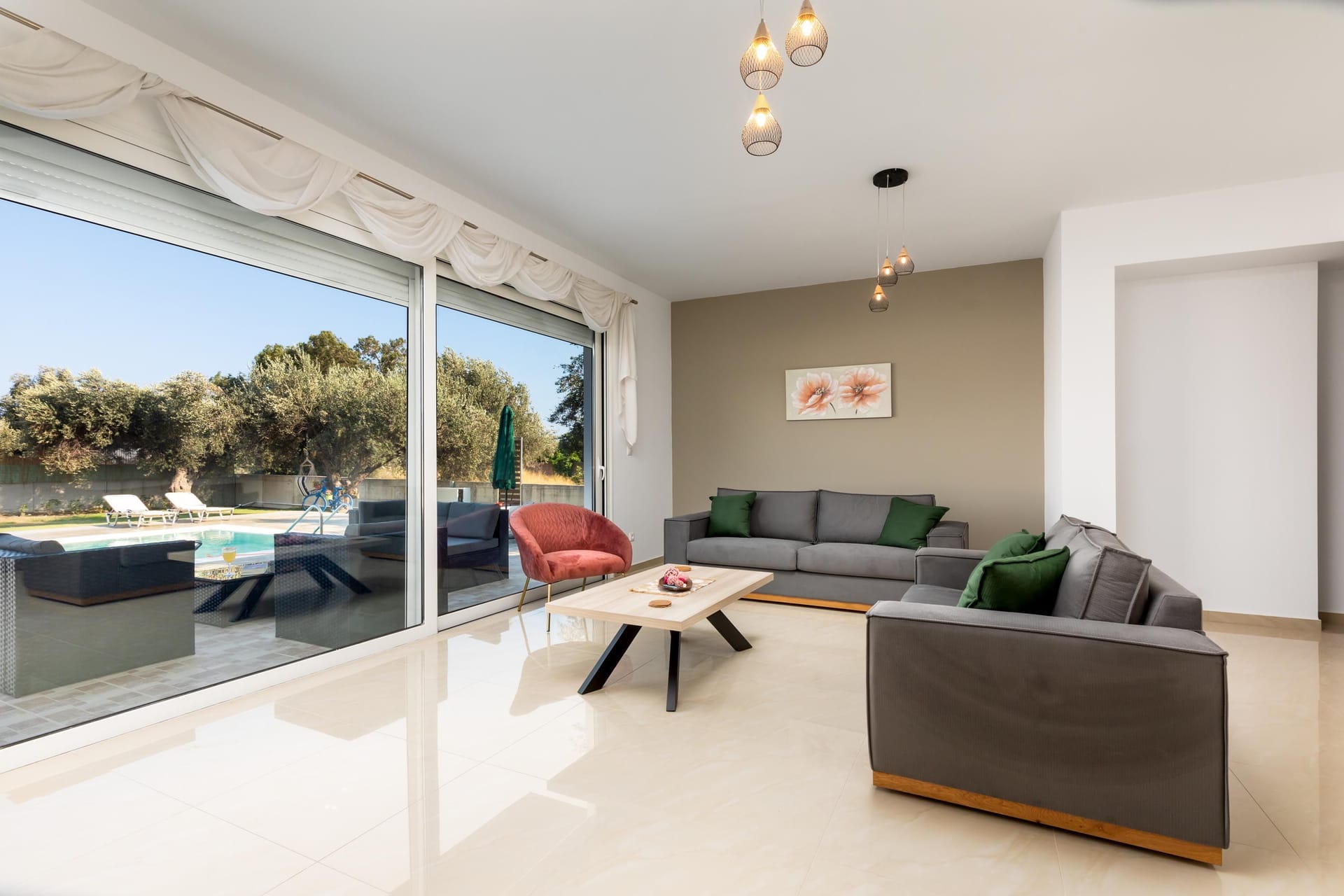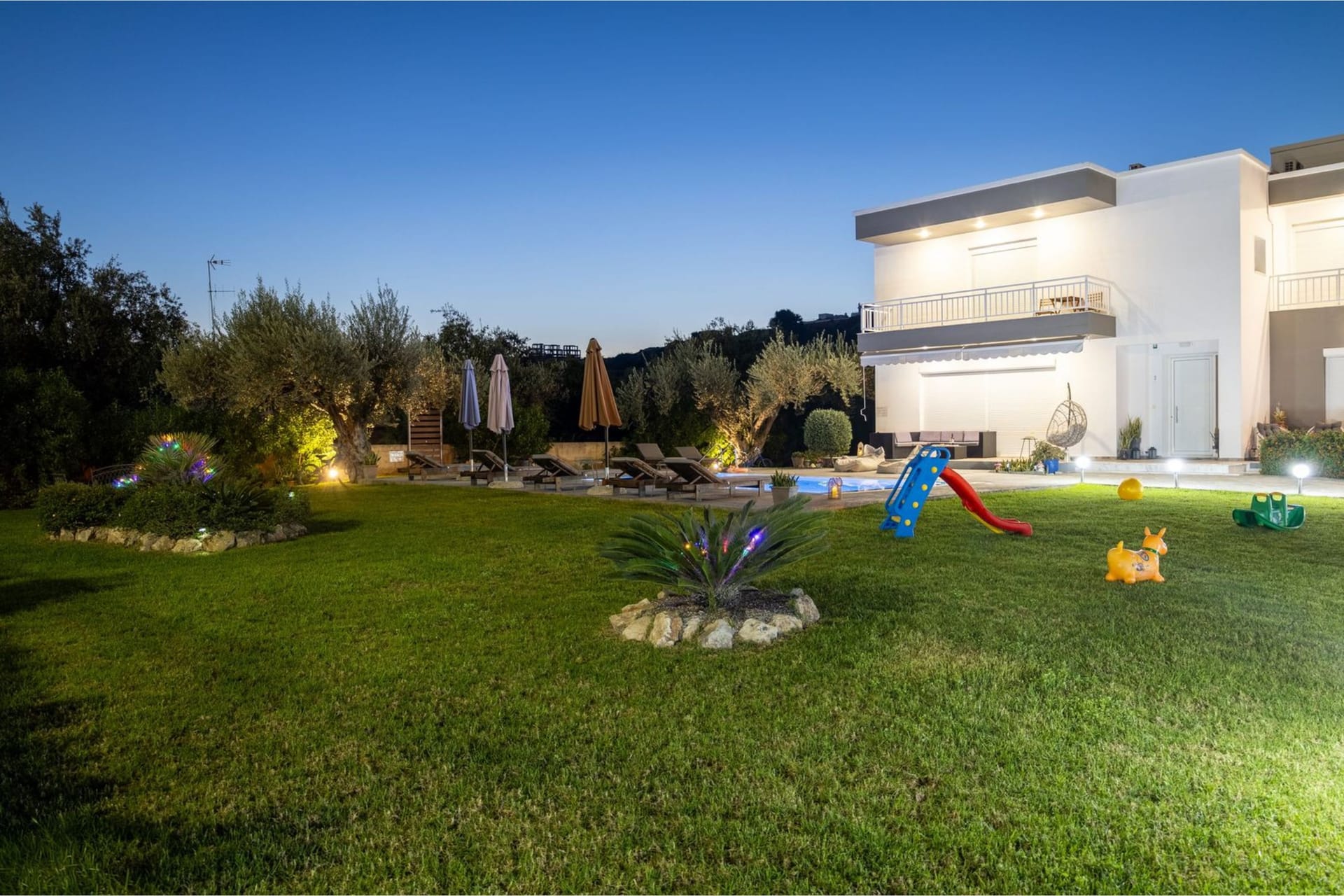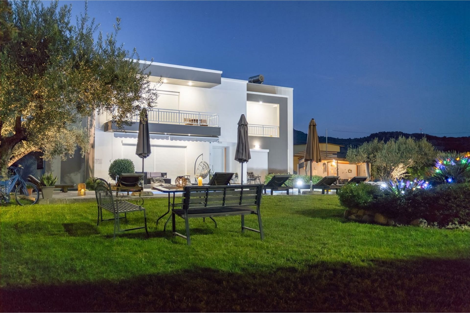 Villa Darcy is surrounded by tasteful landscaping and traditional Cycladic architecture. Located on a 4 acres piece of land, planted with olive trees and other local plants. The stunning sea views complete this breathtaking landscape offering the guest a unique experience. The ground natural incline, offers privacy and unobstructed views.