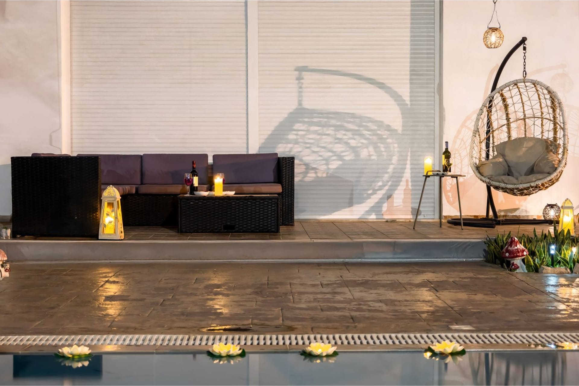 In the outdoor pool level there is a large swimming pool with sun beds and shaded lounge area, a BBQ, a bar and an alfresco shaded dining area.