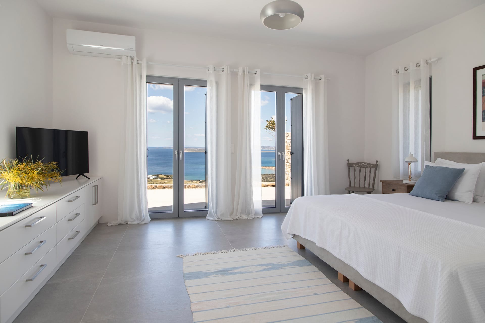 Together the villas consist of 11 bedrooms all spread on different levels of each house. Fiona I offers 3 master en-suite bedrooms on the ground level. Each main floor bedroom has stunning views of Sykinos, Antiparos and Folegandros as the villa faces south and also with terrace space outside the bedrooms. There are two more master, en-suite bedrooms, on the lower level. One more bedroom with twin beds that can be converted to double, with the bathroom being located on the lower-level grounds. Between the two properties is the staff quarters, completely separated.