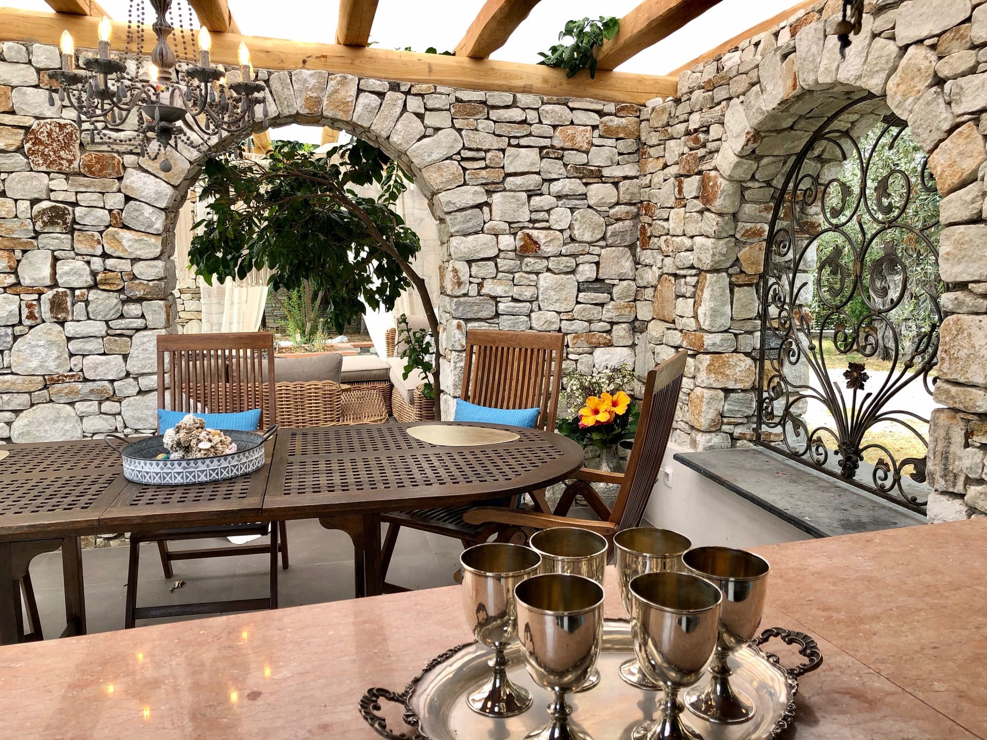 · one more kitchen outdoors in the marble stone pergola area lush aromatic gardens .