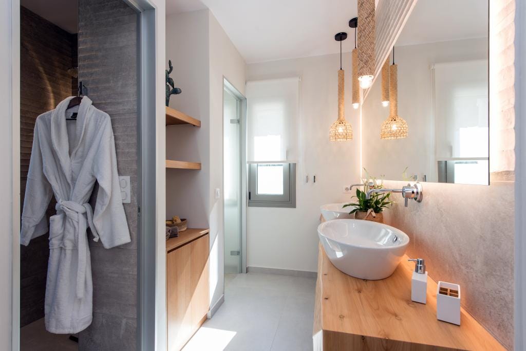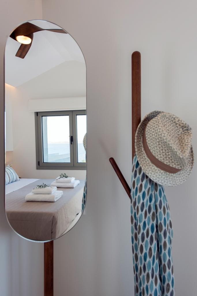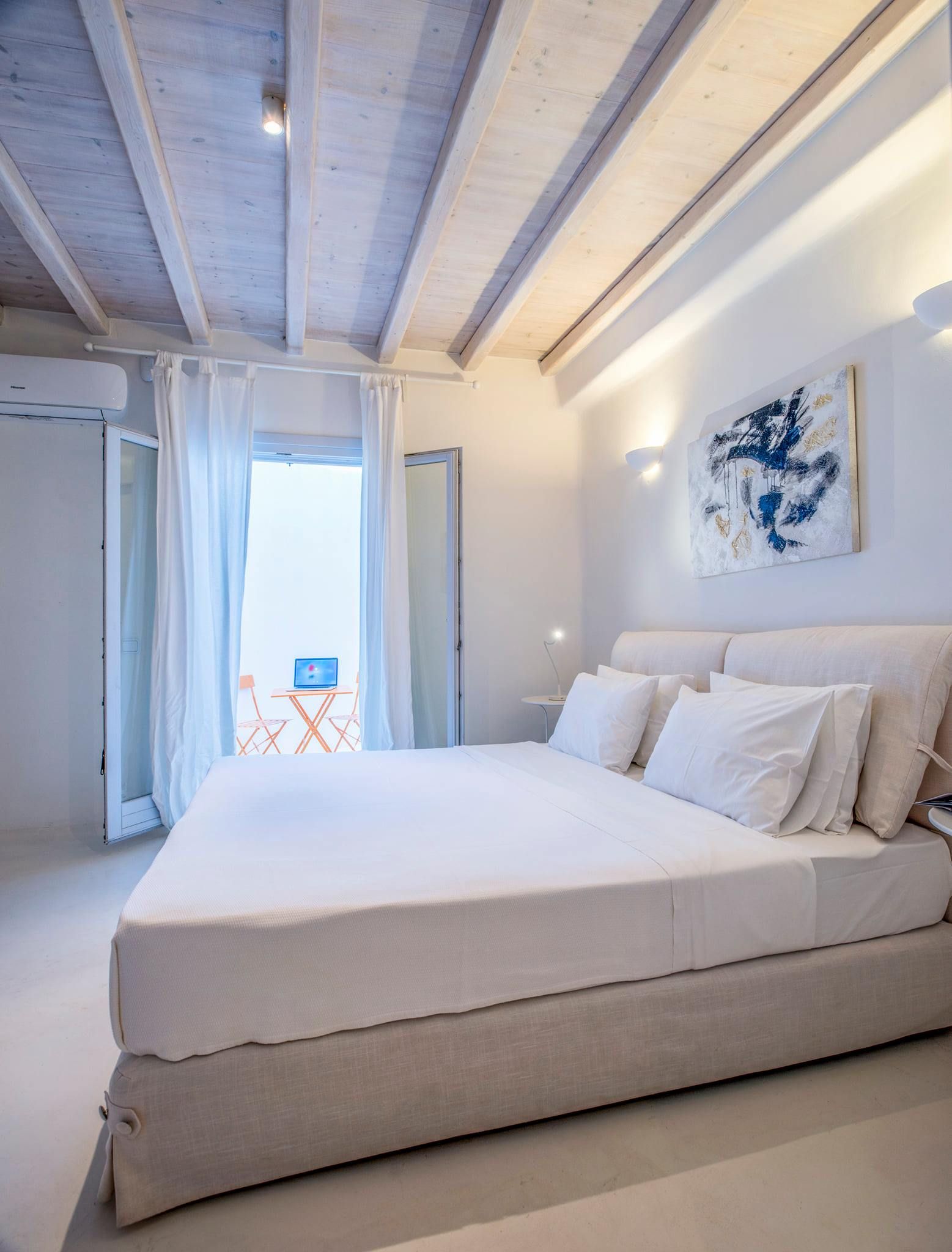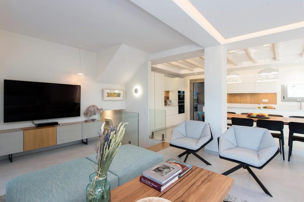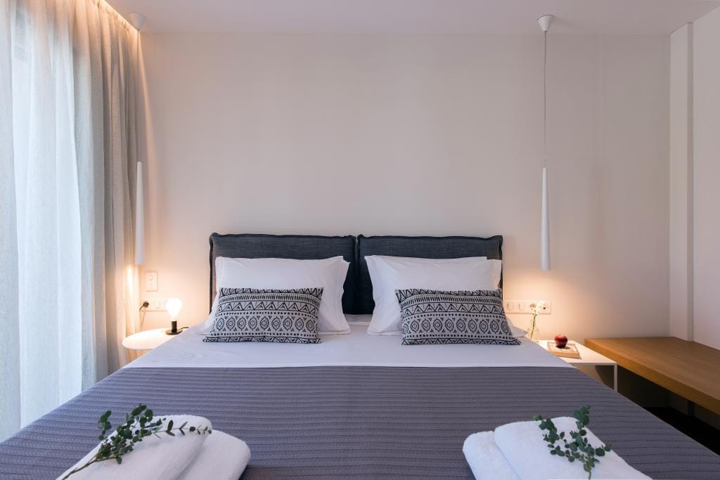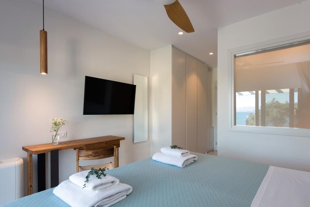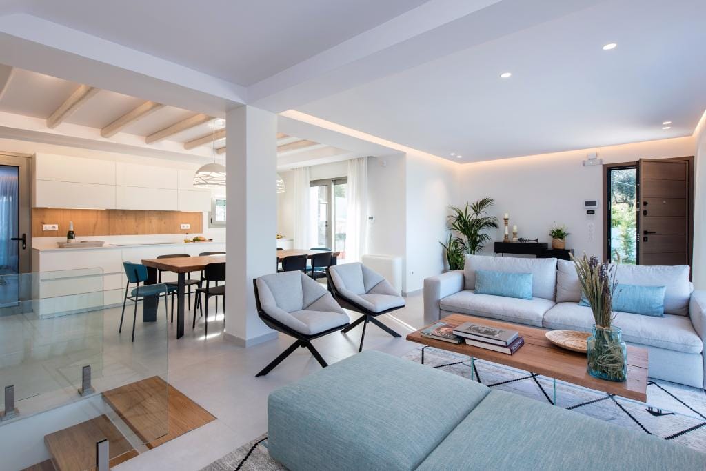 Costelle Villa is simply and minimally furnished and decorated in a way to create a cool and modern vibe throughout the house, ideal for a vacation of absolute relaxation. The villa features a large beautiful living room and open plan kitchen, three spacious bedrooms, including one family room, a bathroom and an amazing outside yard with a stylish swimming pool. In the common areas, the contemporary style in decoration along with the tall ceilings create a sensation of infinite space. Large French windows allow the sunlight to shine through the rooms and reflect naturally to the pale silverish tones on walls and furniture. All bedrooms follow the simple yet elegant decoration and form an amazing space of comfort, enticing even the most demanding guest to lay down and indulge in an unprecedented state of relaxation. A luxurious bathroom completes this elegant scenery, ideal for the vacation of a lifetime.