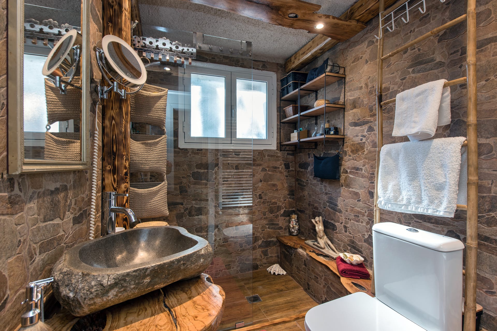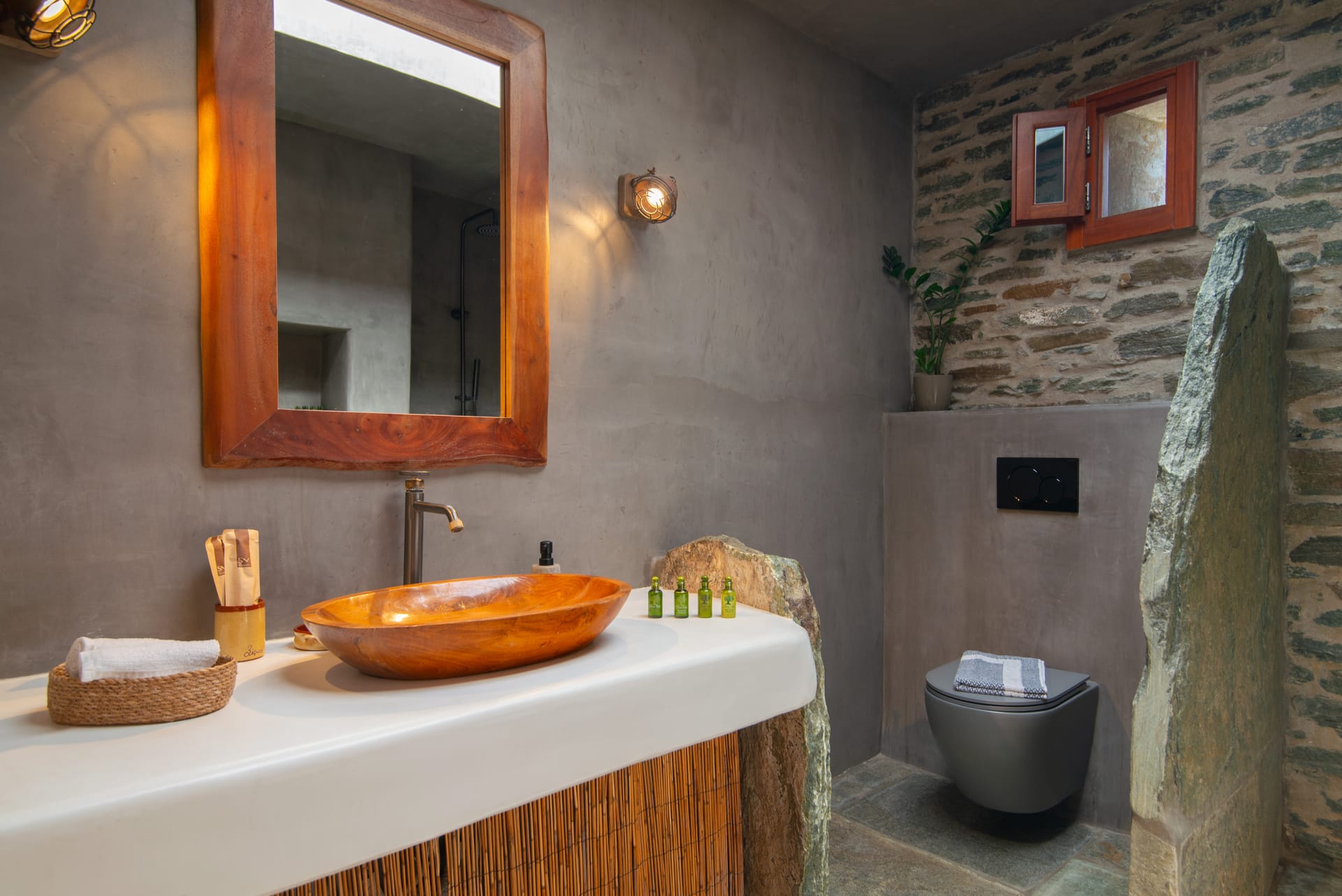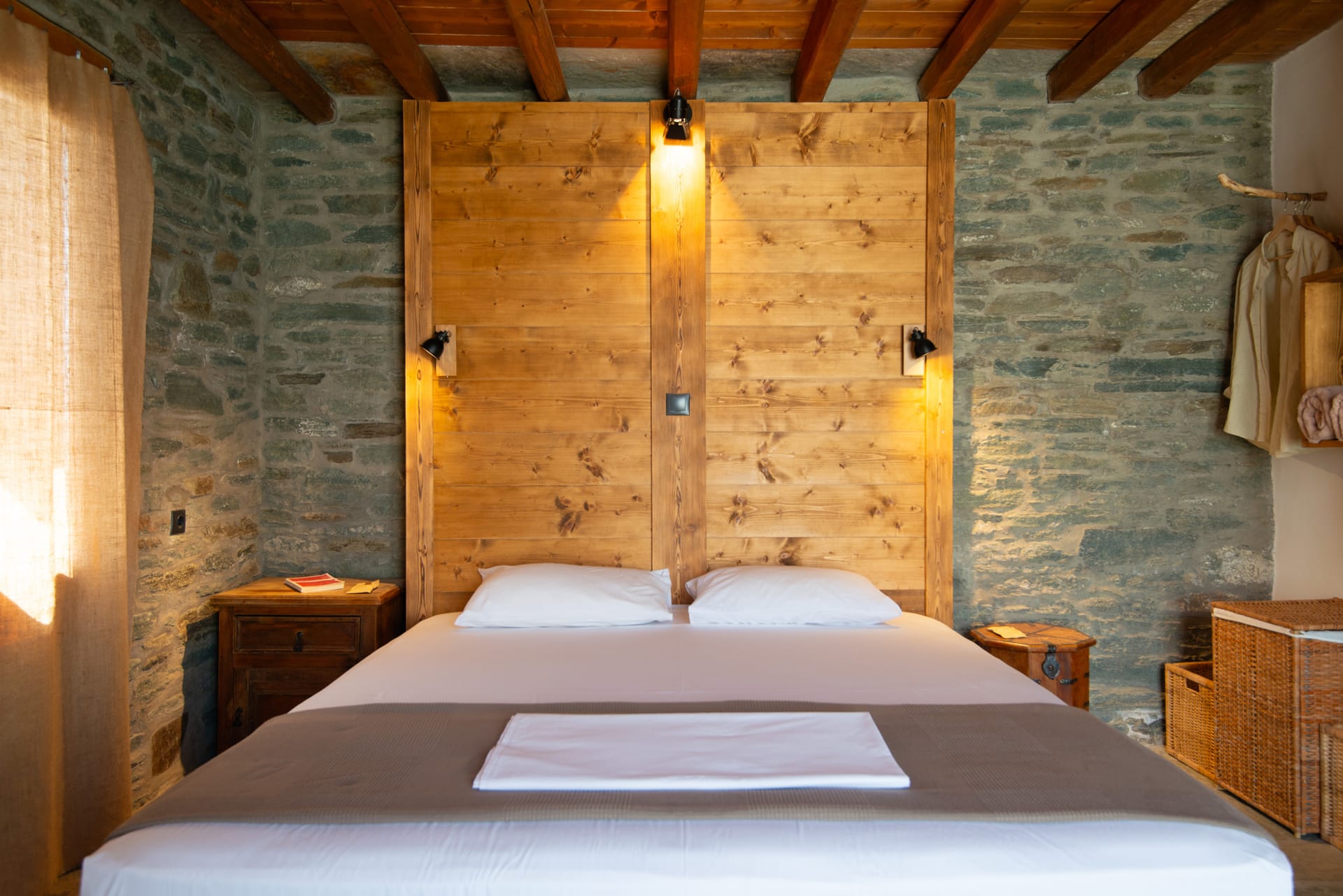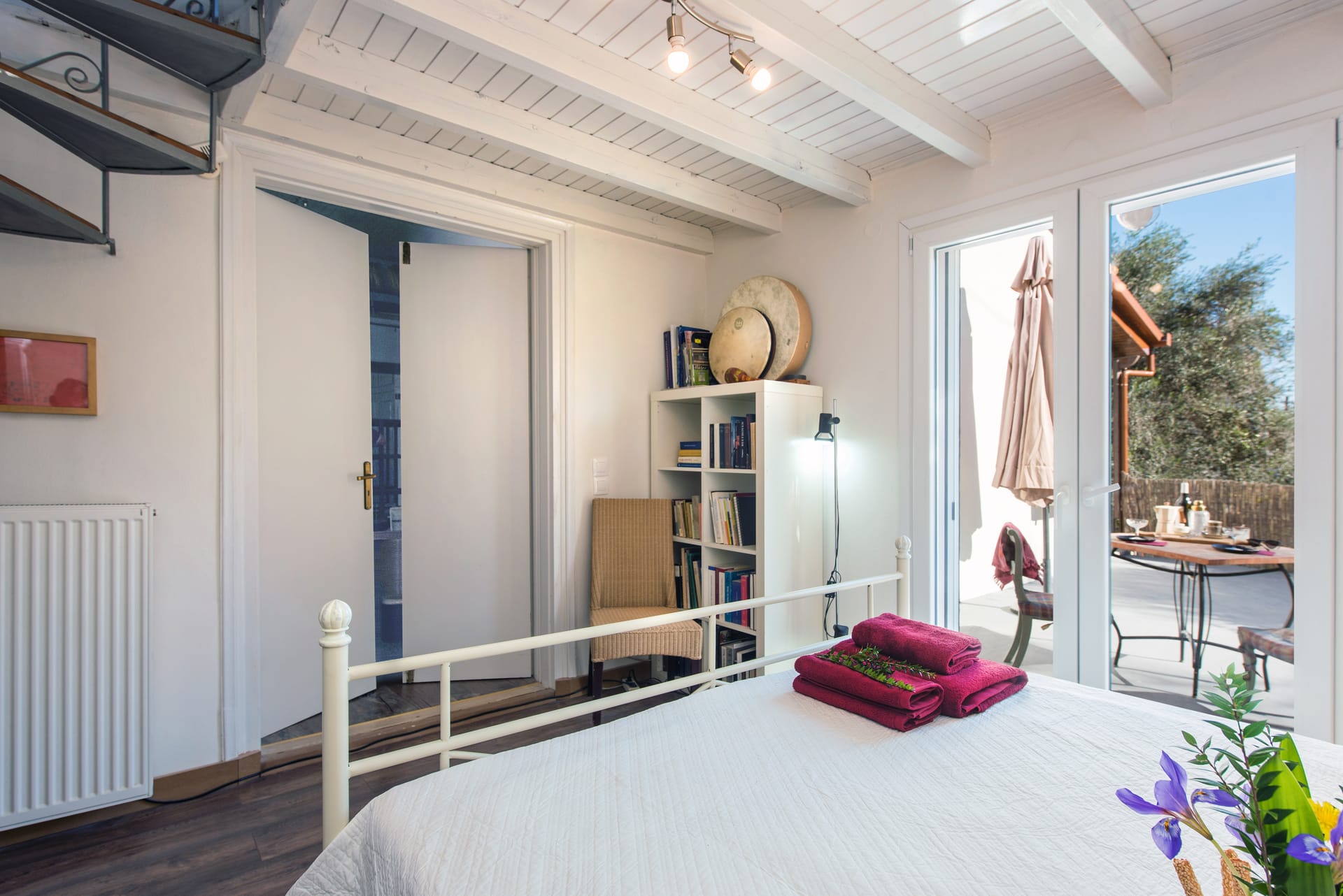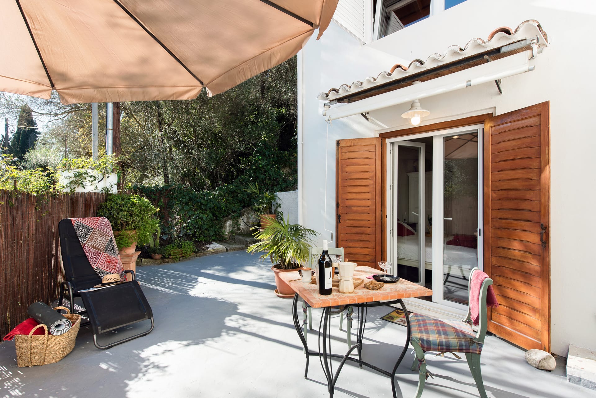 Wooden shutters frame the windows, casting dappled patterns of sunlight onto the weathered stone patio where guests can relax and unwind in the shade of olive trees.