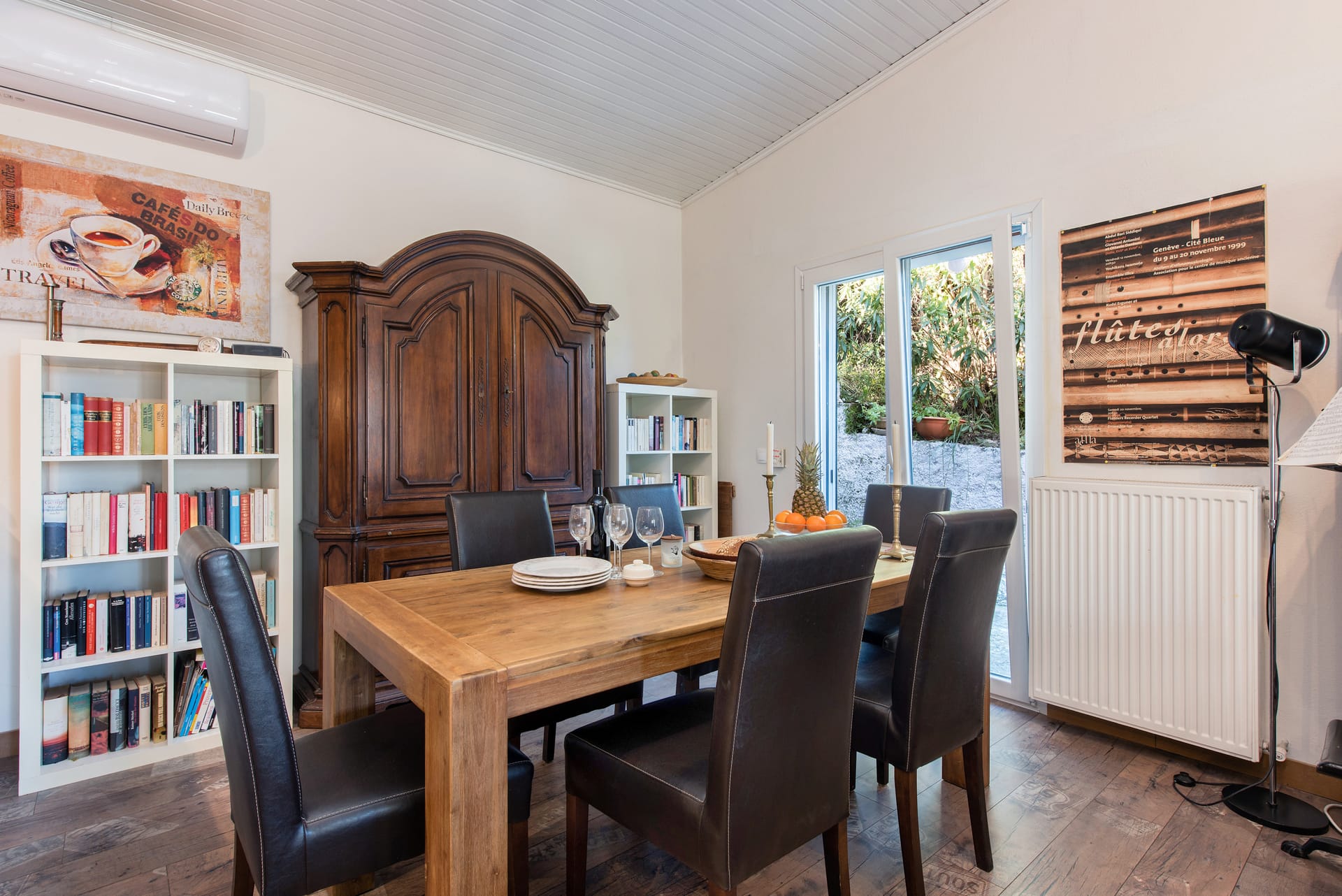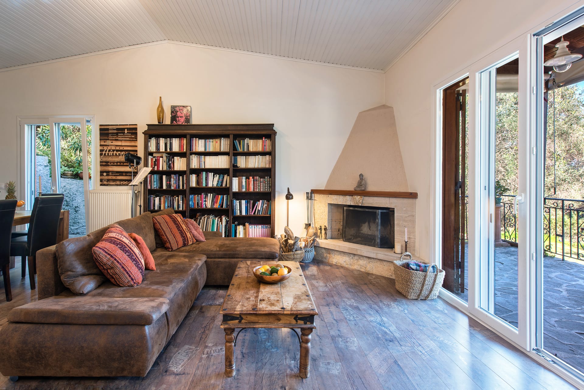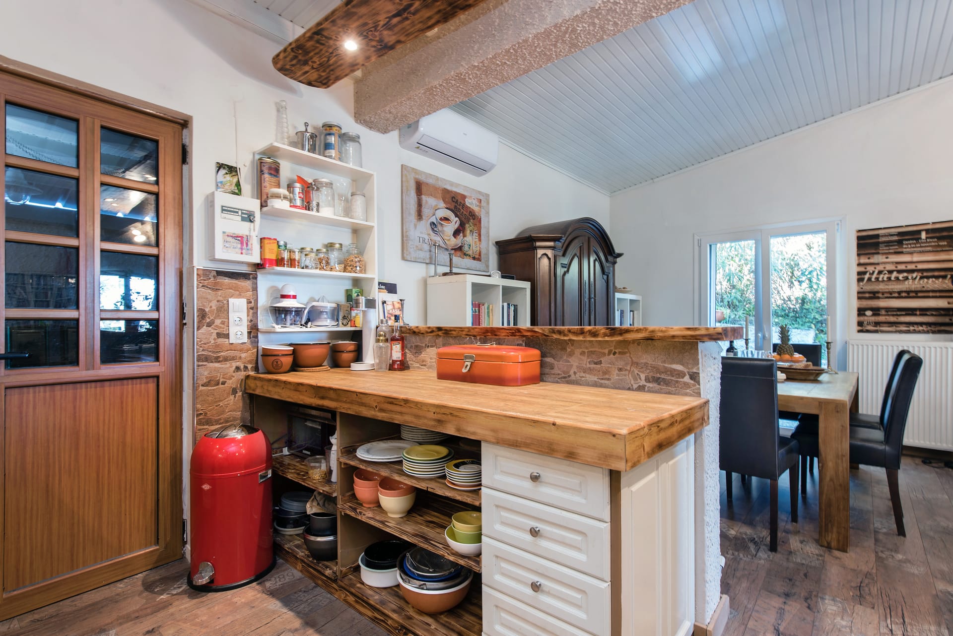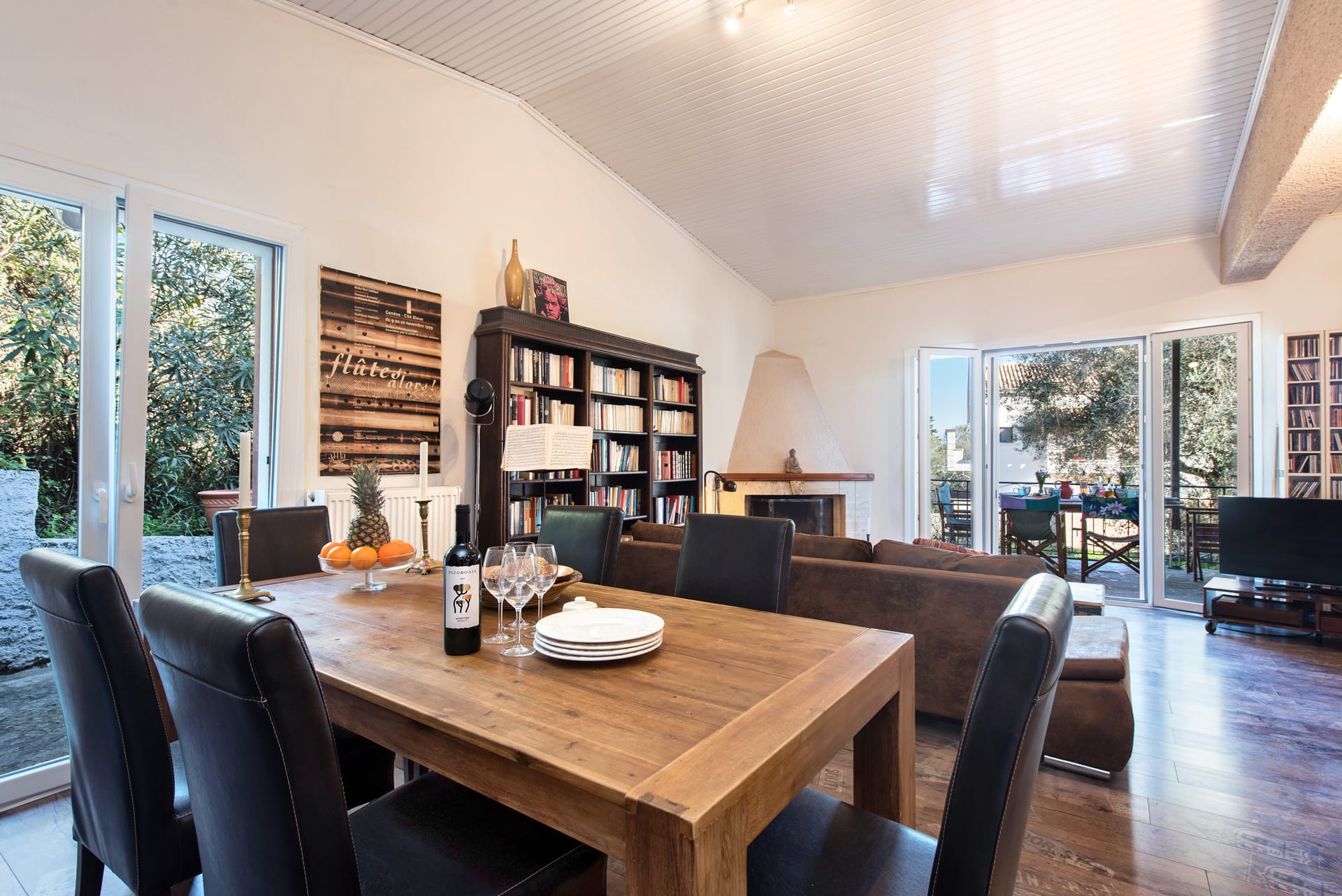 The kitchen is a haven for culinary delights, with polished wooden countertops and gleaming stainless steel appliances providing the perfect backdrop for preparing delicious meals with fresh local ingredients sourced from nearby markets and orchards. A farmhouse-style dining table invites guests to linger over leisurely meals, while French doors open onto a sun-drenched terrace where alfresco dining becomes an everyday pleasure.