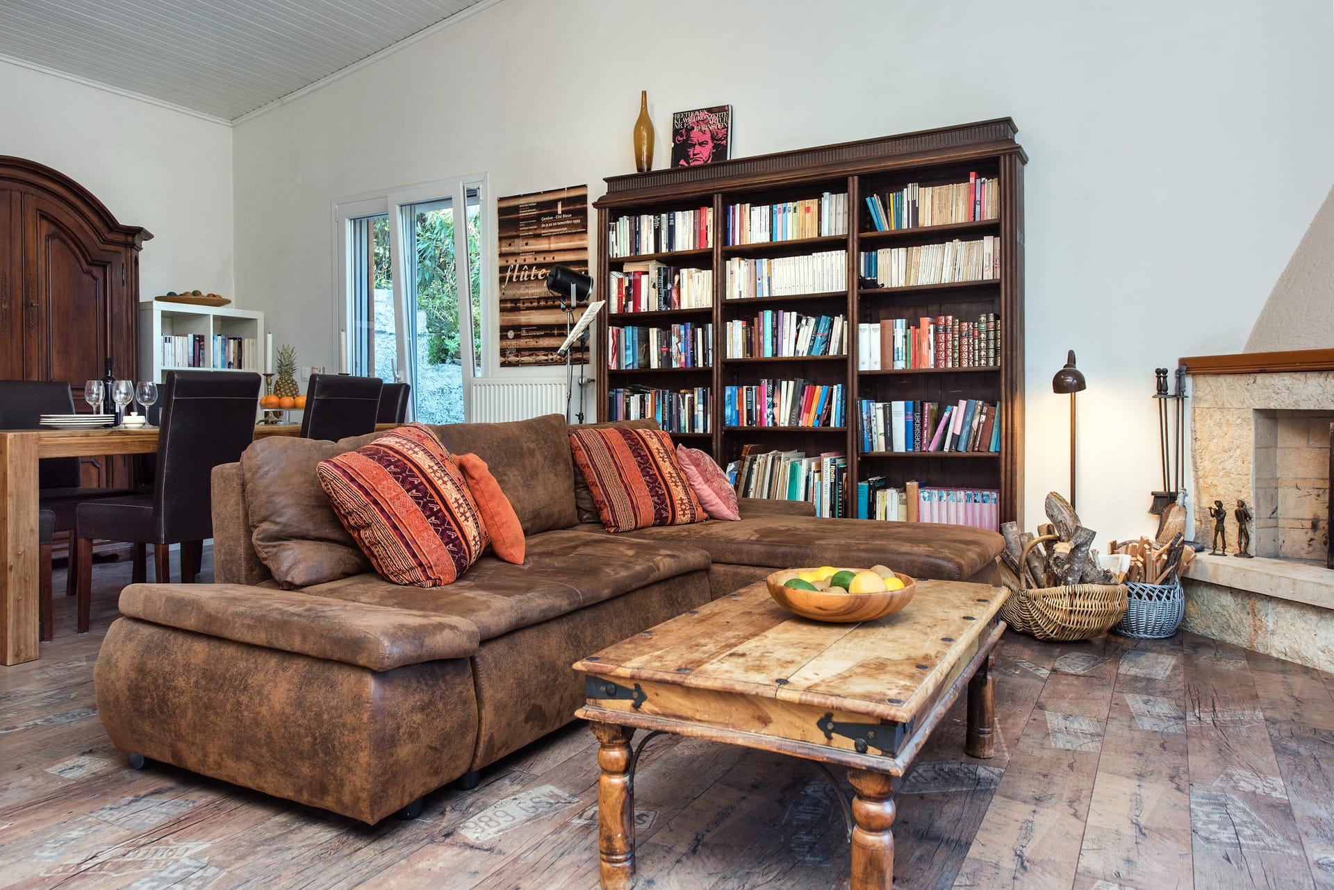 The living room beckons with comfortable sofas and overstuffed armchairs arranged around a fireplace, where guests can curl up with a good book or gather for lively conversation.