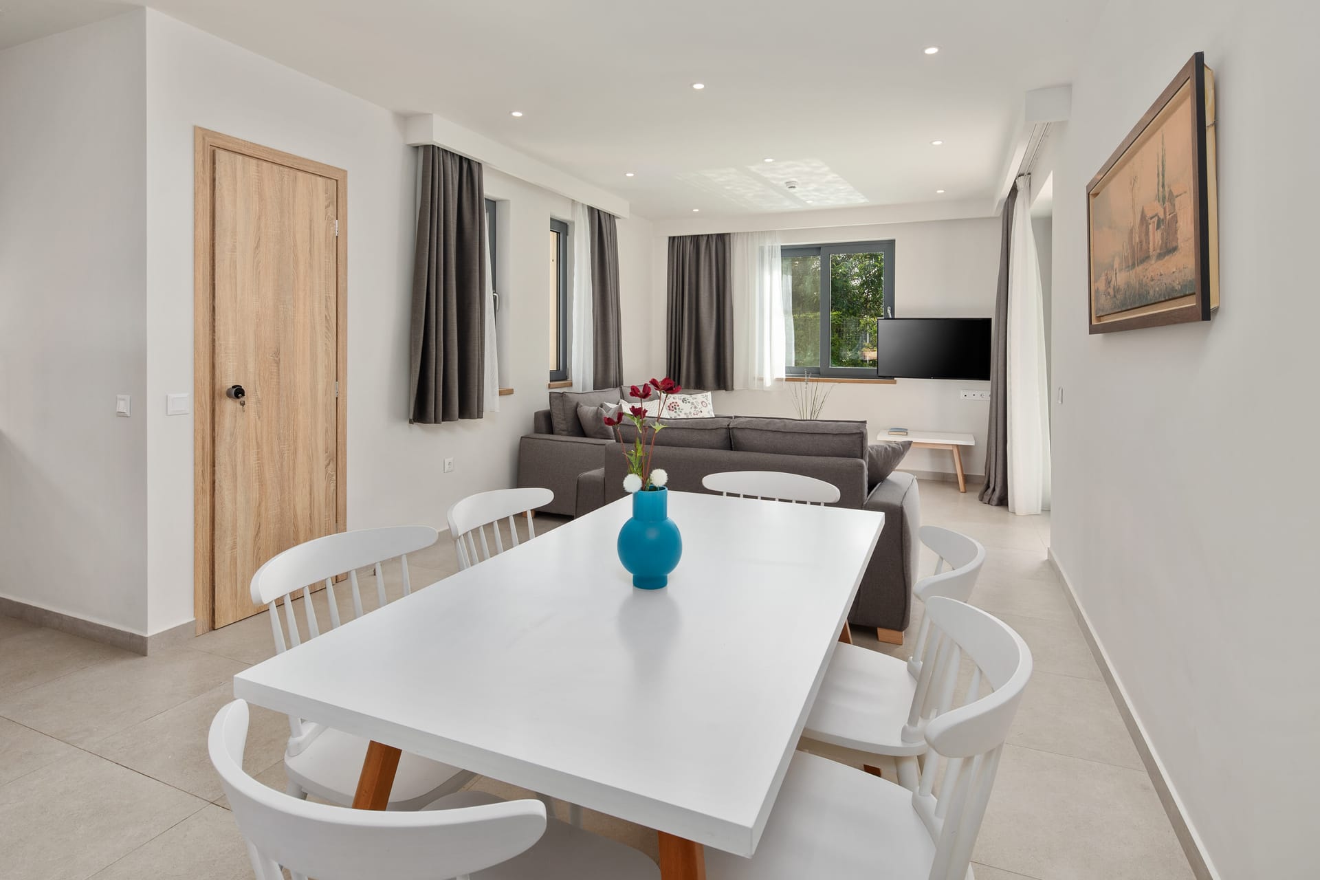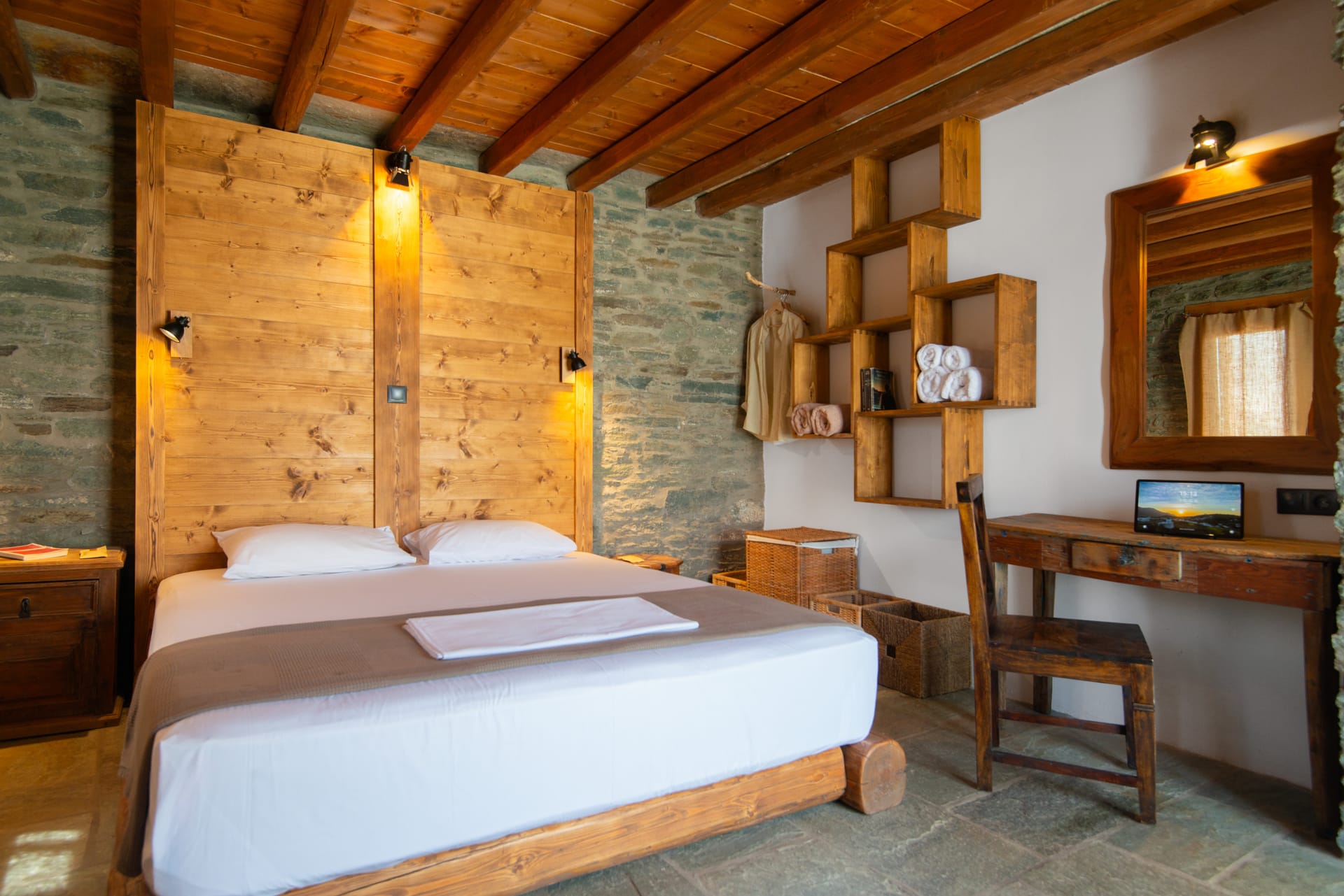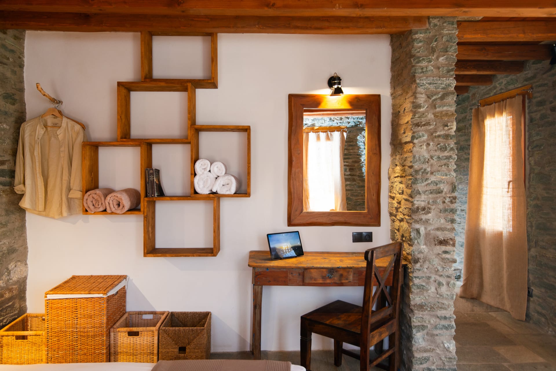Stepping inside, guests are greeted by an interior that radiates warmth and hospitality. Cool tiles floors offset by colorful rugs lead the way to airy rooms filled with natural light. The décor is a blend of rustic simplicity and elegant sophistication, with traditional ceramic tiles and handcrafted furniture adding a touch of character to the space.