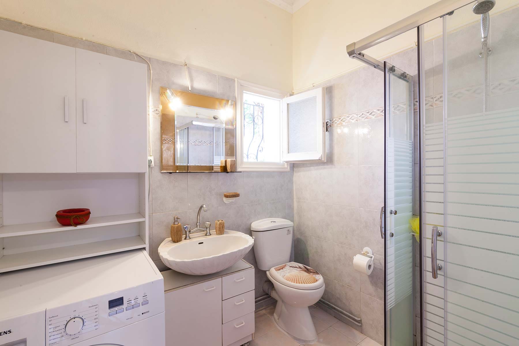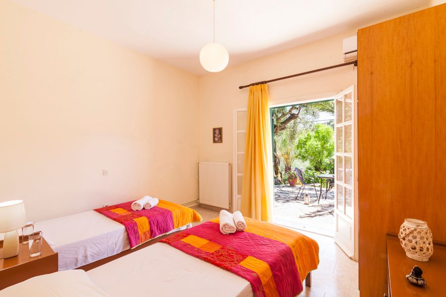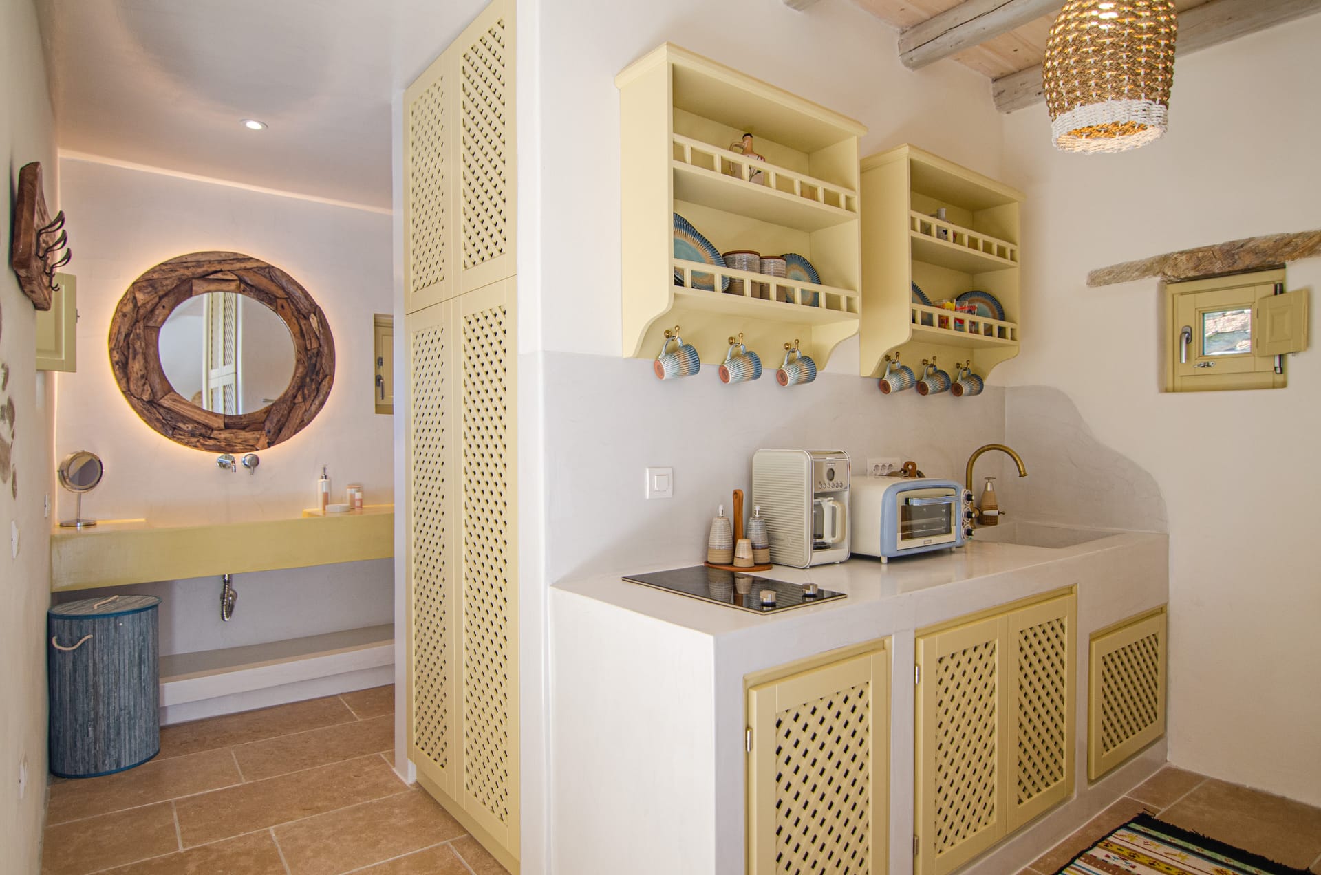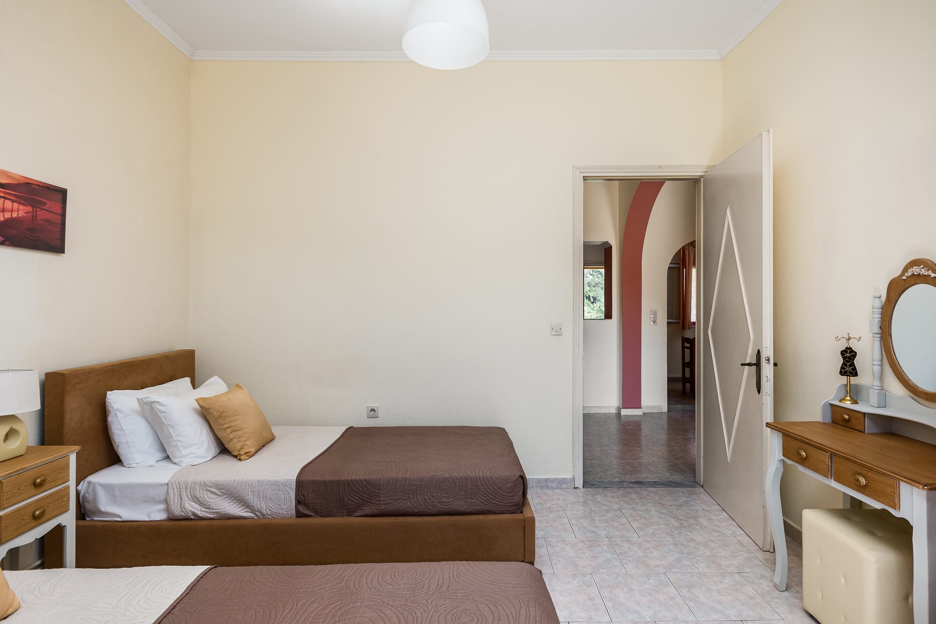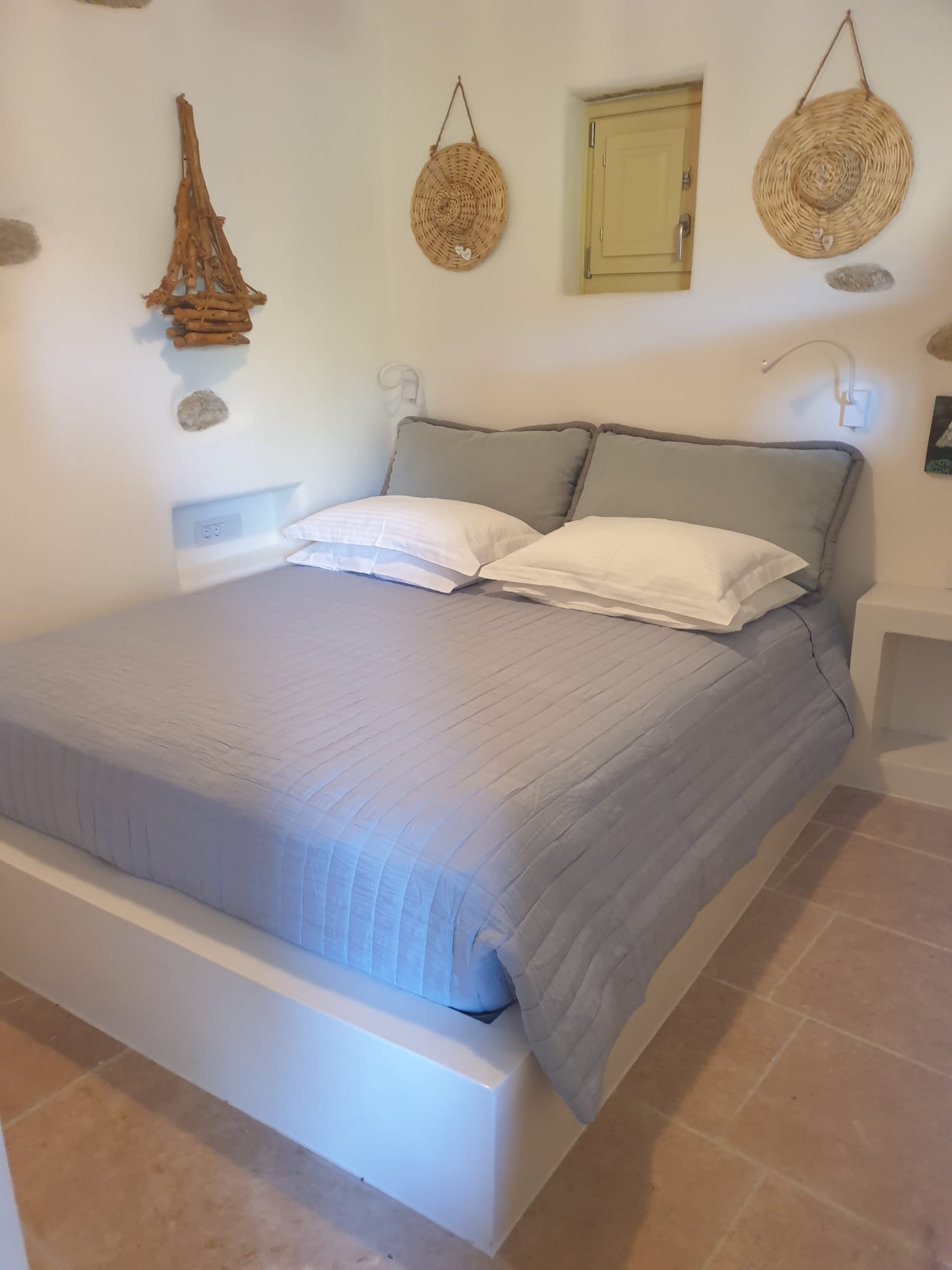 Outdoors, a paved porch, decorated with large clay flowers pots – pitharia – and a traditional stony water well, features a large dining room. Either you wish to have brunch outside and enjoy the sun, or you need some cool evening summer breeze on your hair, this cute porch is perfect for larger parties and evening gatherings.