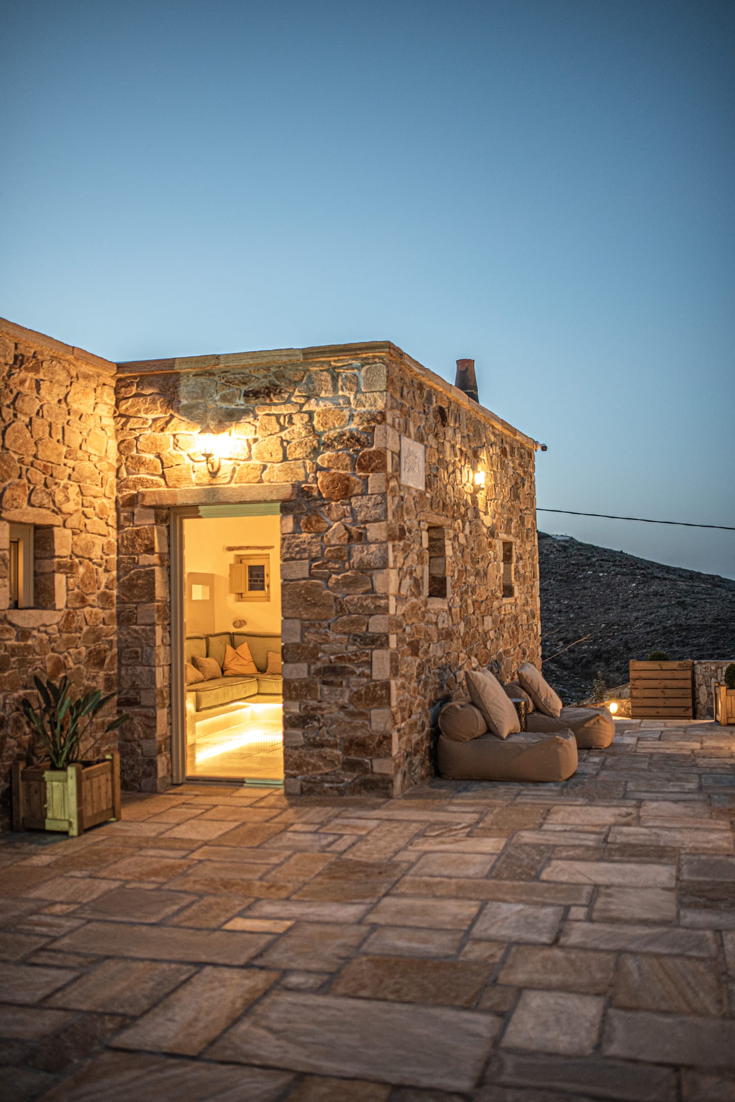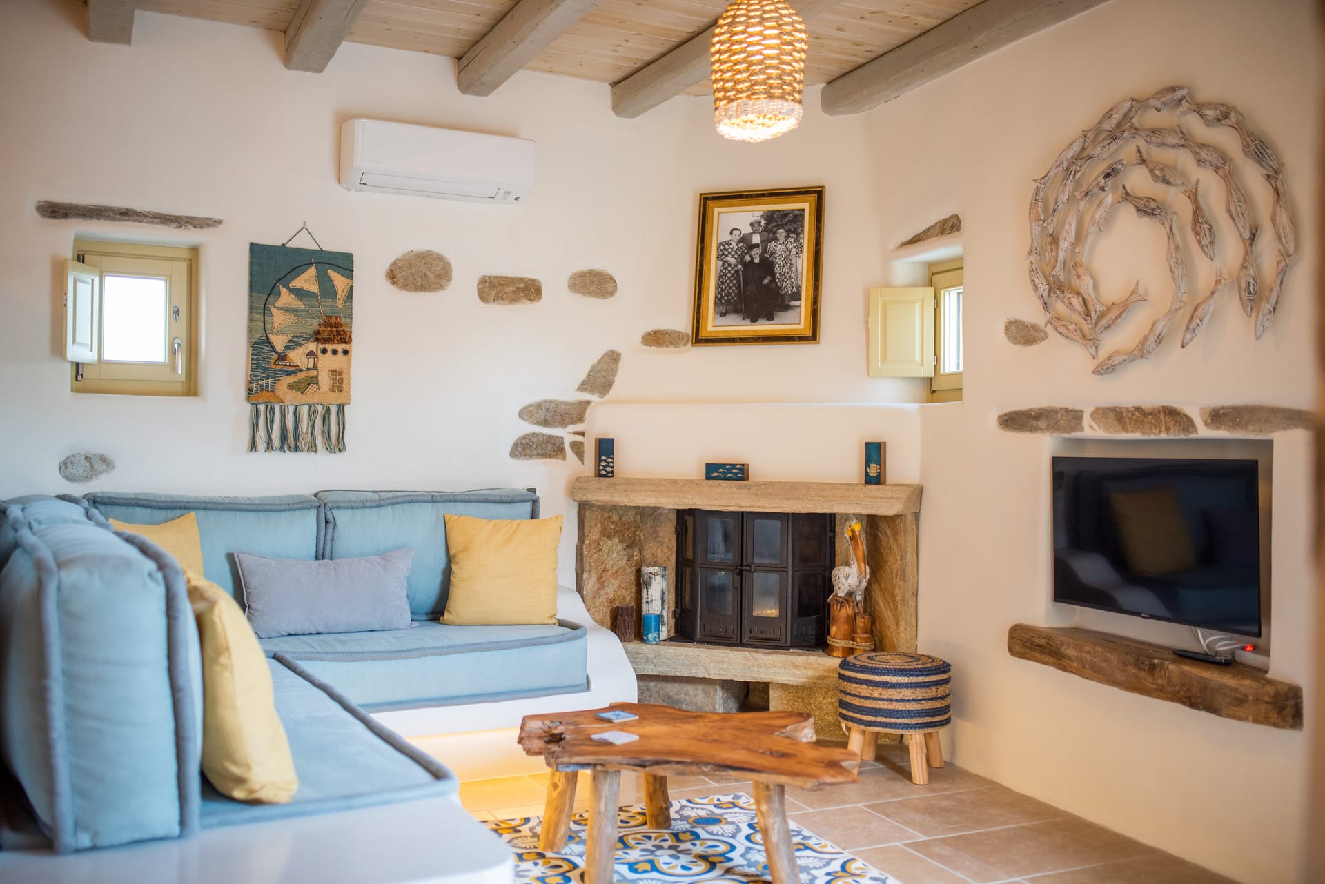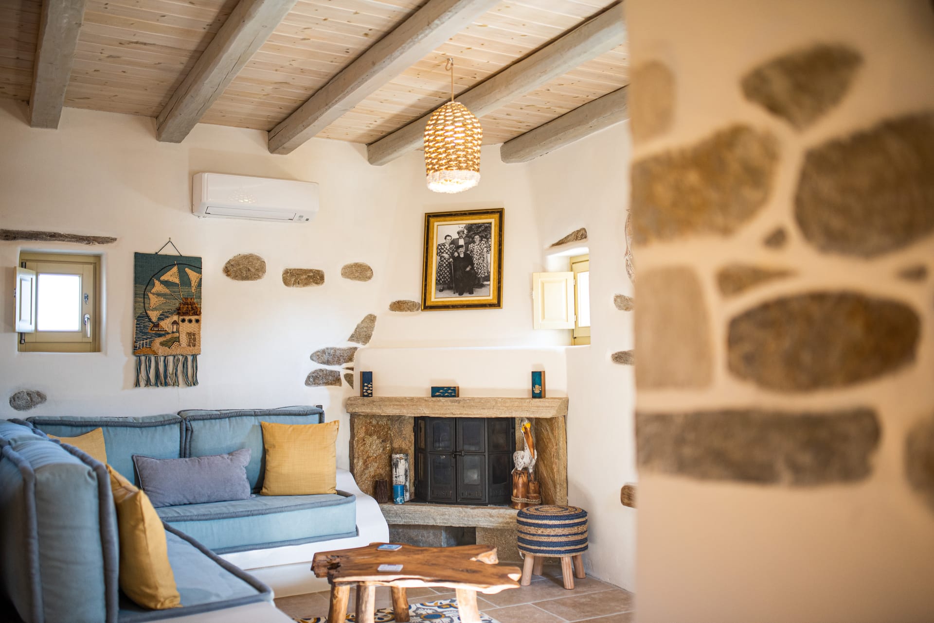 Pithari House is a one-floor house, featuring two bedrooms and two bathrooms and accommodating up to four people. A stone entrance leads in this amazing modern house, where clear colours and contemporary decoration creates a cozy and comfy environment. Stony details and cool shades in the living room make space for endless happy hours indoors, around the beautiful fireplace. Forget your old house’s boring kitchen and grab your gastronomy tools, as this stylish and modern kitchen is going to be your favourite corner in the house. Large windows allow the sunlight to brighten through the house all day long, whereas contemporary lighting details keep the place elegantly lit during the evenings.