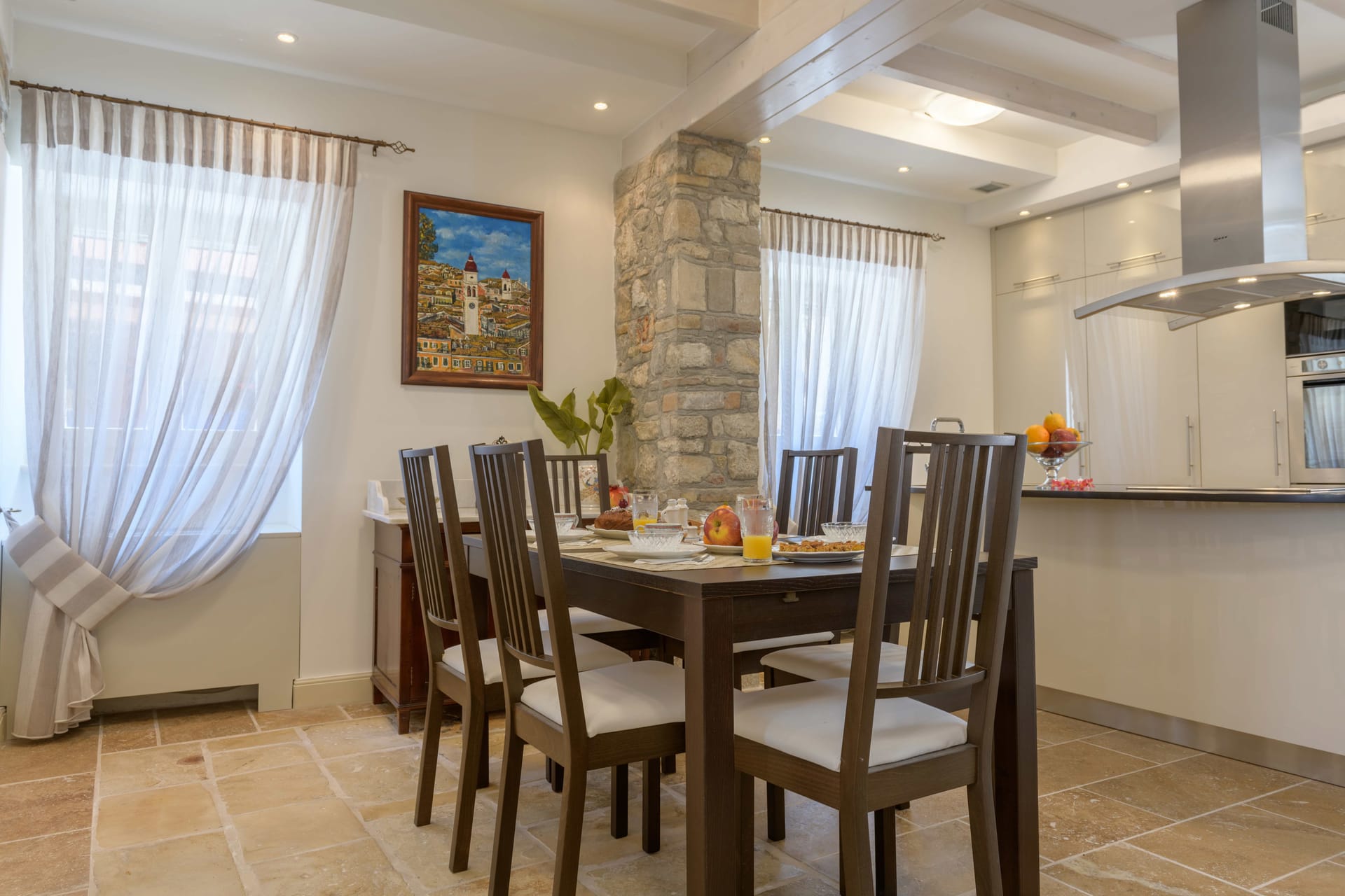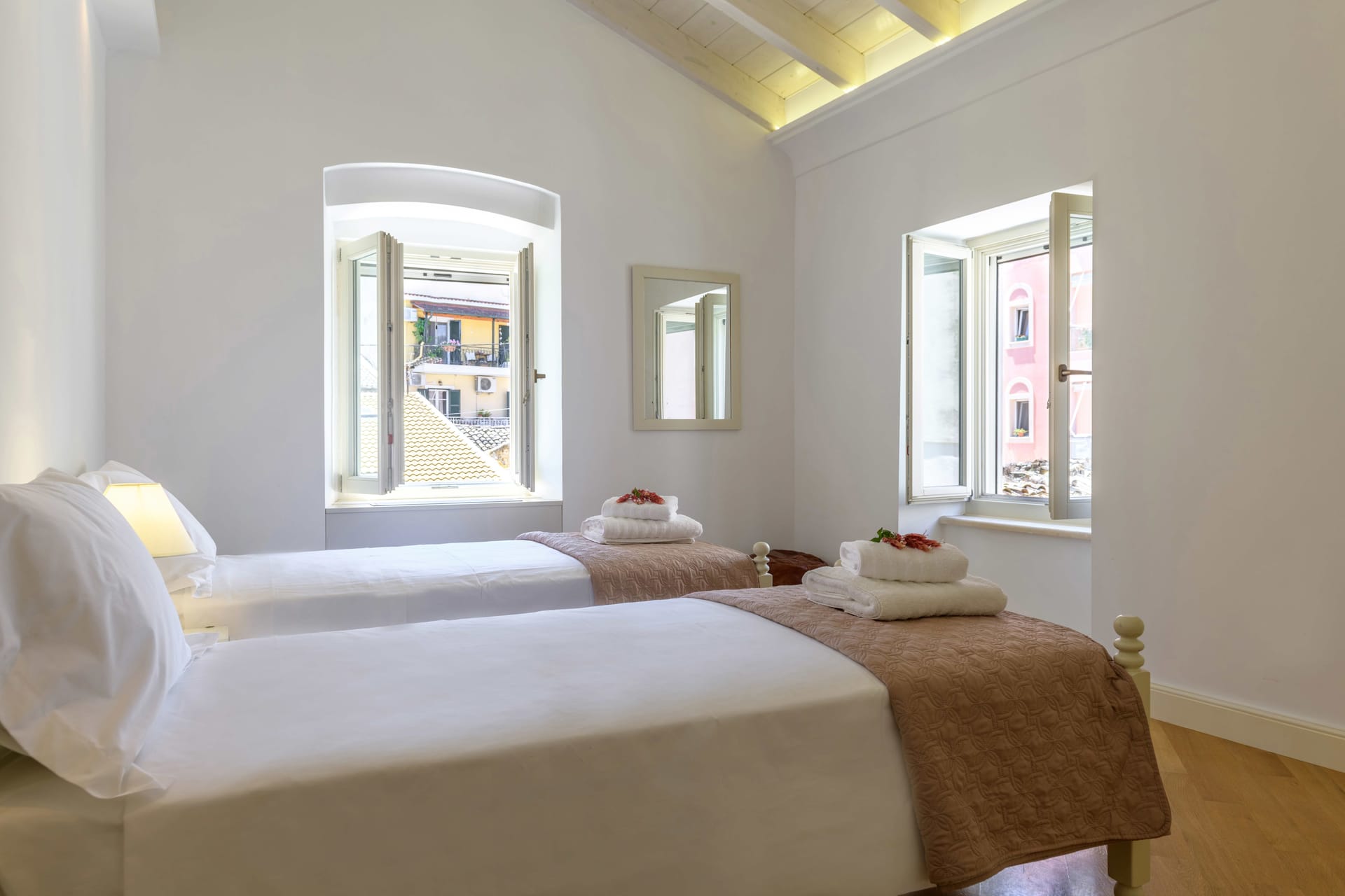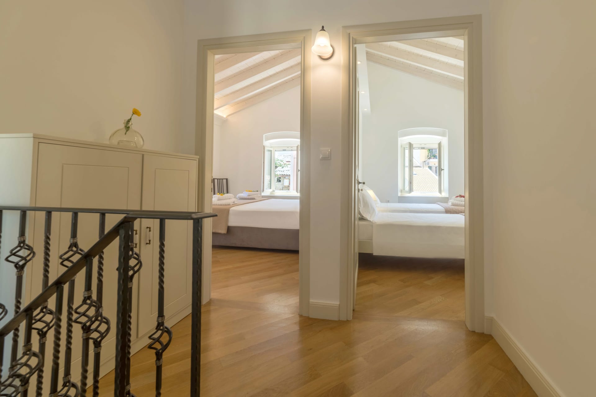 Climbing up the stairs, on the floor, two beautiful bedrooms – a double and a twin one – await to offer peaceful times to guests. White wood details, bright colours, wooden floors and large windows create a serene ambiance, ideal for the vacation of a lifetime. Simple yet elegant bathrooms offer comfort and style, all in one, and only for those who know how to appreciate good taste.