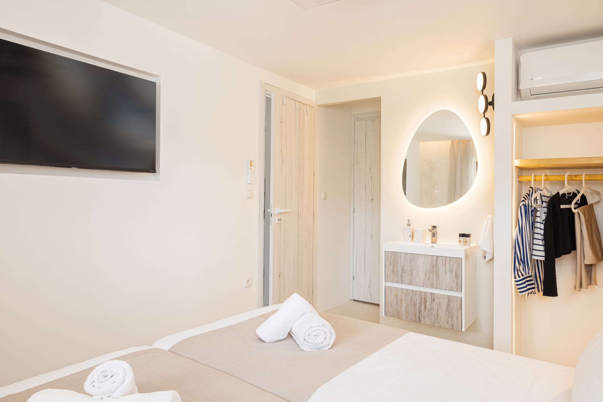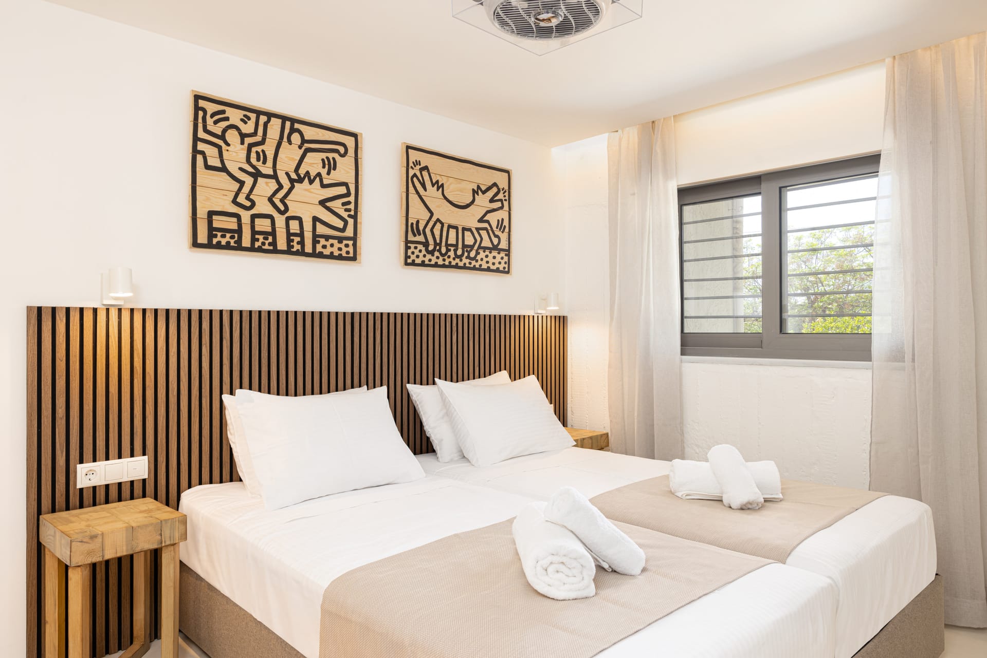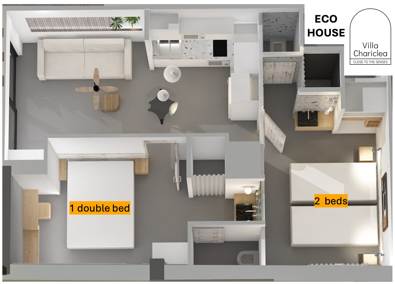 The Eco House features two ensuite bedrooms for ultimate privacy and comfort. The master bedroom boasts a plush double bed, while the second bedroom offers two single beds that can be seamlessly transformed into a double with side sea view. The spacious living room and fully equipped kitchen provide everything you need for a seamless stay, with a design that exudes minimalist luxury.