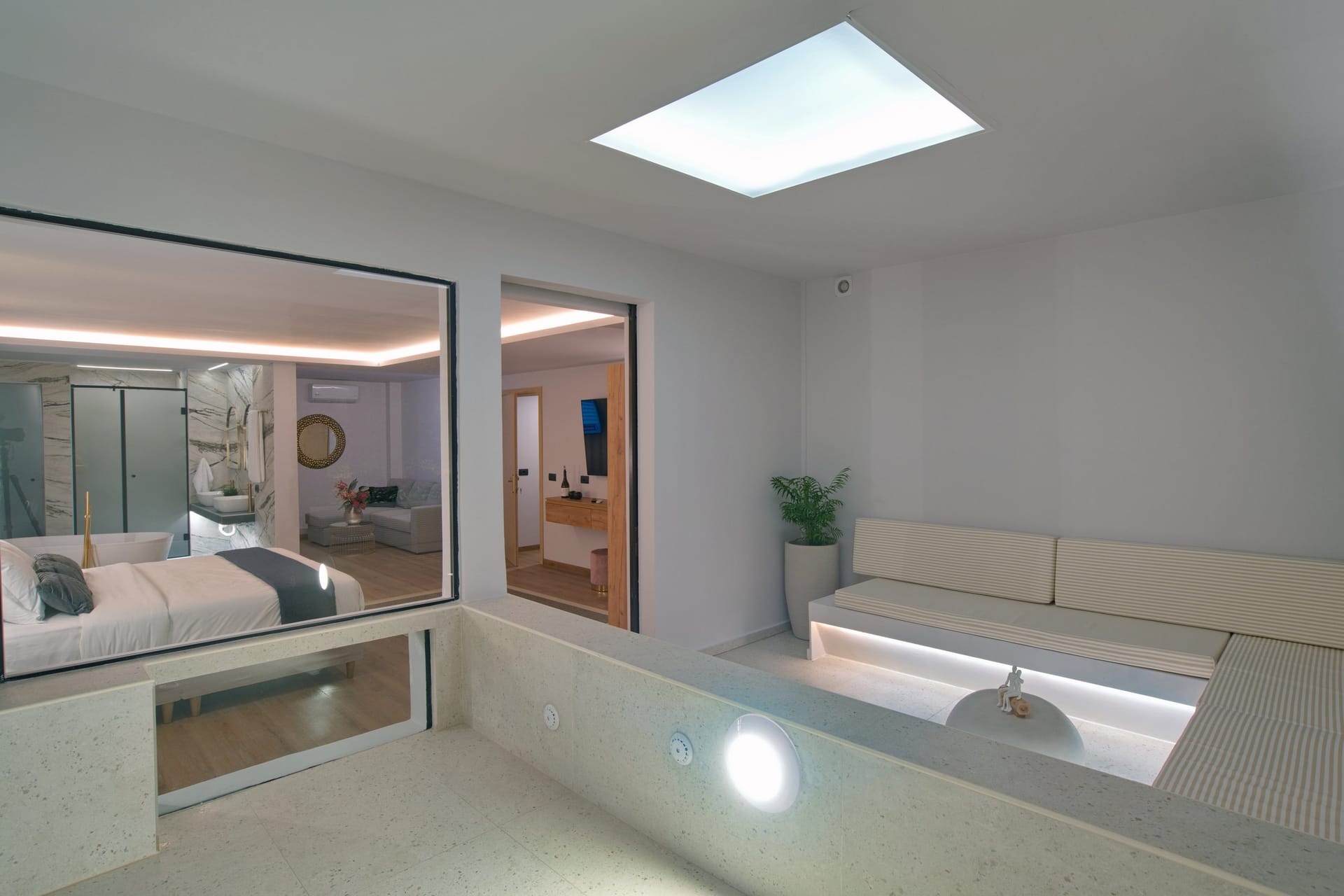 Modern and minimal designed Suite with bedroom, bathroom, living room and a private garden with plunge pool. It accommodates up to 2 guests.