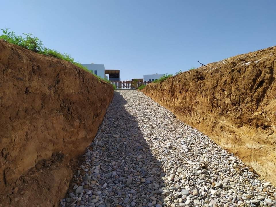 - Ground floor: living room, kitchen, dining area, bathroom, double bedroom in each villa.