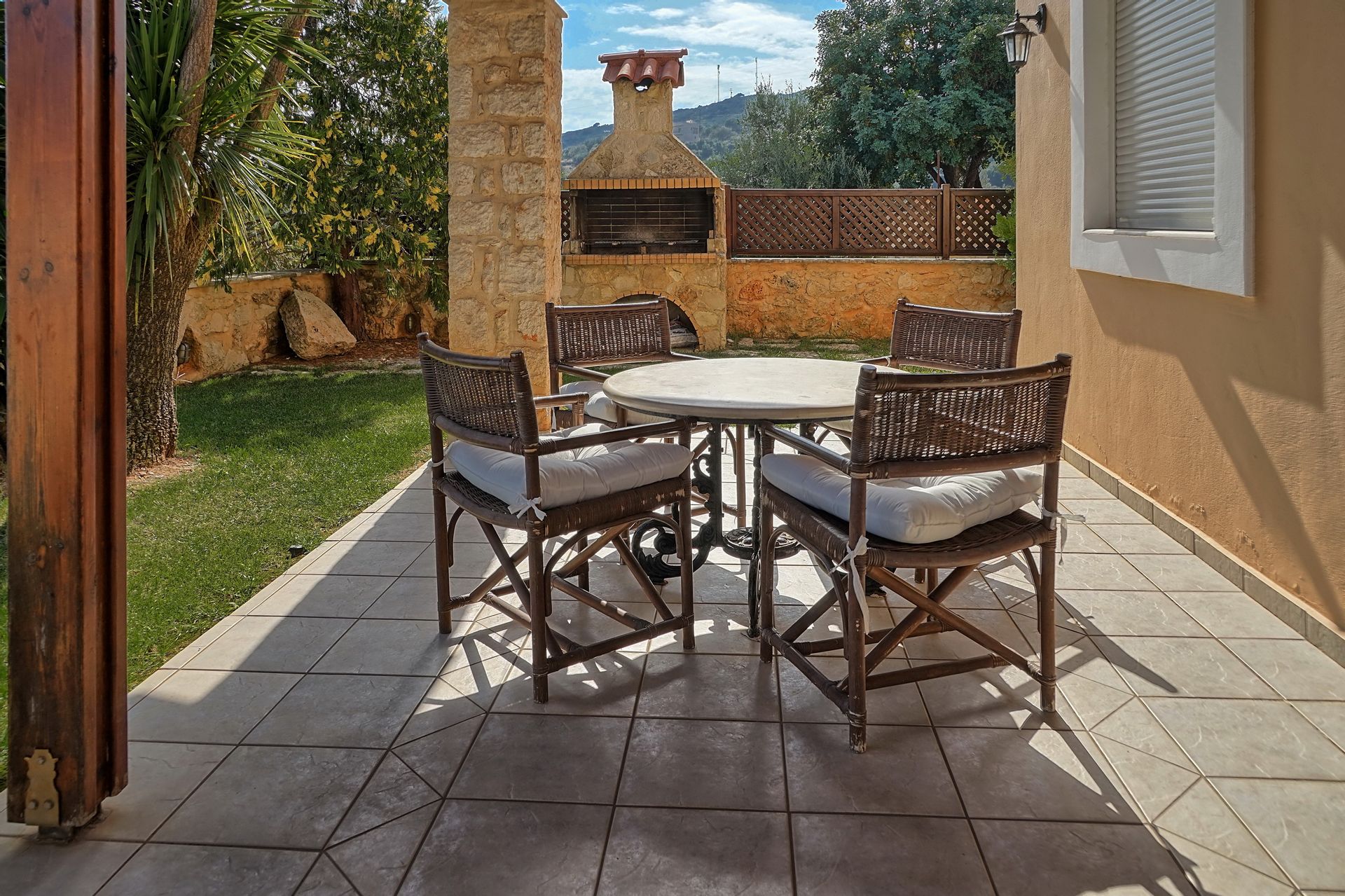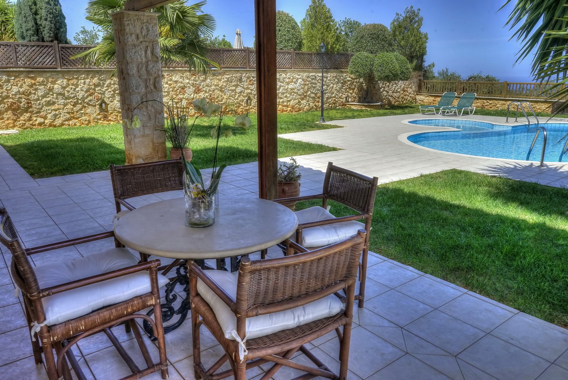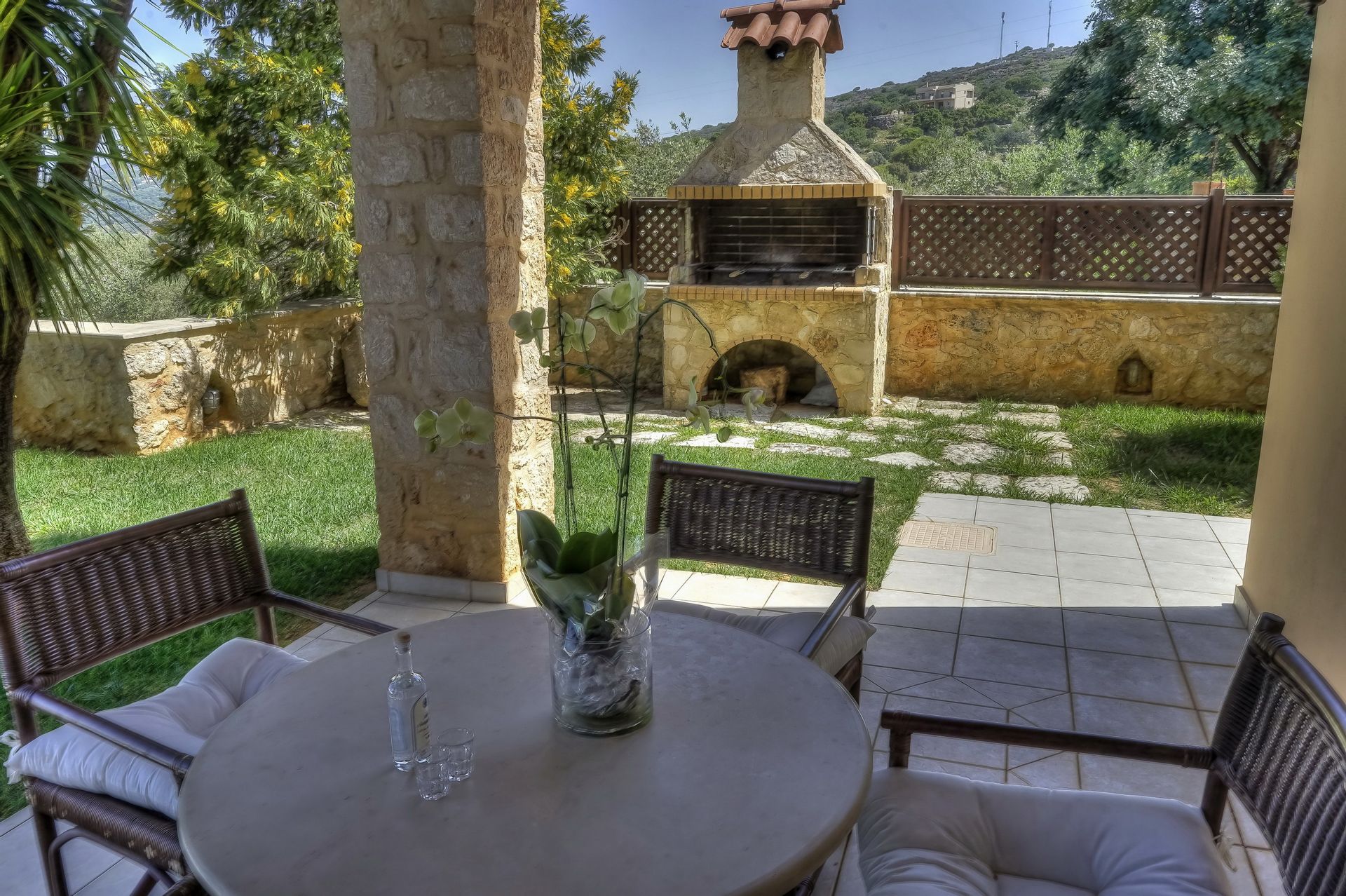 Elessa Villa is a three-bedroom vacation villa that looks out over scenery of exceptional charm and beauty, with an enchanting view of the Cretan sea and bays. It is an entire private villa with a garden and private pool which is aimed at providing you with a perfectly comfortable and relaxed stay. It stands in a privileged landscape with its sunny, exclusive position. Its geographical position, even though quiet, and secluded, allows you to easily travel to the beautiful little settlement of Gerani, the long sandy beaches of Petres, Kavros or Giorgioupolis and the medieval jowls of Rethymno and Chania. Elessa Villa is a beautiful villa that welcomes its guests with a very stylish relaxation area and key facilities: the swimming pool in the middle of the terrace, next to a beautiful, well-maintained garden can be used as an outdoor living and dining area for alfresco meals during the pleasant summer days. Indoors, the villa has two floors and can accommodate up to 6 guests: the ground floor is composed of a living room with a suite, satellite color TV and open fireplace, a dining area with an integrated open-plan kitchen, a bedroom with a double bed and balcony, a bathroom with a shower and a storage room. The first floor, reached by a staircase is composed of a second bedroom with a double bed and balcony, a third bedroom with two single beds and balcony and a bathroom with a bathtub. Framed by walls of natural stone, the outdoor space of Elessa Villa is perfect to spread out, relax and play games. It consists of a 40m2 swimming-pool with paddling-pool, a sun terrace with garden furniture, sunbeds and umbrellas, as well as a garden with lawns and ornamental plants. The BBQ facility of the villa is the ideal setting to enjoy grill lunch or dinner with friends and family. With its own plot and amazing panoramic views, Elessa Villa is inspired by the modern private living vacation model in order to provide the privacy of your own home, as a leisurely alternative to a day at the beach or sightseeing.