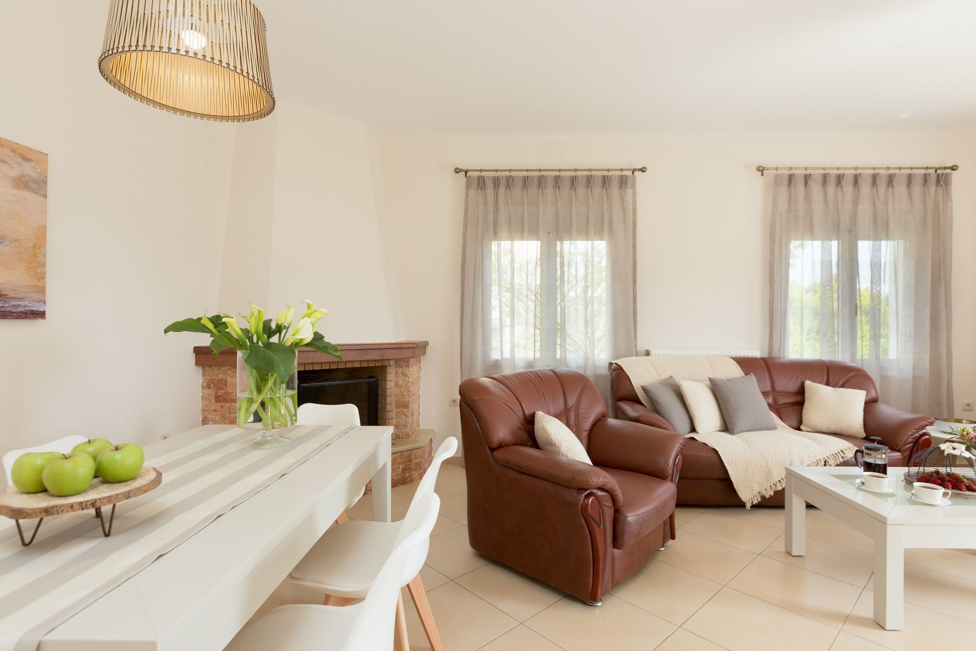 Entering Eros Villa you will find an open plan living area that offers direct access to the pool terrace, with a living room and an open fireplace, as well as a practical and fully equipped kitchen with dining table. The ground floor includes a twin bedroom and a bathroom, while a few stairs upwards there are the two remaining bedrooms of the villa with a balcony, and a family bathroom.