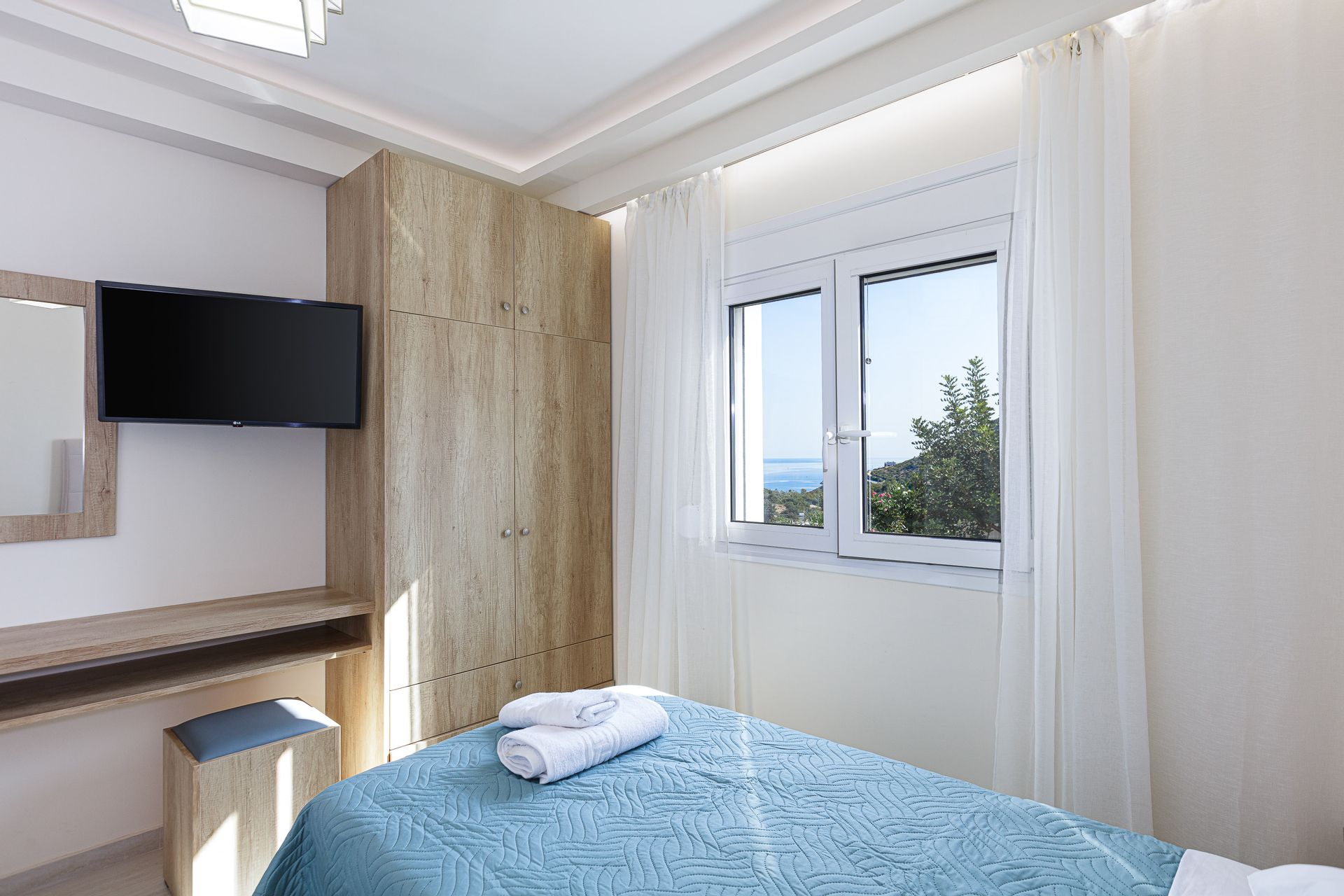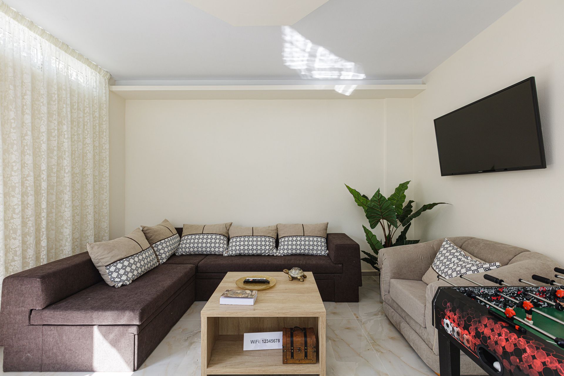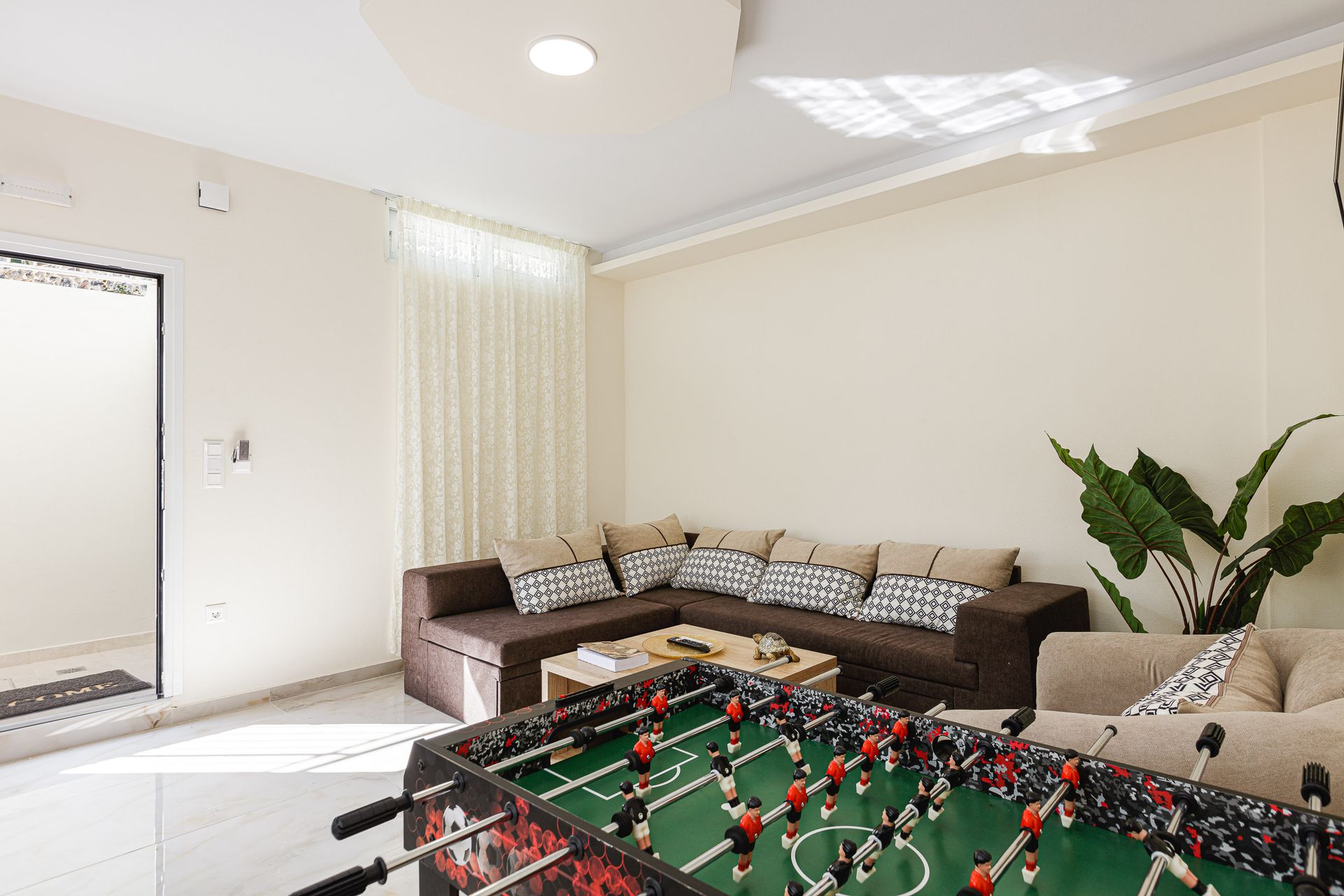 The family holiday villa has 2 double bedrooms and 1 twin bedroom, with additional bedding to sleep up to 7 guests if required. The bedrooms have private balconies, air conditioning, and a safe for guests to enjoy. There are 2 full bathrooms of which one is ensuite, with 2 towels per guest and a hairdryer. Cleaning service is available once a week and amenities for guests include a washing machine, iron, and ironing board.
