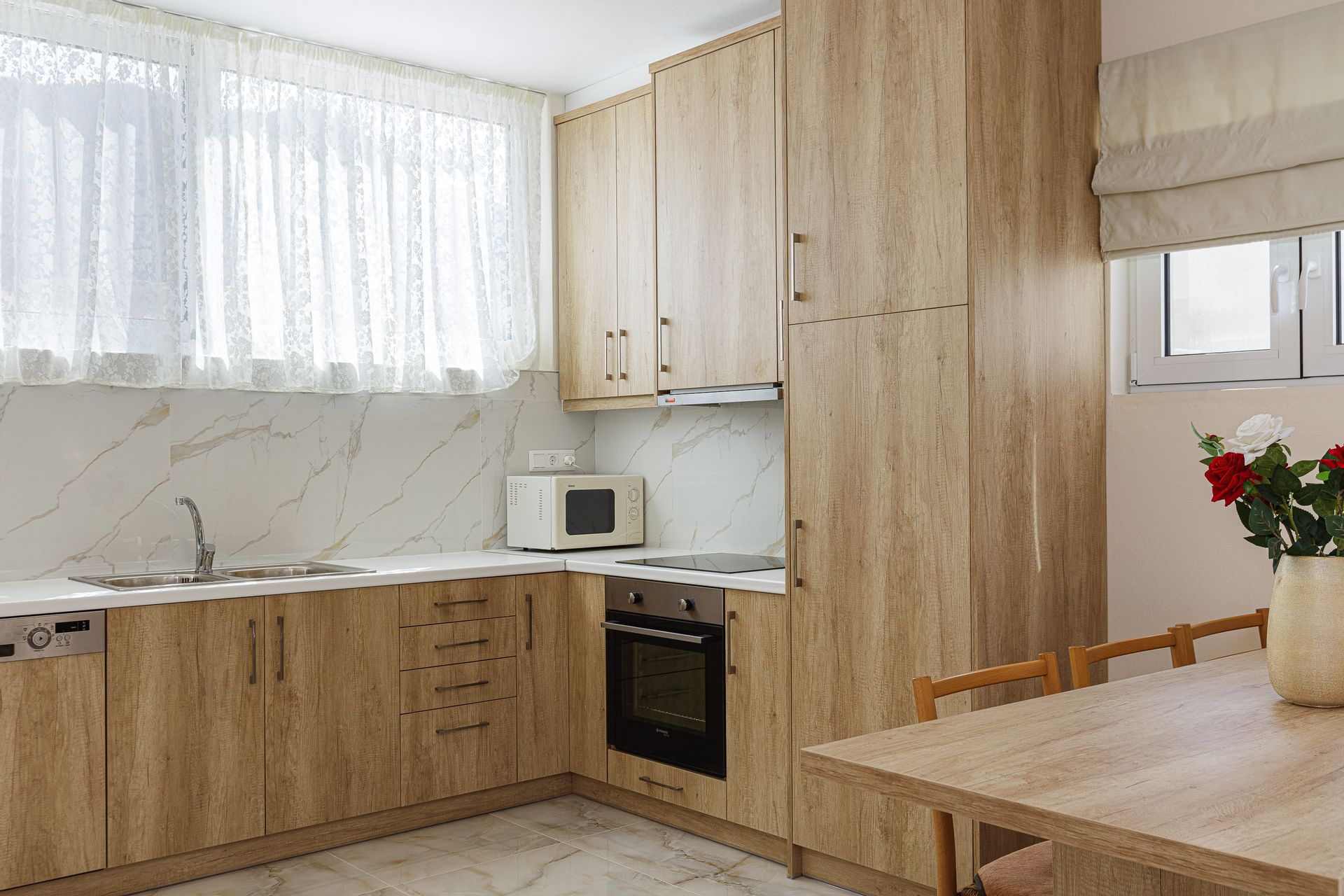 Kitchen and living room with direct access to the patio and pool area, dining table, 1 double bedroom ,1 twin bedroom & 1 big bathroom