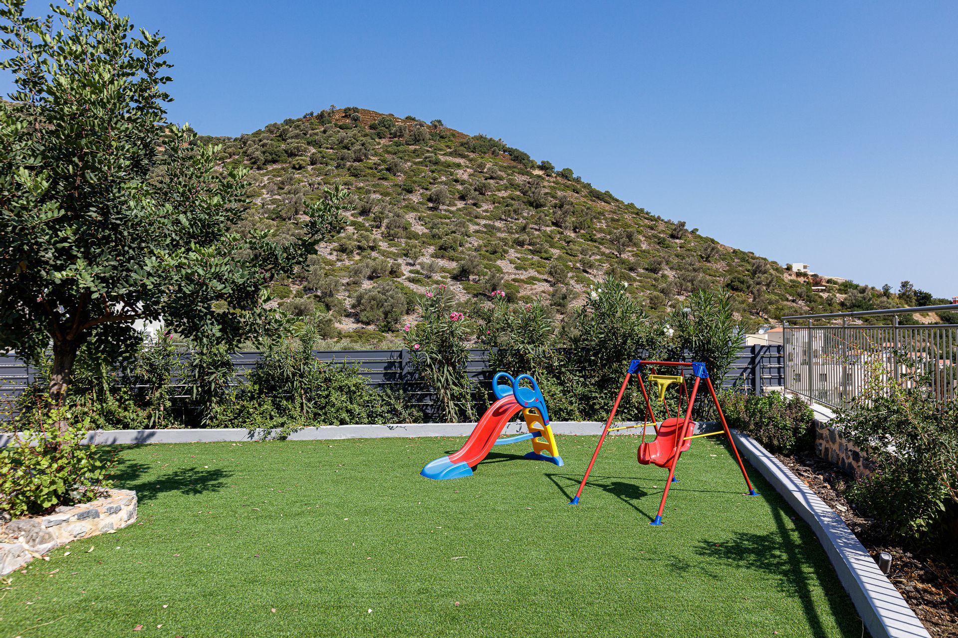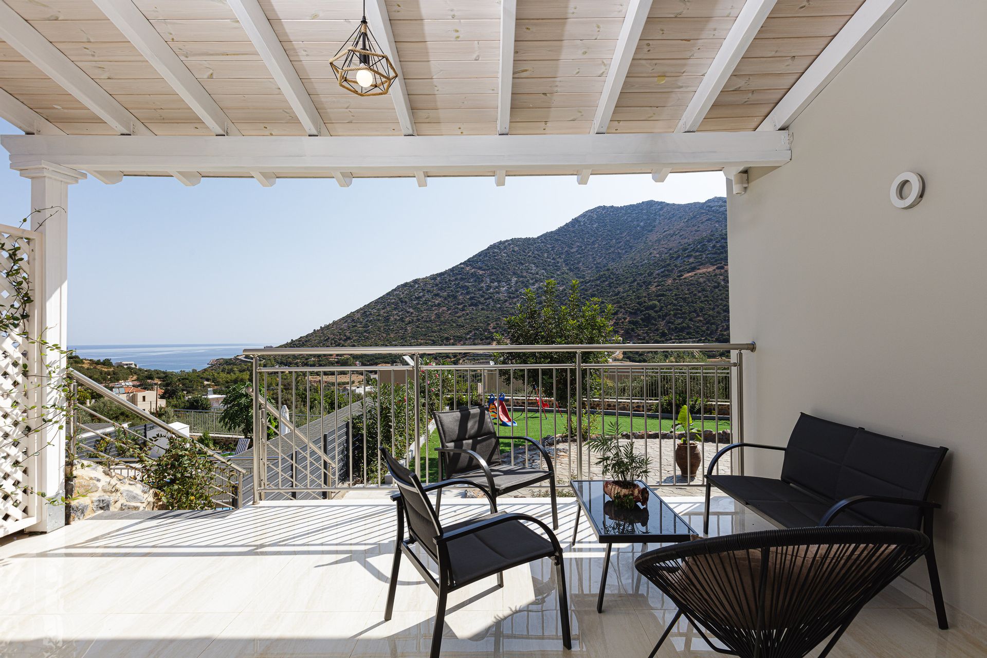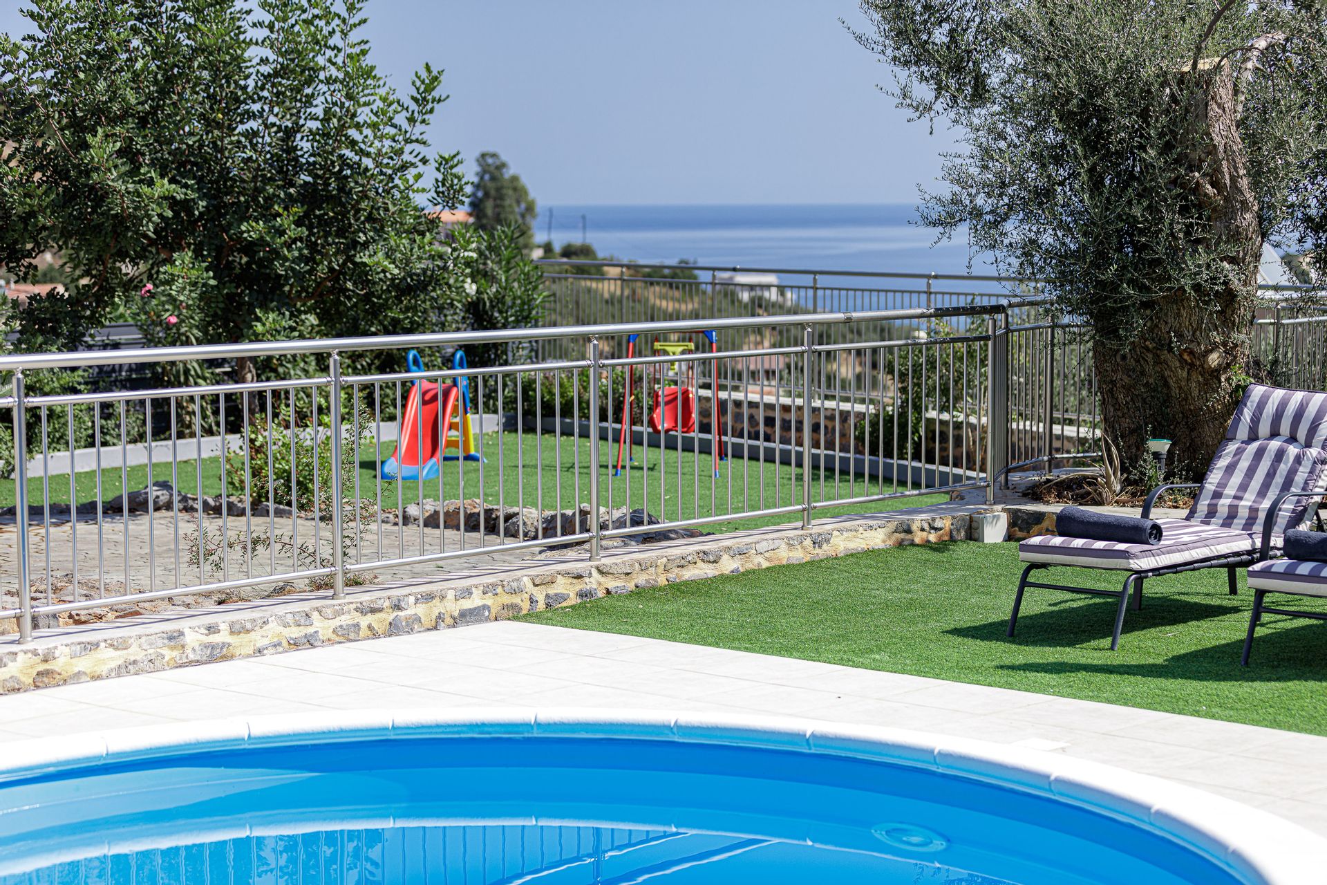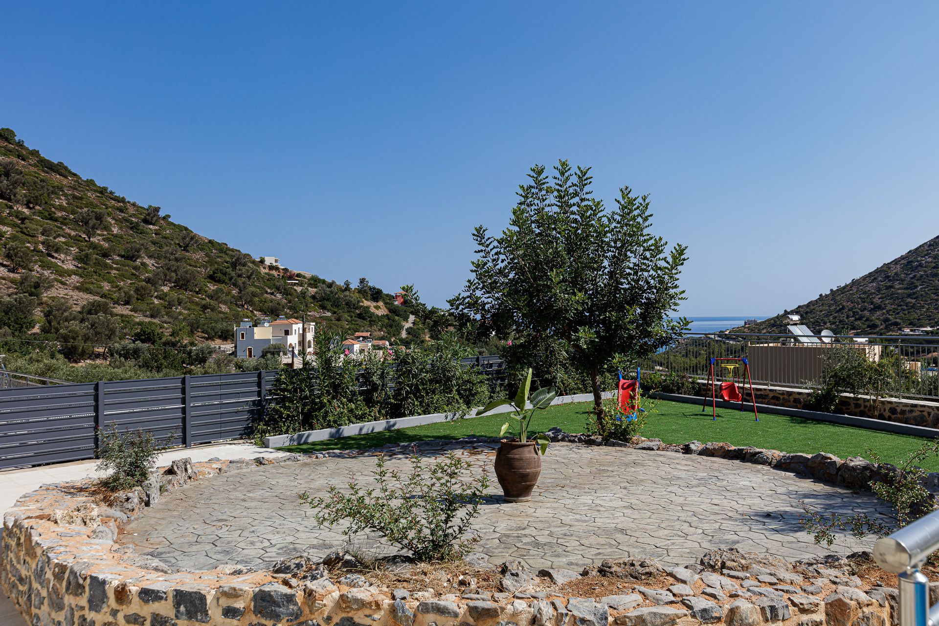 The inviting outdoor area is host to a private swimming pool in a peaceful garden setting, perfect for spending long summer days relaxing with the family. This Crete holiday villa has an extensive outdoor entertainment area, shielded by a large pergola. It contains a gas grill BBQ and a dining area, as well as informal seating and a children’s play area. Additionally, there is a football table for guests’ enjoyment. The Gloria family holiday villa also includes parking space for 2 cars.