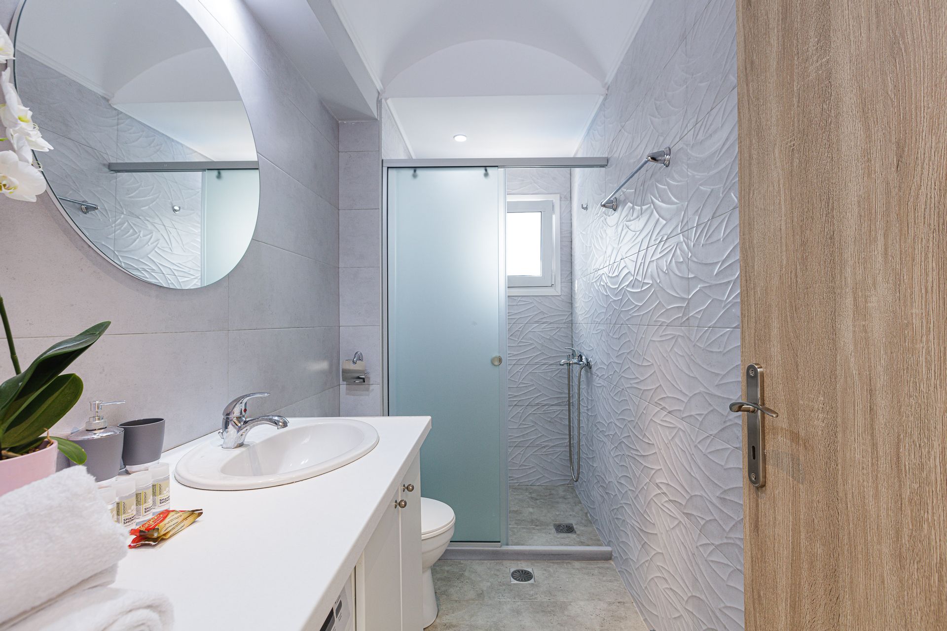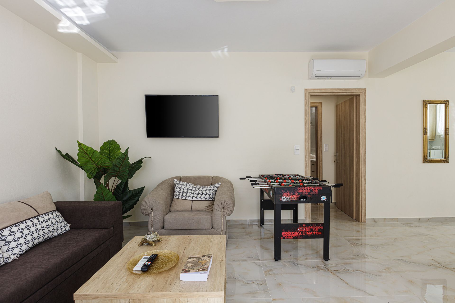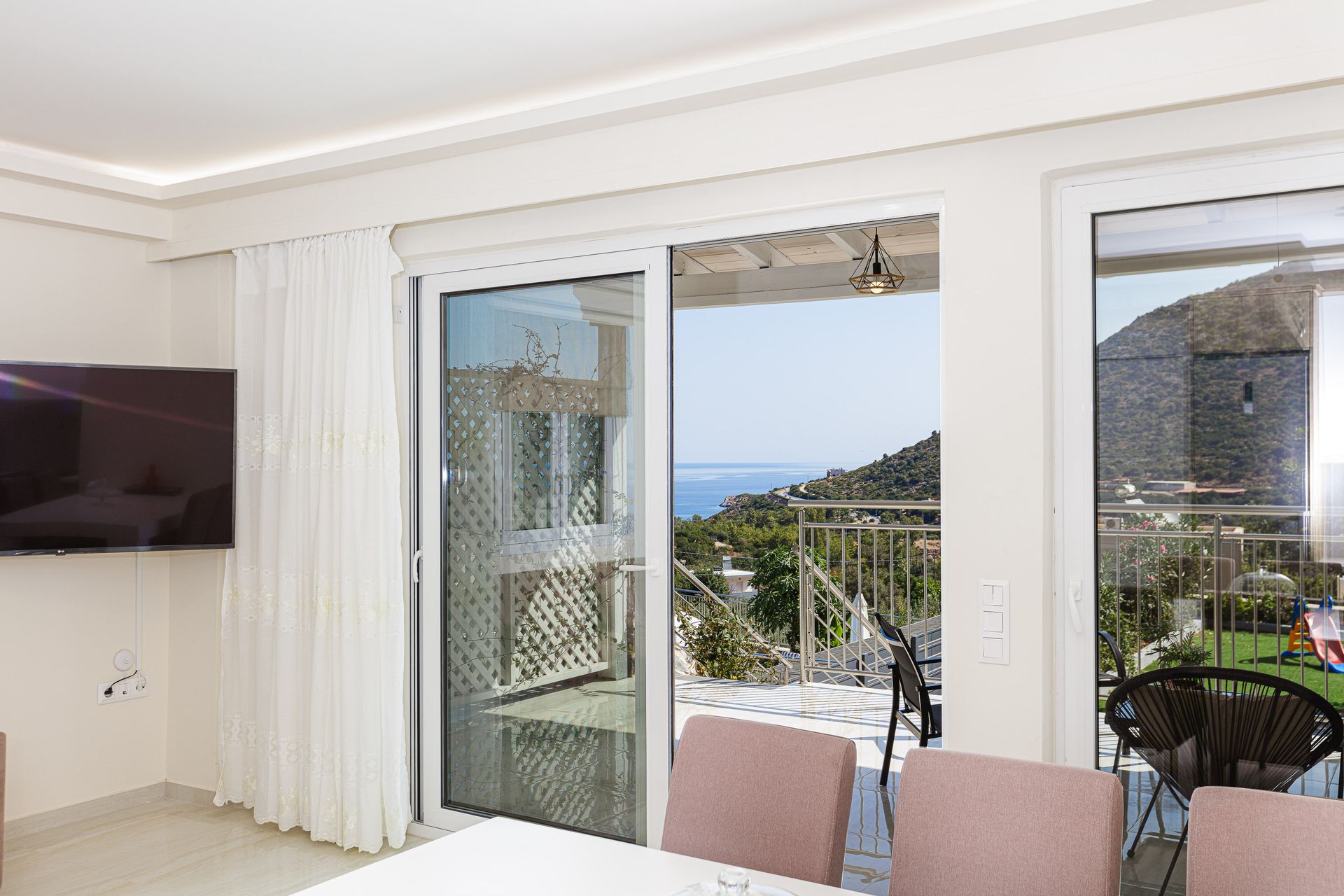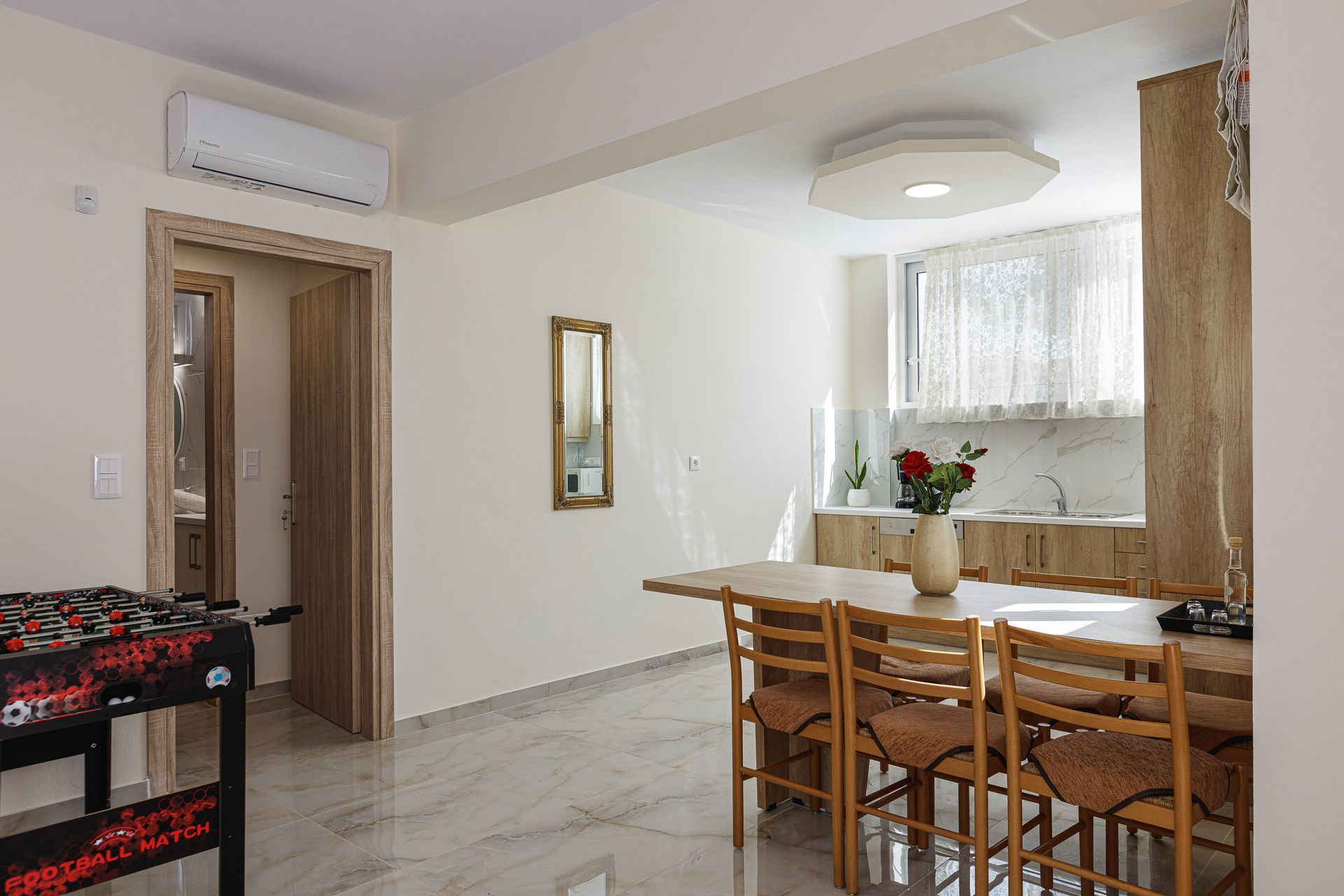 The inviting outdoor area is host to a private swimming pool in a peaceful garden setting, perfect for spending long summer days relaxing with the family. This Crete holiday villa has an extensive outdoor entertainment area, shielded by a large pergola. It contains a gas grill BBQ and a dining area, as well as informal seating and a children’s play area. Additionally, there is a football table for guests’ enjoyment. The Gloria family holiday villa also includes parking space for 2 cars.