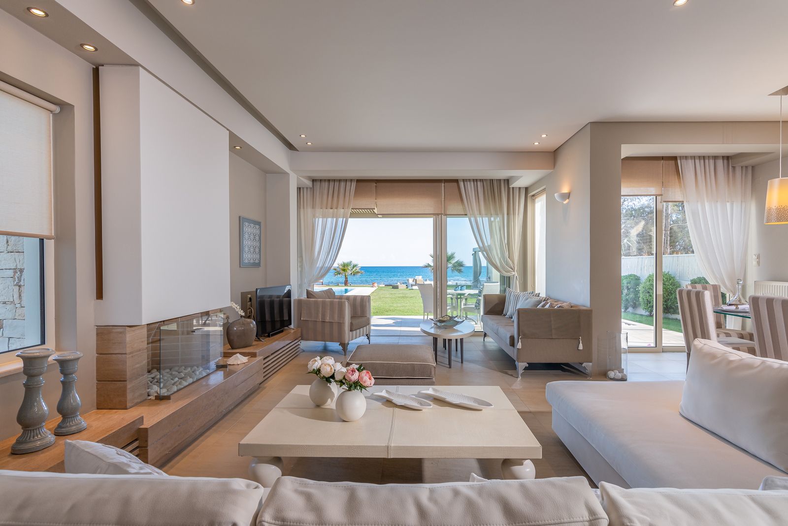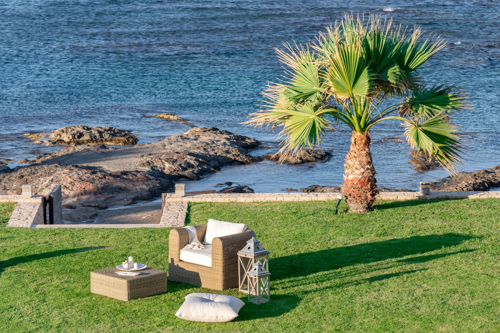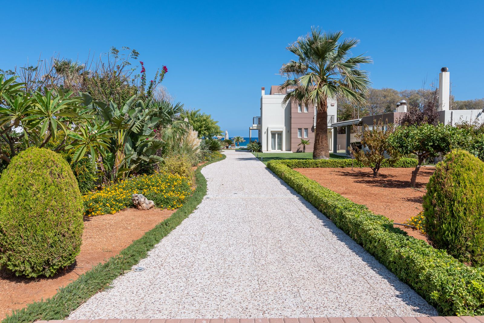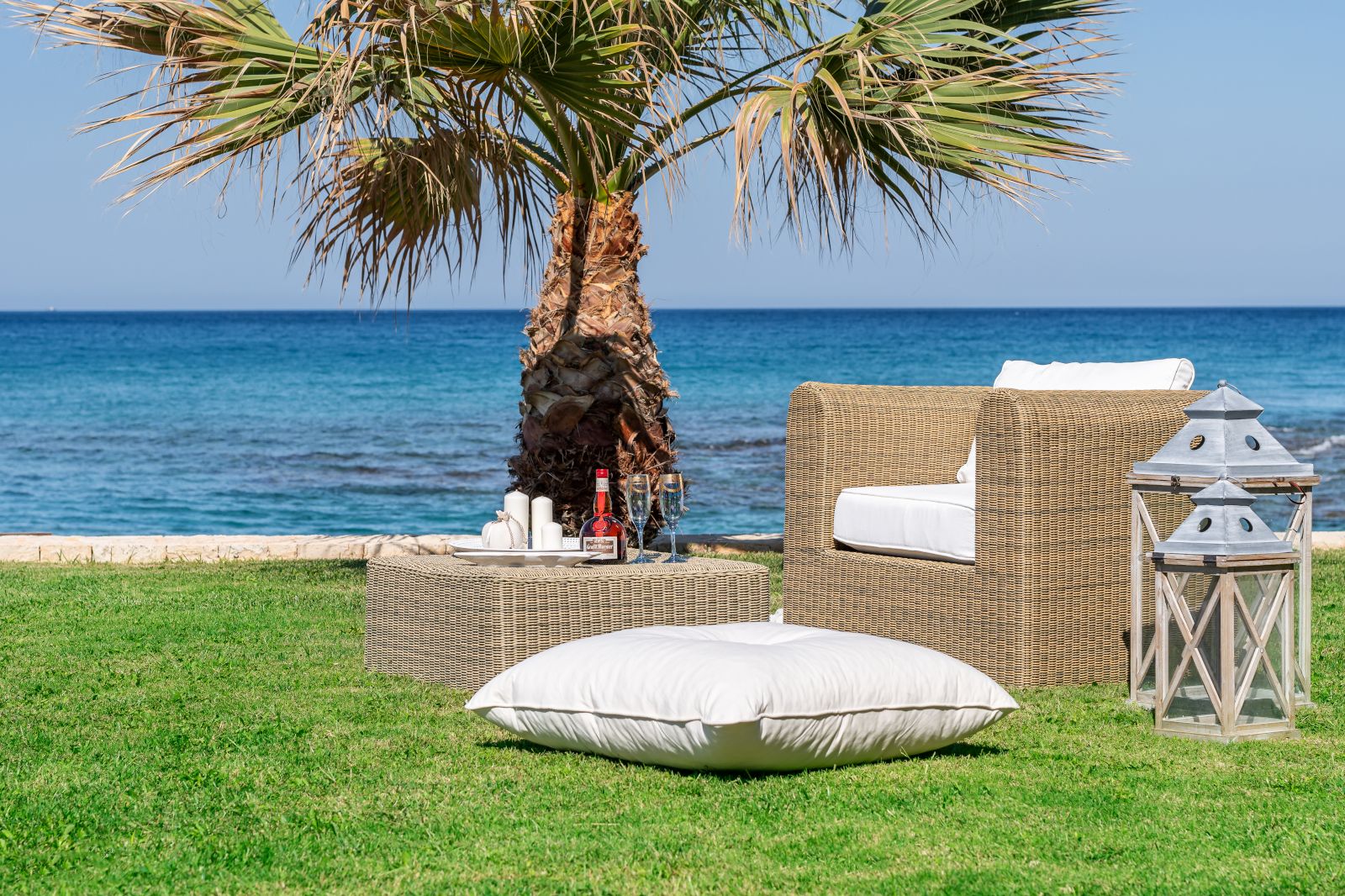Brand new villa in Chersonissos in front of an organized sandy beach! Villa 'Hersonissos' is a luxury seafront holiday house only a few meters away from supermarkets, restaurants and shops. The villa is surrounded by a large grass garden with flowers and palm trees in a 1800 sq. m. of private property. Moreover it has a large swimming pool with sun beds and umbrellas.