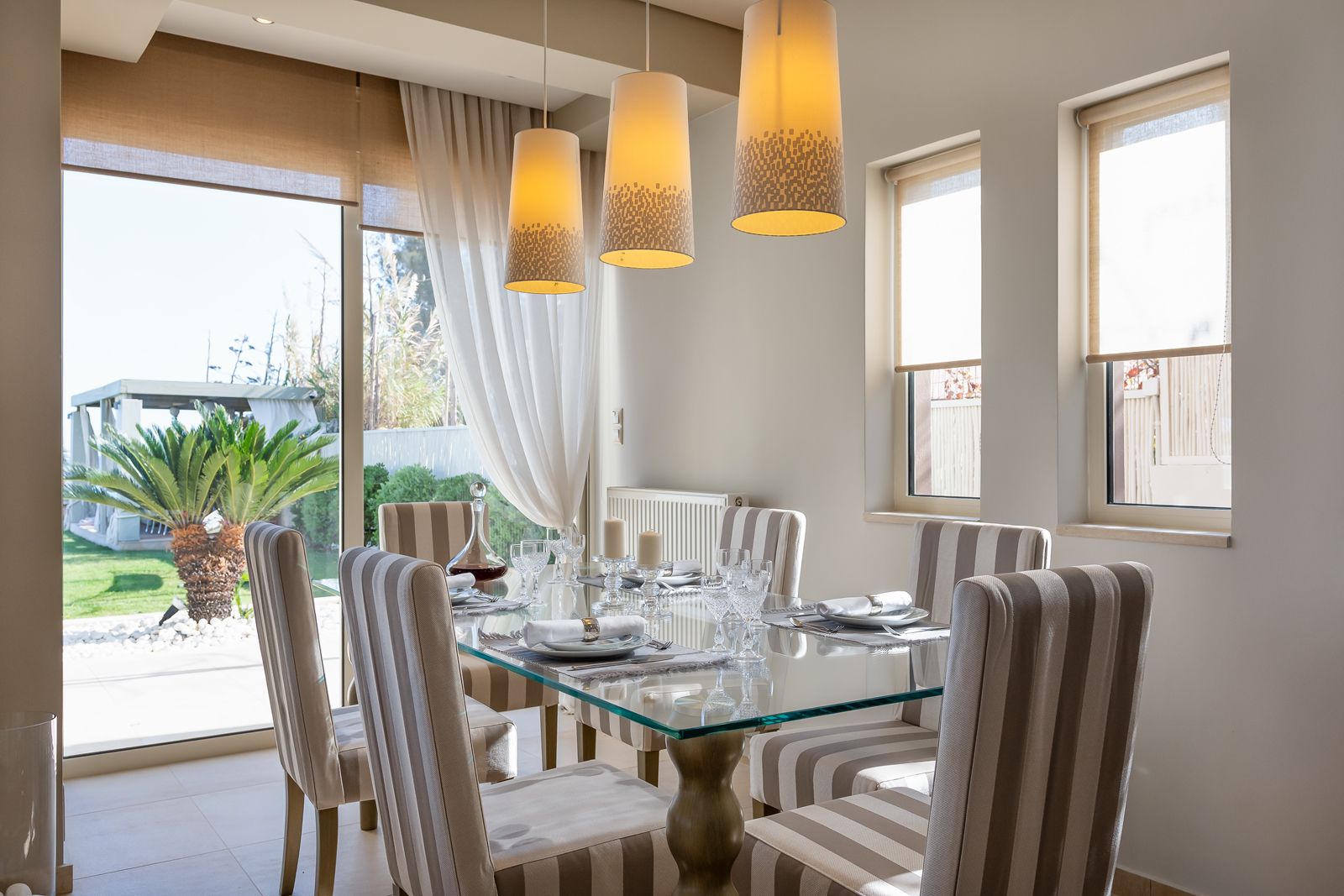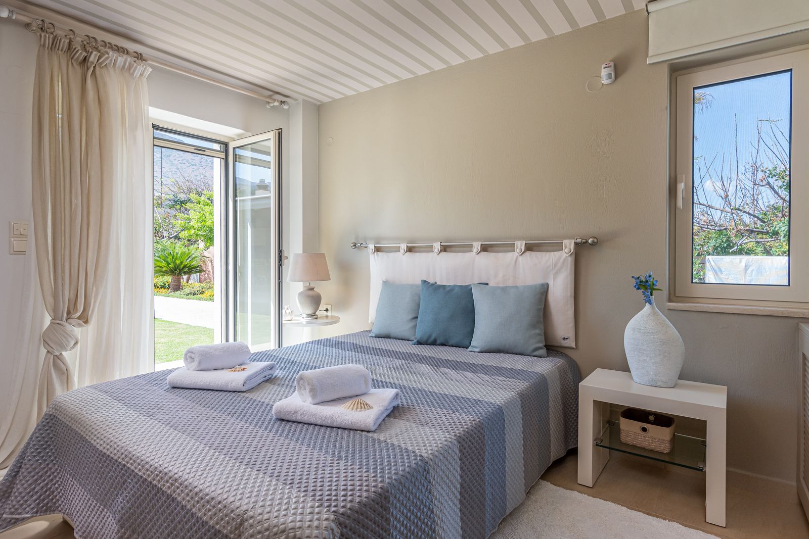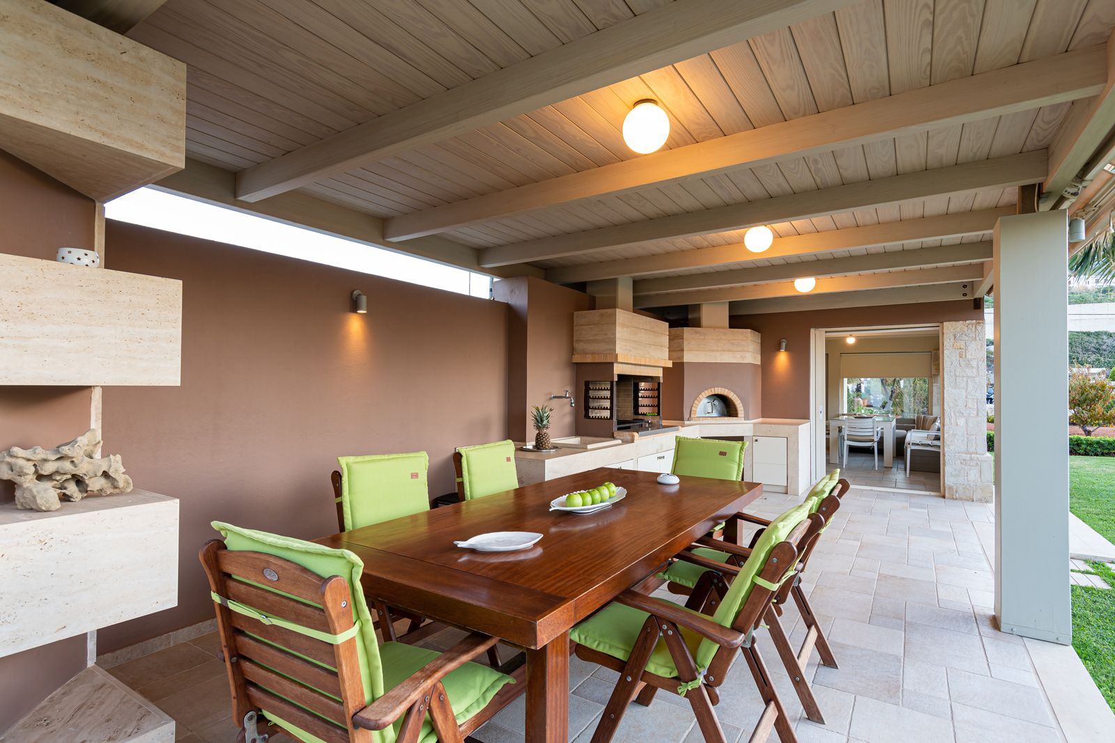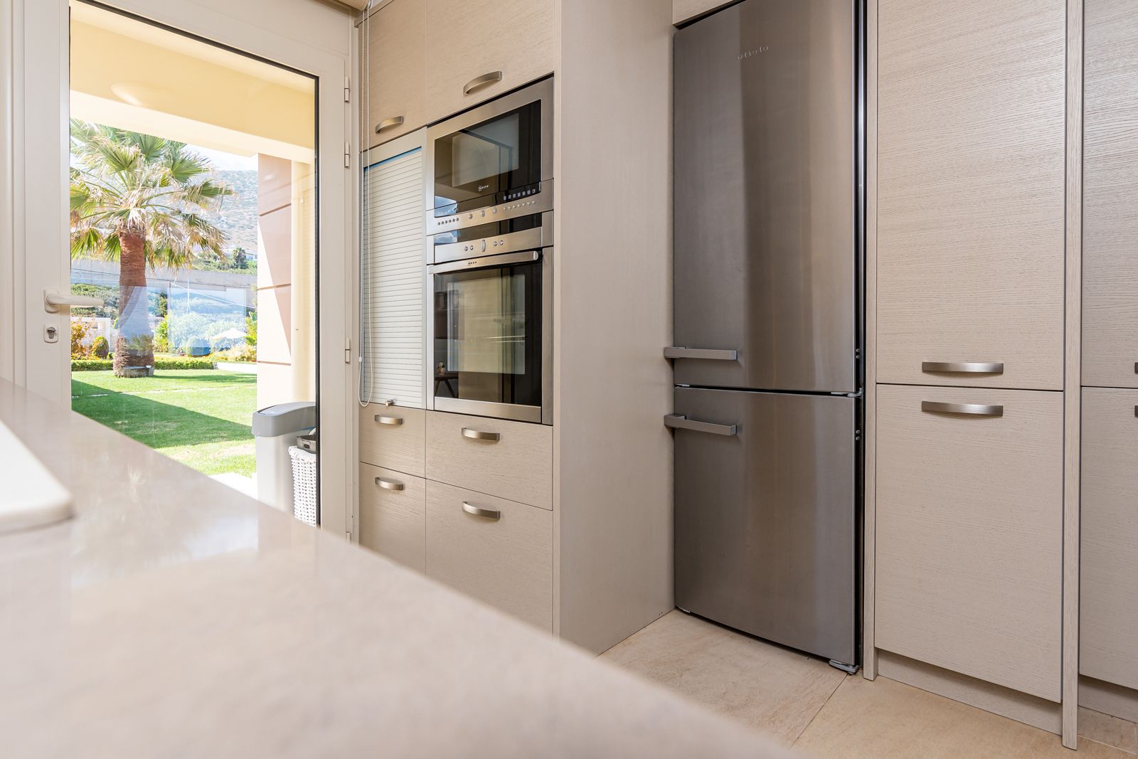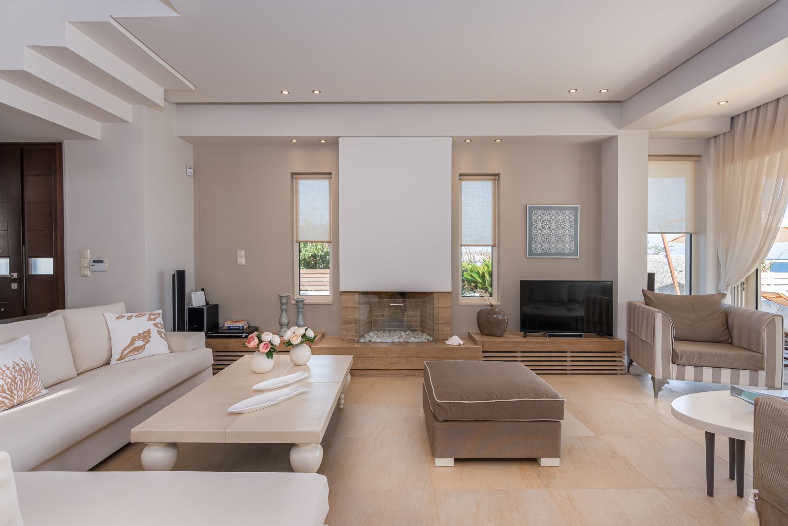 Brand new villa in Chersonissos in front of an organized sandy beach! Villa 'Hersonissos' is a luxury seafront holiday house only a few meters away from supermarkets, restaurants and shops. The villa is surrounded by a large grass garden with flowers and palm trees in a 1800 sq. m. of private property. Moreover it has a large swimming pool with sun beds and umbrellas.