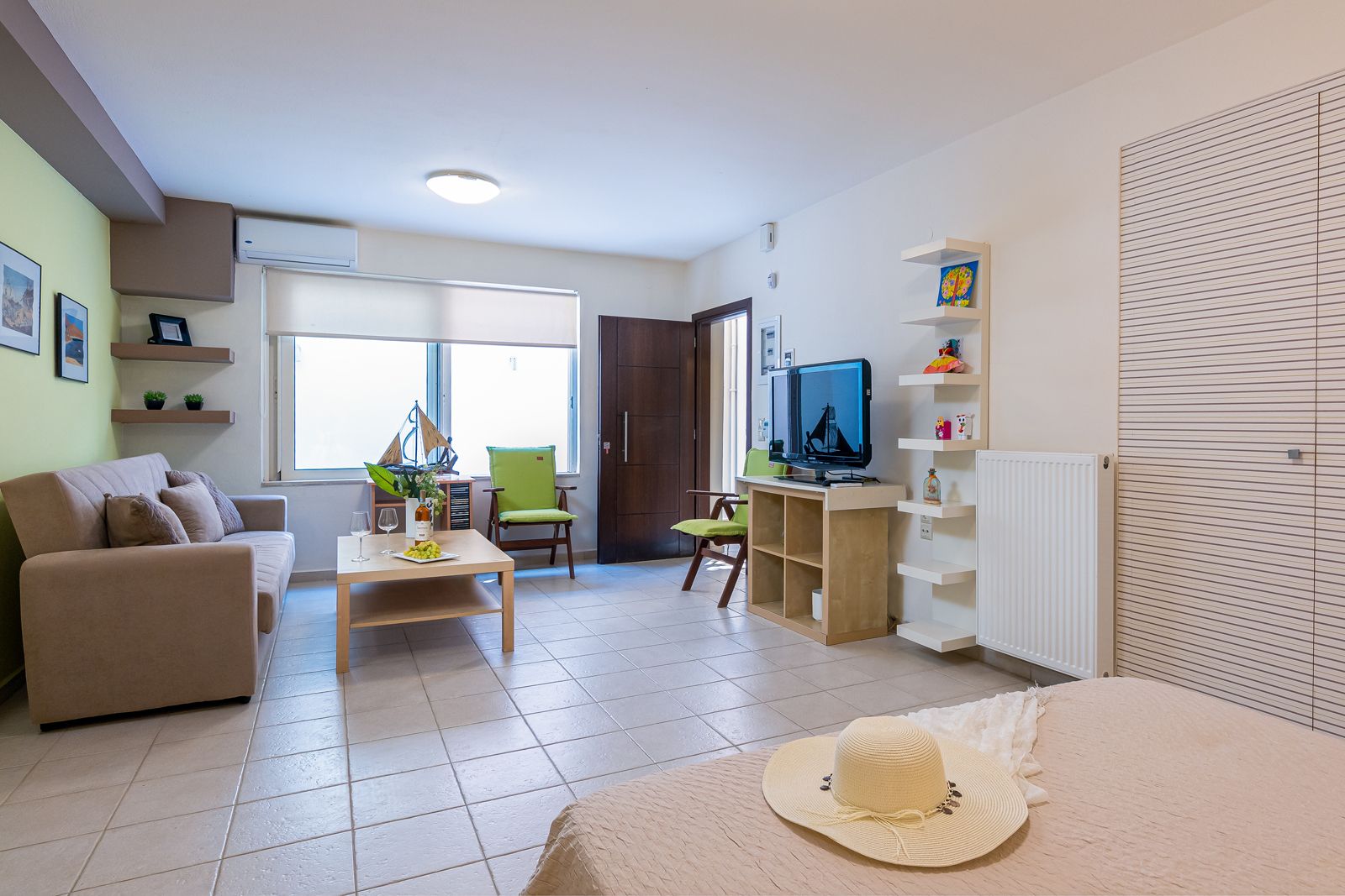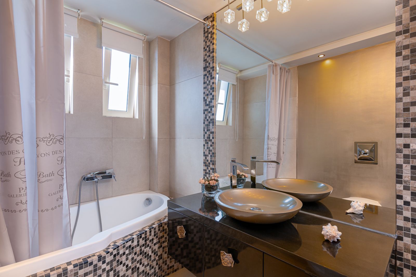 Outside there is a BBQ area with lounge furniture, a kitchenette and a small WC. While entering the 205 sq. m. house you find a living room with sofas, fireplace, satellite TV, DVD, stereo, internet and air conditioning. The decoration is minimal with earthly colored furniture and white curtains. While seated in the living room you can gaze at the sea horizon from the large window doors. The dining area has a large table next to a fireplace for romantic dinners. The main kitchen on the ground floor is fully equipped with all modern comforts. Hersonissos villa can accommodate up to 10 people in its 5 cozy bedrooms. One double bedroom is on the ground floor with an ensuite luxurious bathroom with shower. On the first floor there are two master bedrooms and a twin bedroom, all of them having a wardrobe, air conditioning, TV, doors offering balcony access overlooking the sea and en suite bathrooms, with the bigger master bedroom having a luxurious ensuite bathroom with bathtub. The terrace with sitting furniture on the first floor offers stunning views of the sea and the surrounding areas. From the ground floor there is an external staircase leading to a 35 sq. m studio with a double bedroom, en suite bathroom with shower, a small kitchen and lounge. In case of hiring staff, this area can host them almost separate from your group.