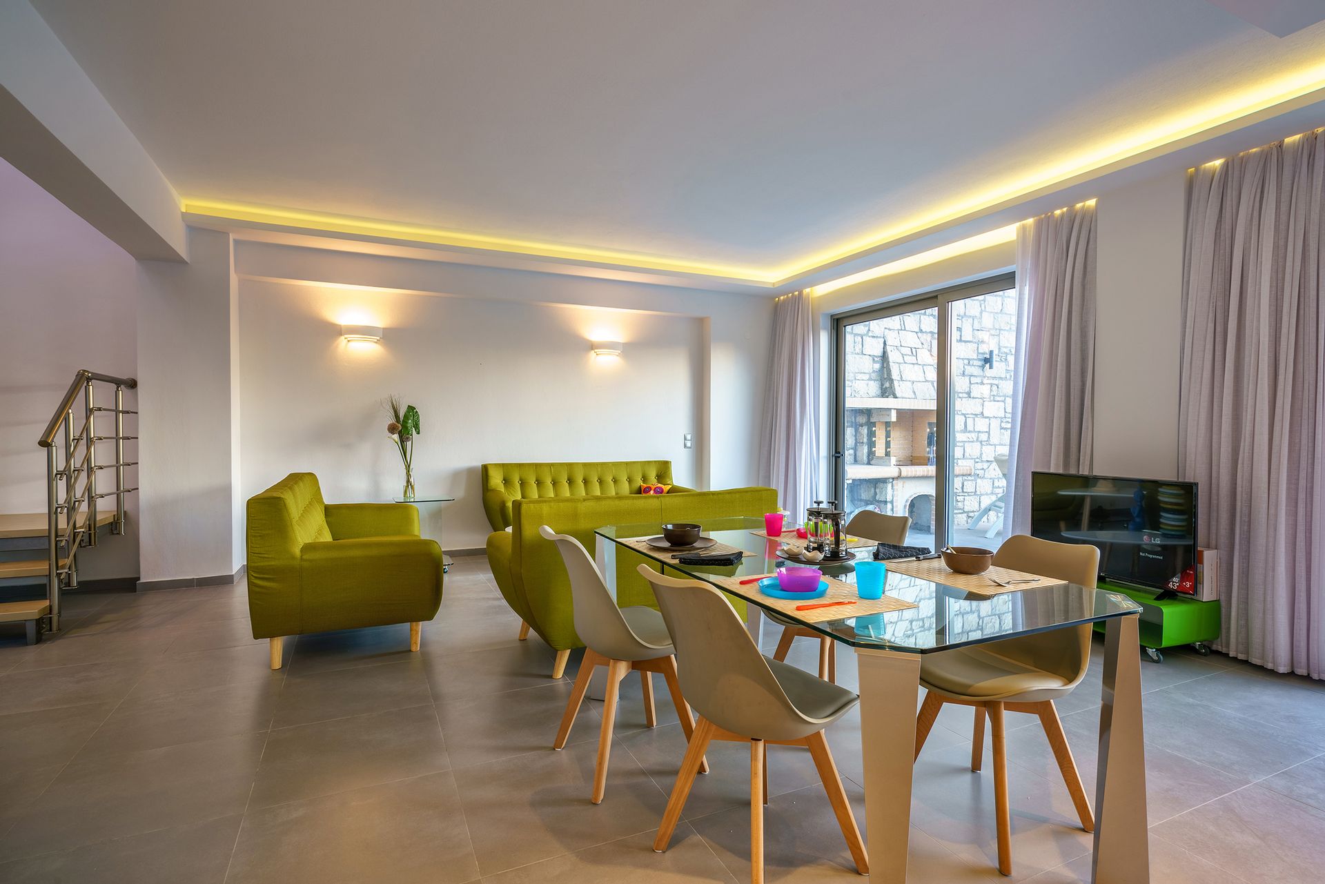 Iakinthos residence consists of two floors with a total area of 170 sq.m. and it can host up to six (6) people +1 sofa bed. At the ground floor there is a large, fully equipped kitchen with a dining table, a spacious living room with comfortable sofas and a large satellite TV. On the same floor there is also a master bedroom with ensuite bathroom.