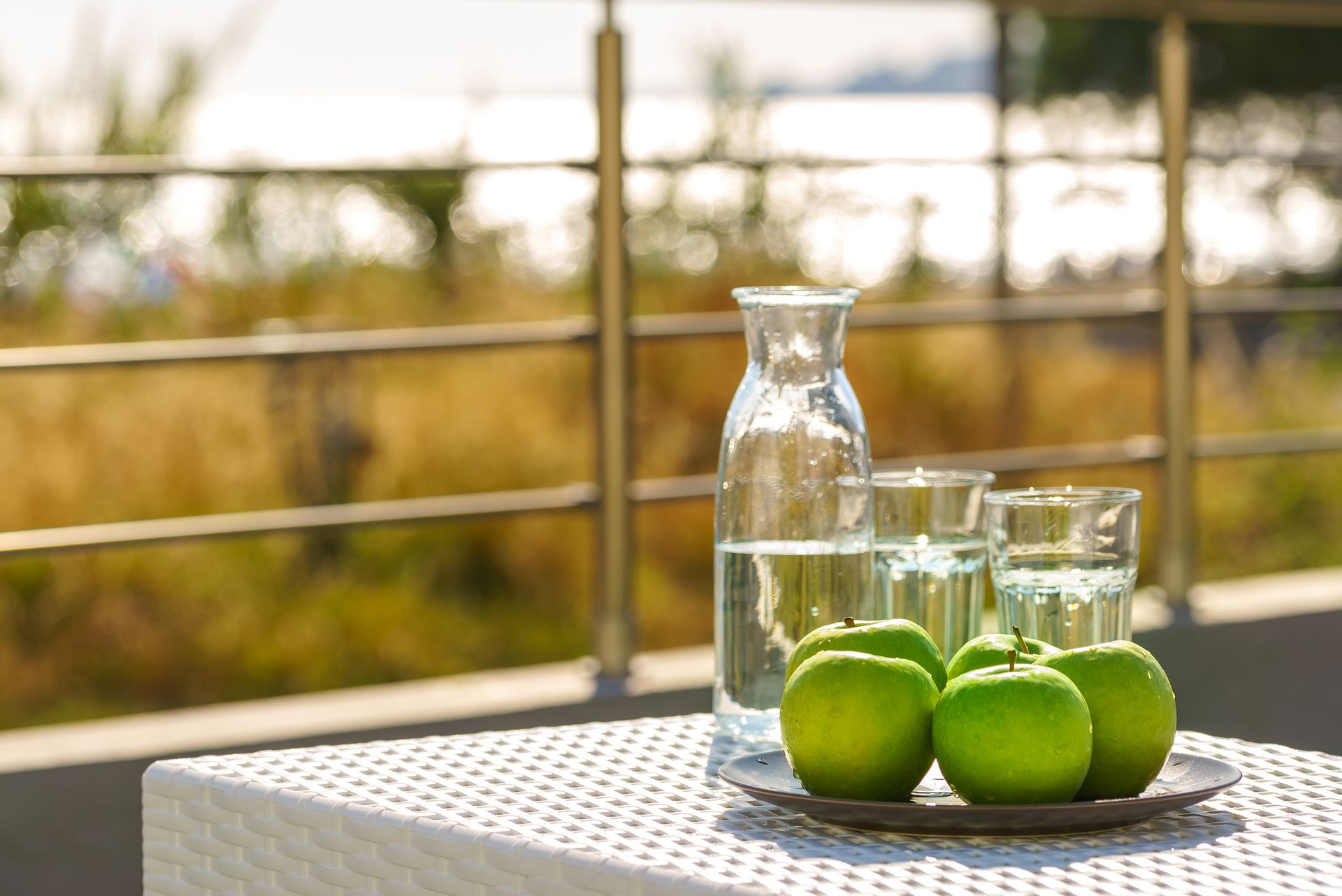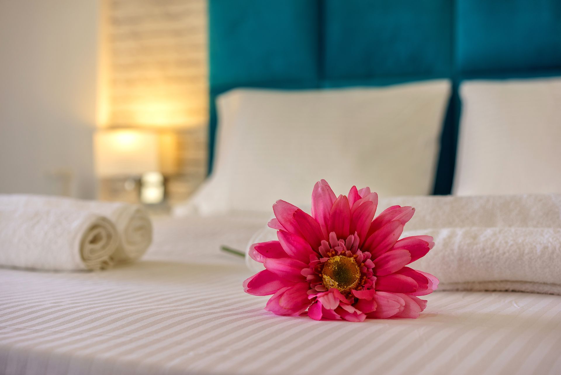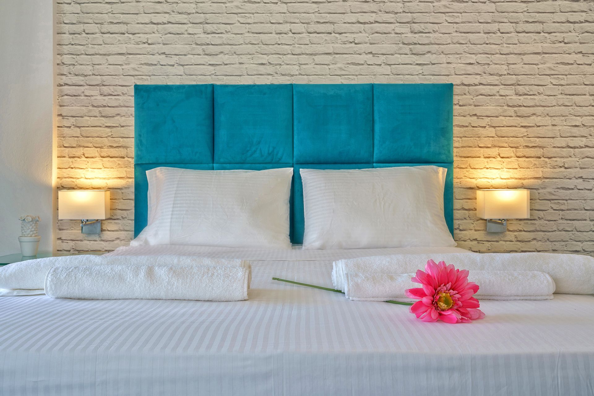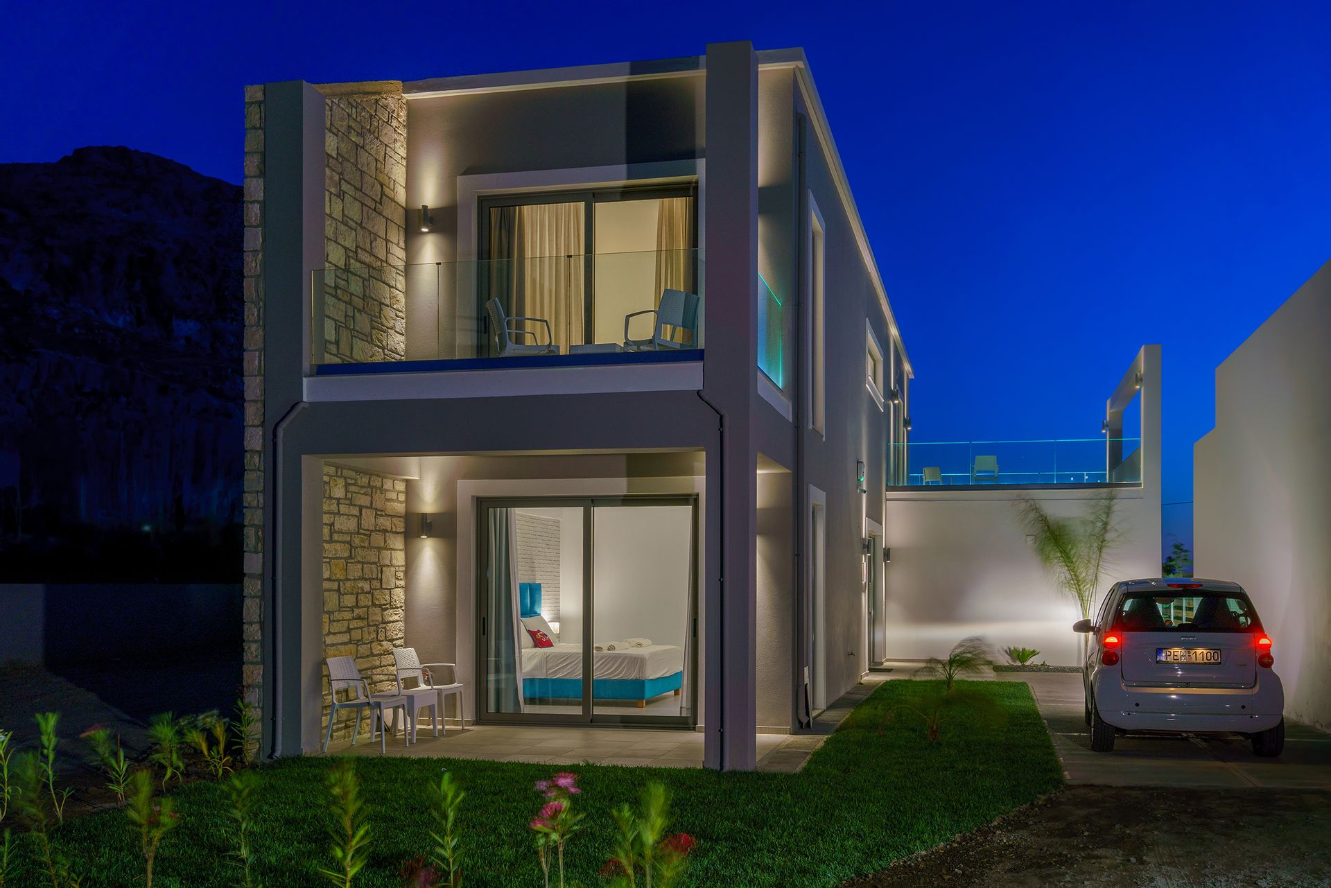 The residences are right on the beautiful sandy beach of Paligremnos. The beach is organized with umbrellas and sun beds and the water is crystal clear.