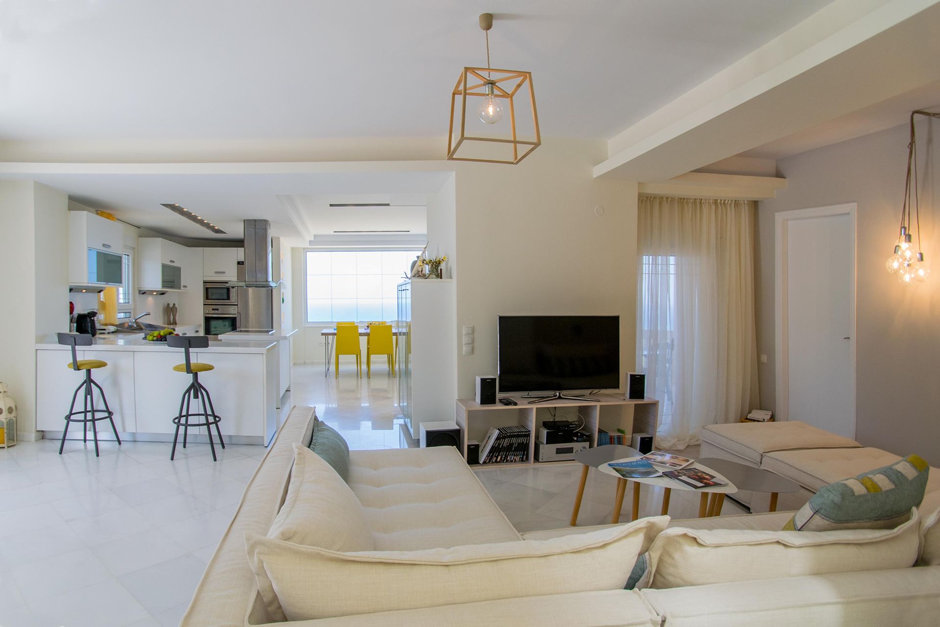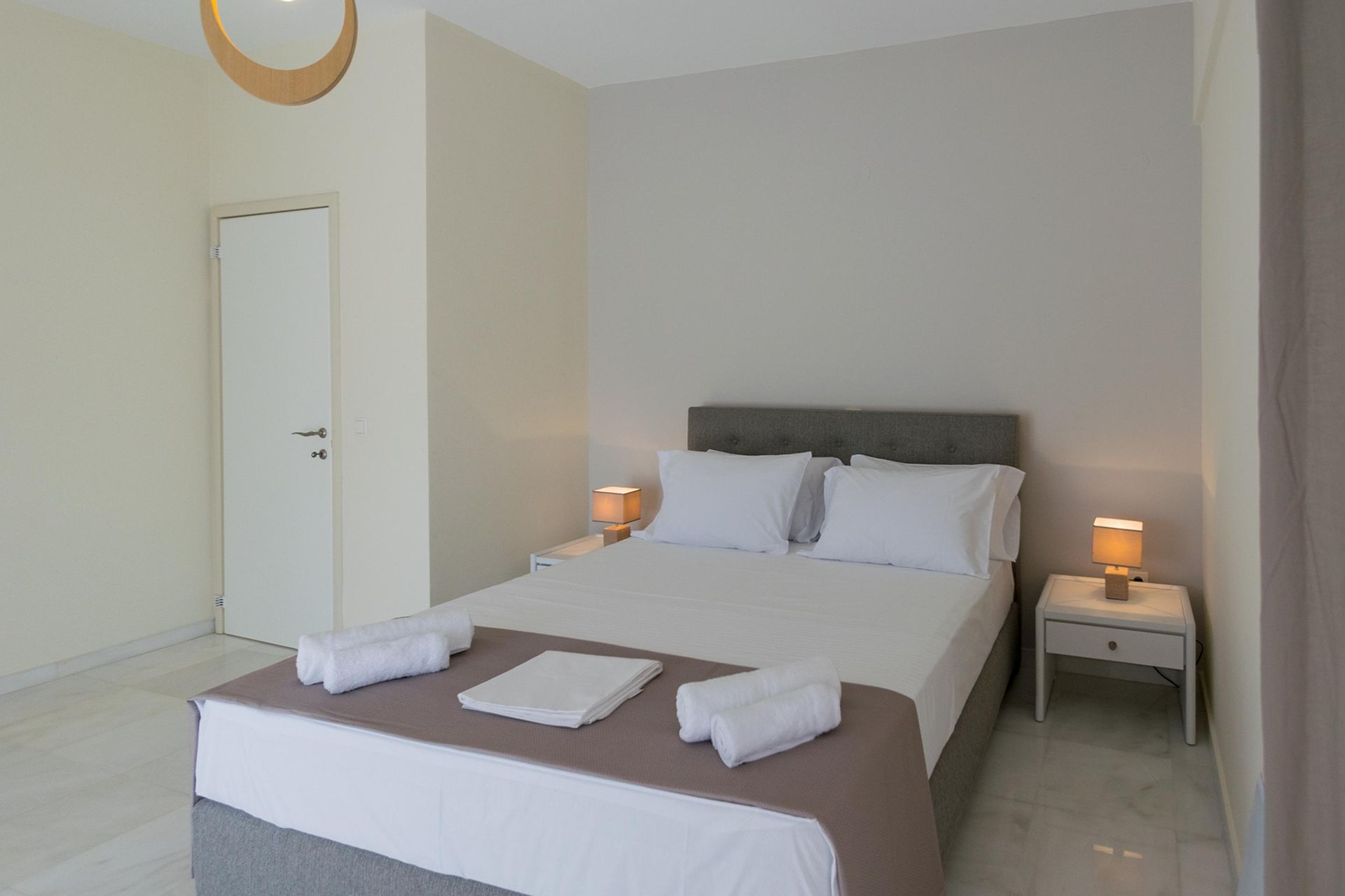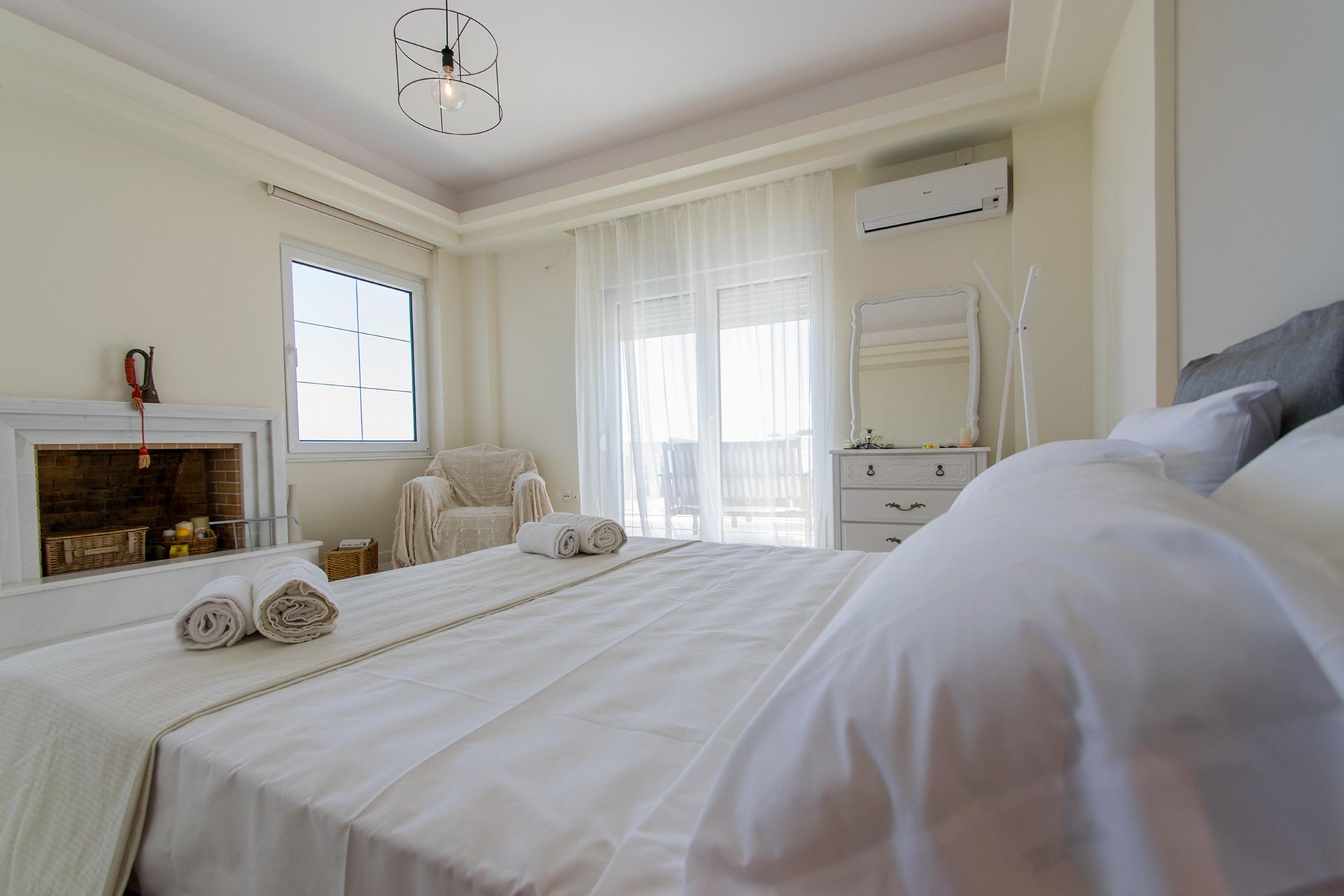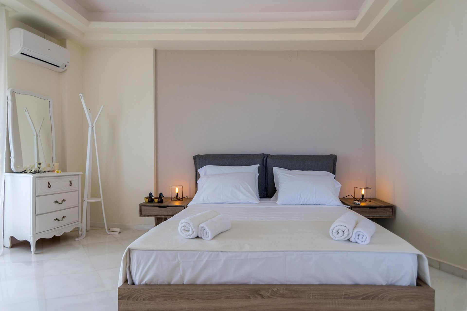 On the outside of the villa, you can find an infinity pool with panoramic views of the sea and the Rethymno’s old fortress, while drinking a cocktail and sitting on the sun beds next to the pool. Moreover a BBQ area can be found next to the pool where you can cook and taste Cretan food flavors, for a maximum Cretan experience. The villa has 2 floors containing 4 bedrooms and 3 bathrooms. Stepping into the villa from the entrance, one finds himself in the kitchen and the living room, with its comfortable sofas, a flat screen TV and also wifi is available, where you can rest after an adventurous day in Crete. The fully fitted kitchen is well equipped with oven, toaster, coffee machine etc that will make you feel like home. The 3 double bed bedrooms on the first and second floor have balconies that offer panoramic views of the ocean and landscape.