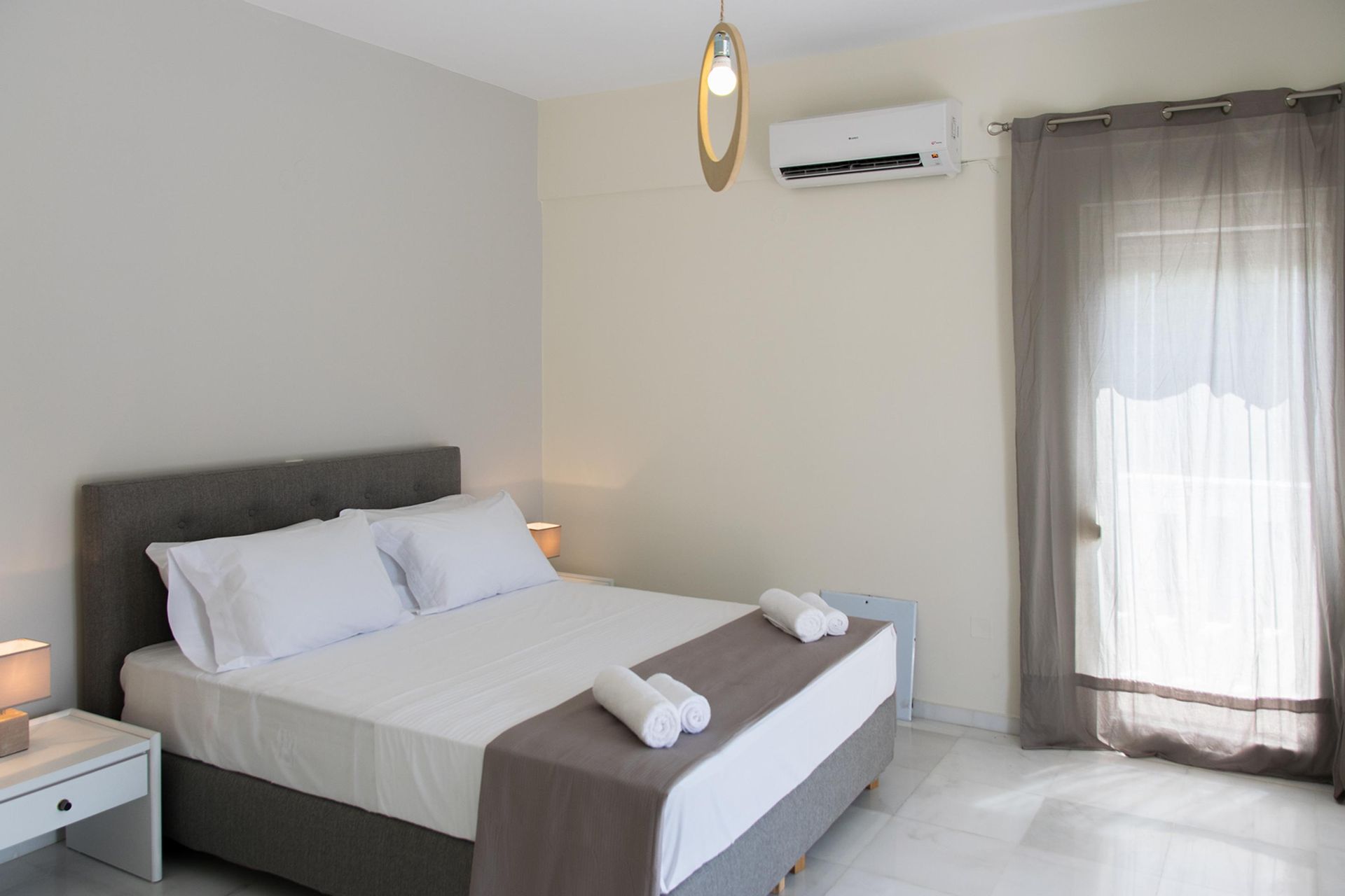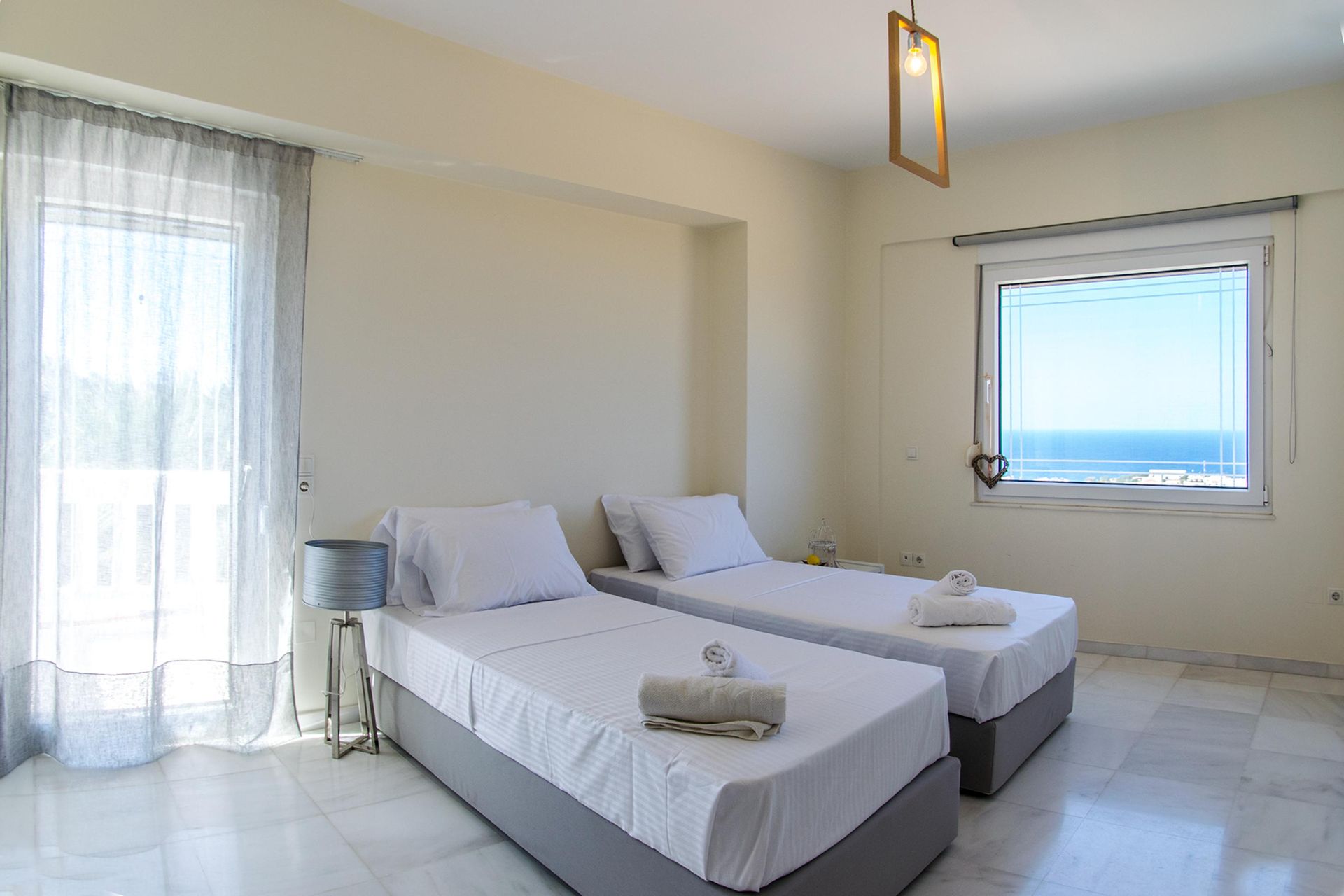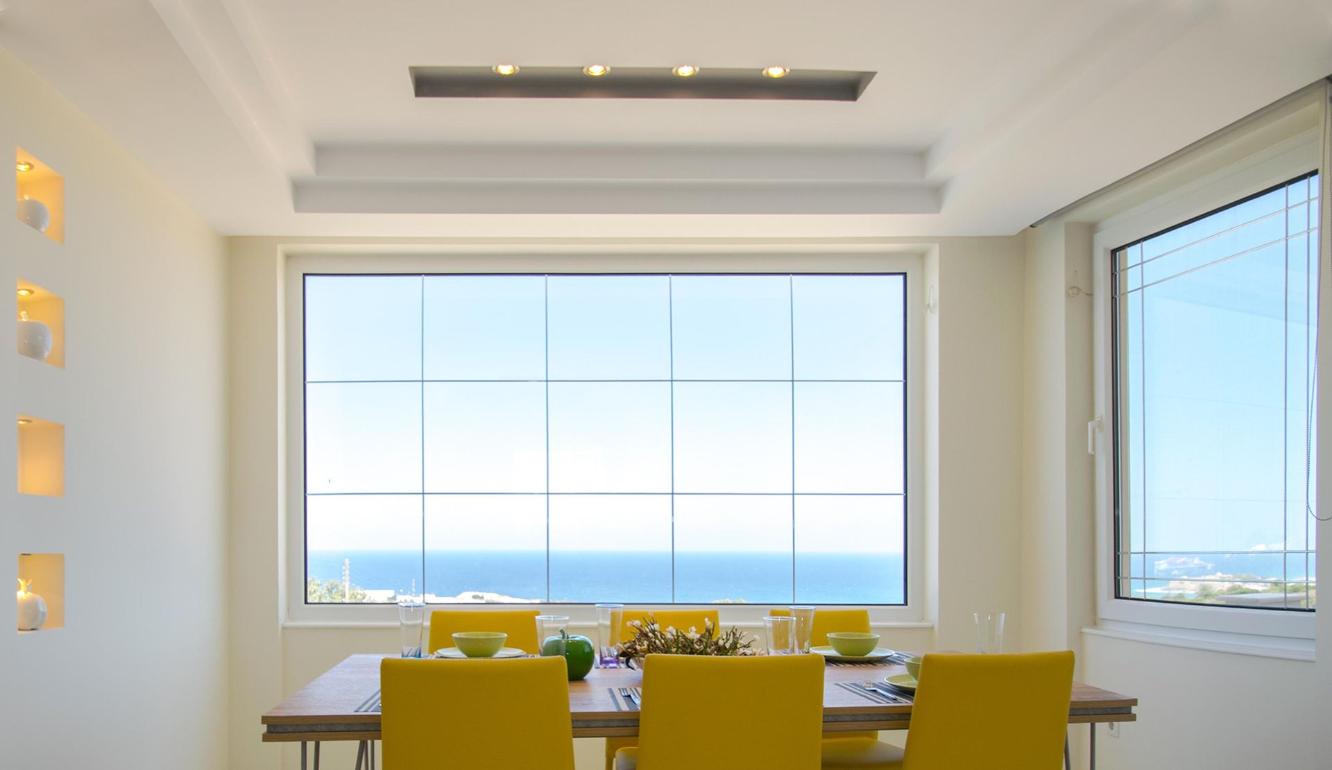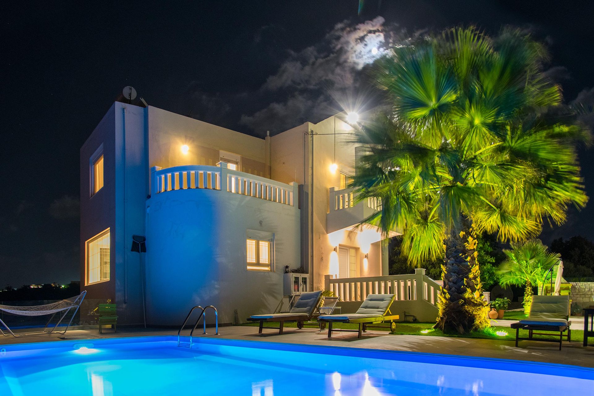On the outside of the villa, you can find an infinity pool with panoramic views of the sea and the Rethymno’s old fortress, while drinking a cocktail and sitting on the sun beds next to the pool. Moreover a BBQ area can be found next to the pool where you can cook and taste Cretan food flavors, for a maximum Cretan experience. The villa has 2 floors containing 4 bedrooms and 3 bathrooms. Stepping into the villa from the entrance, one finds himself in the kitchen and the living room, with its comfortable sofas, a flat screen TV and also wifi is available, where you can rest after an adventurous day in Crete. The fully fitted kitchen is well equipped with oven, toaster, coffee machine etc that will make you feel like home. The 3 double bed bedrooms on the first and second floor have balconies that offer panoramic views of the ocean and landscape.