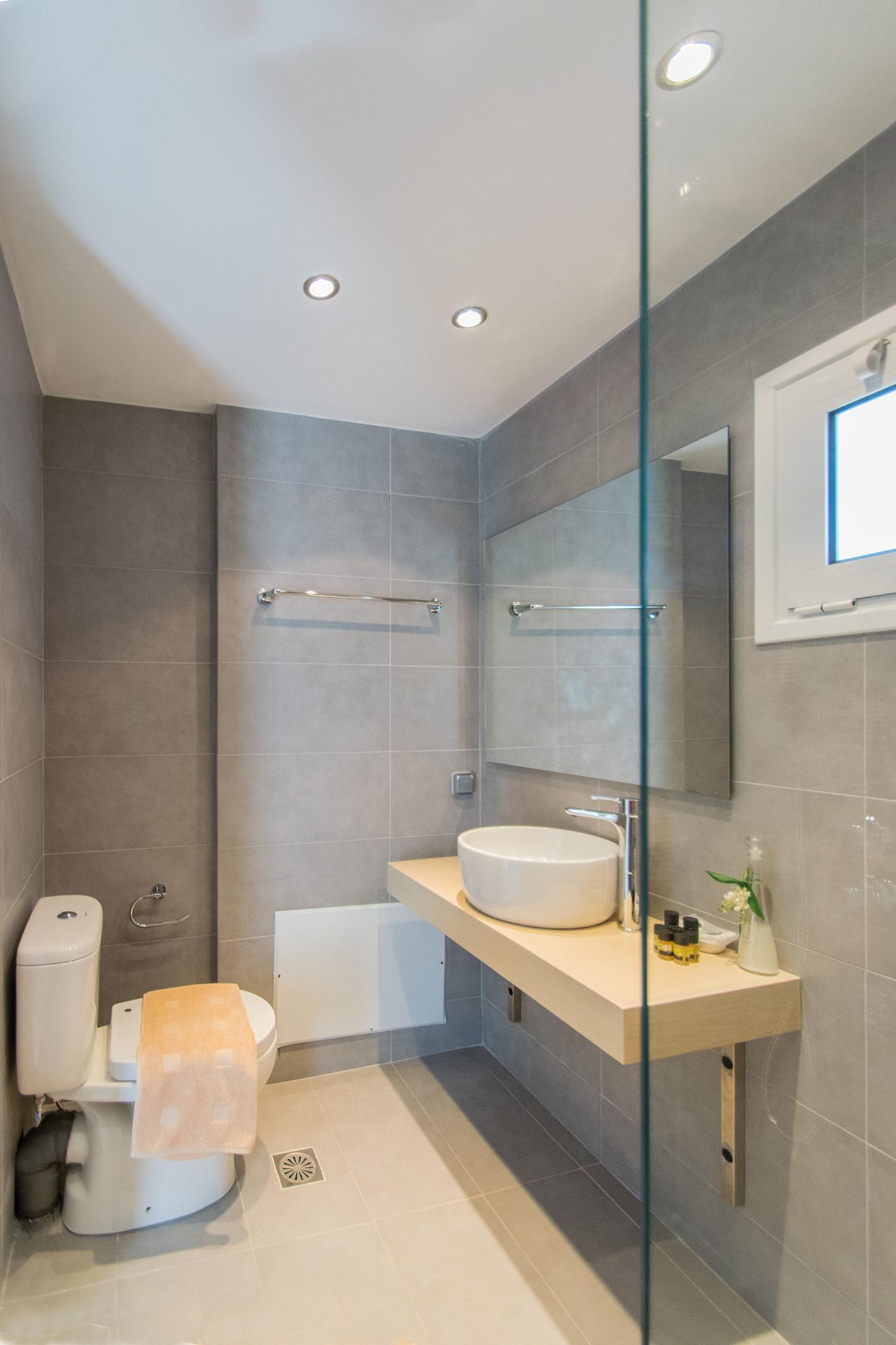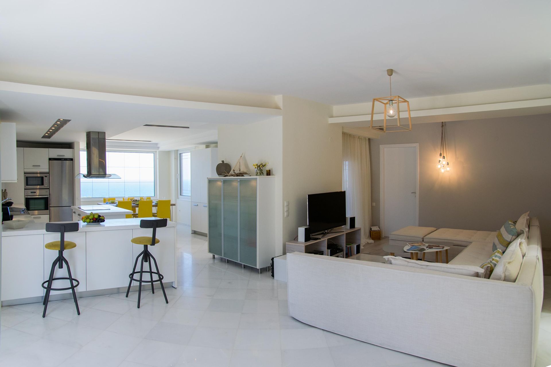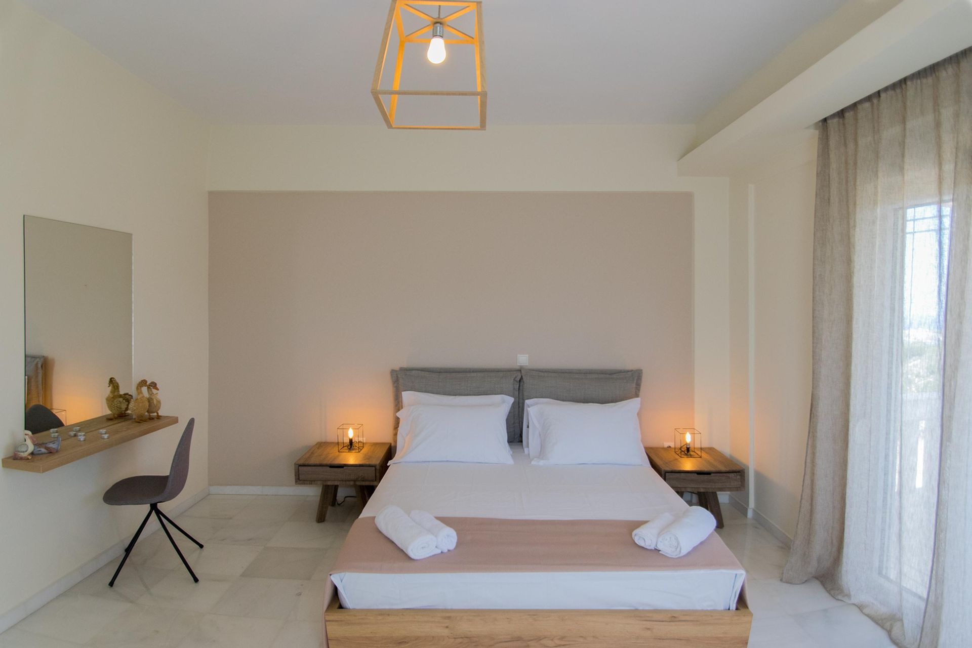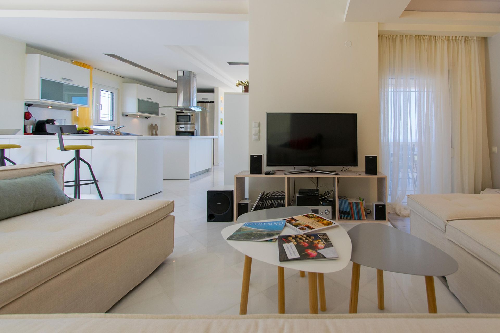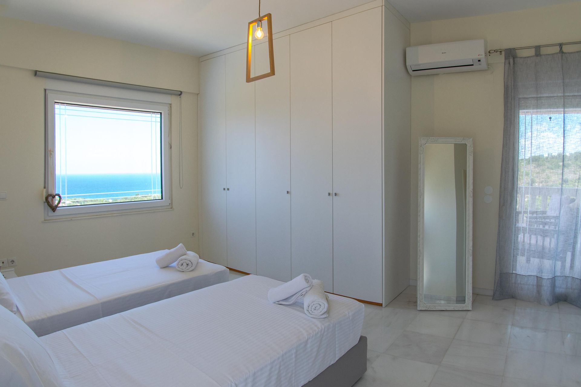 On the outside of the villa, you can find an infinity pool with panoramic views of the sea and the Rethymno’s old fortress, while drinking a cocktail and sitting on the sun beds next to the pool. Moreover a BBQ area can be found next to the pool where you can cook and taste Cretan food flavors, for a maximum Cretan experience. The villa has 2 floors containing 4 bedrooms and 3 bathrooms. Stepping into the villa from the entrance, one finds himself in the kitchen and the living room, with its comfortable sofas, a flat screen TV and also wifi is available, where you can rest after an adventurous day in Crete. The fully fitted kitchen is well equipped with oven, toaster, coffee machine etc that will make you feel like home. The 3 double bed bedrooms on the first and second floor have balconies that offer panoramic views of the ocean and landscape.