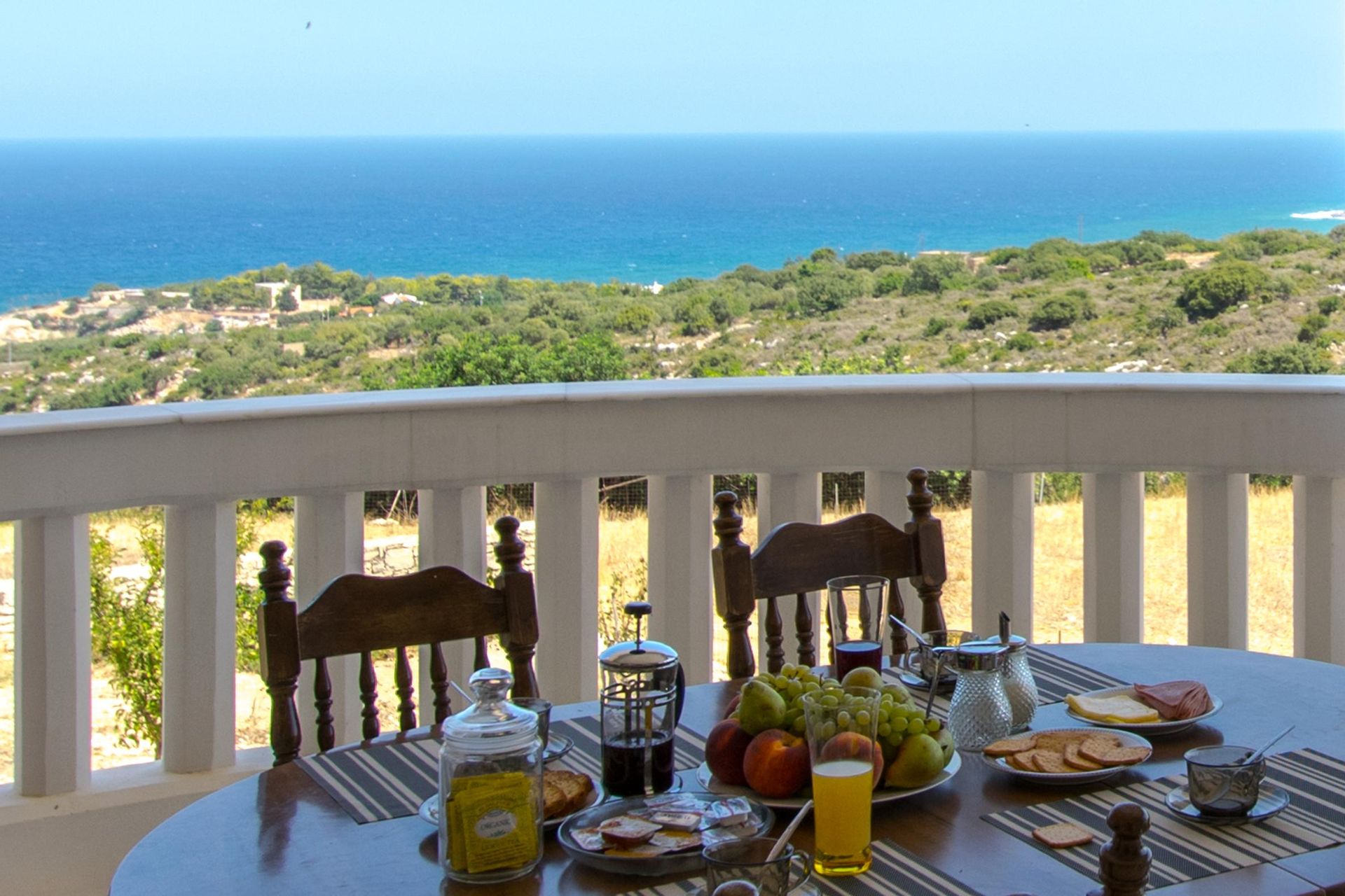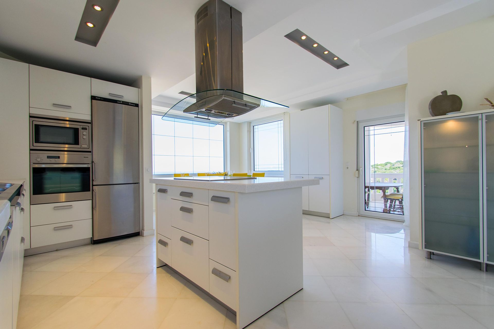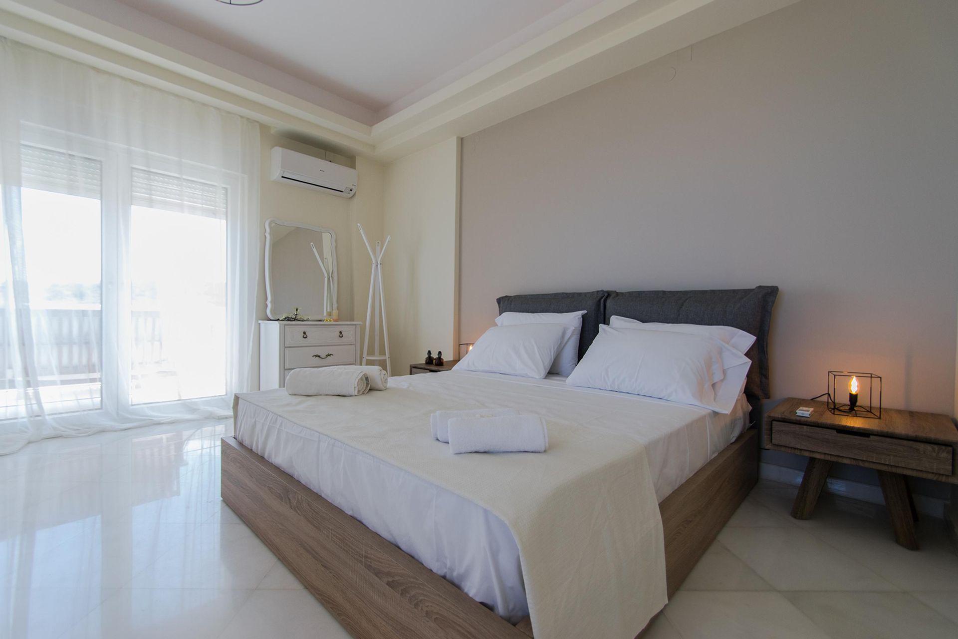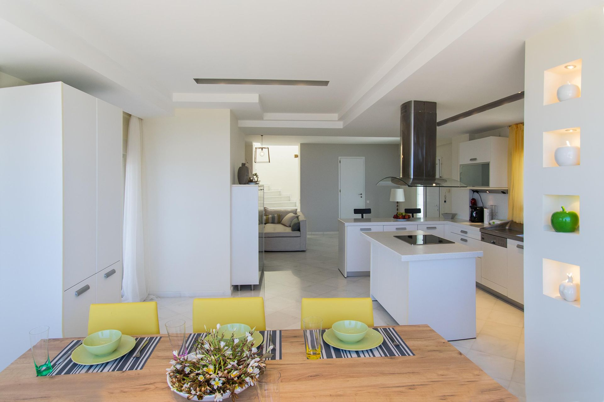 On the outside of the villa, you can find an infinity pool with panoramic views of the sea and the Rethymno’s old fortress, while drinking a cocktail and sitting on the sun beds next to the pool. Moreover a BBQ area can be found next to the pool where you can cook and taste Cretan food flavors, for a maximum Cretan experience. The villa has 2 floors containing 4 bedrooms and 3 bathrooms. Stepping into the villa from the entrance, one finds himself in the kitchen and the living room, with its comfortable sofas, a flat screen TV and also wifi is available, where you can rest after an adventurous day in Crete. The fully fitted kitchen is well equipped with oven, toaster, coffee machine etc that will make you feel like home. The 3 double bed bedrooms on the first and second floor have balconies that offer panoramic views of the ocean and landscape.