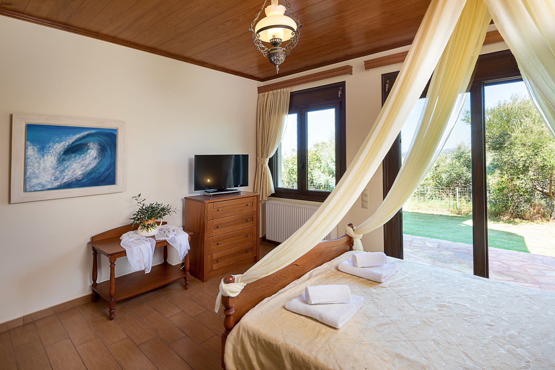 The main entrance leads to the living room with 2 sofas and the coffee table welcomes you to the ground floor of the villa. In the living room you can find a satellite TV plasma and DVD player a stereo CD player. Next to the living room there is a kitchen which contains all modern comforts as dishwasher, fridge and freezer as well as electric cooker with ceramic hob and microwave. There, you can also find the dinner table with chairs for 8 persons and in the corner there is a fireplace, for the cold winter days.