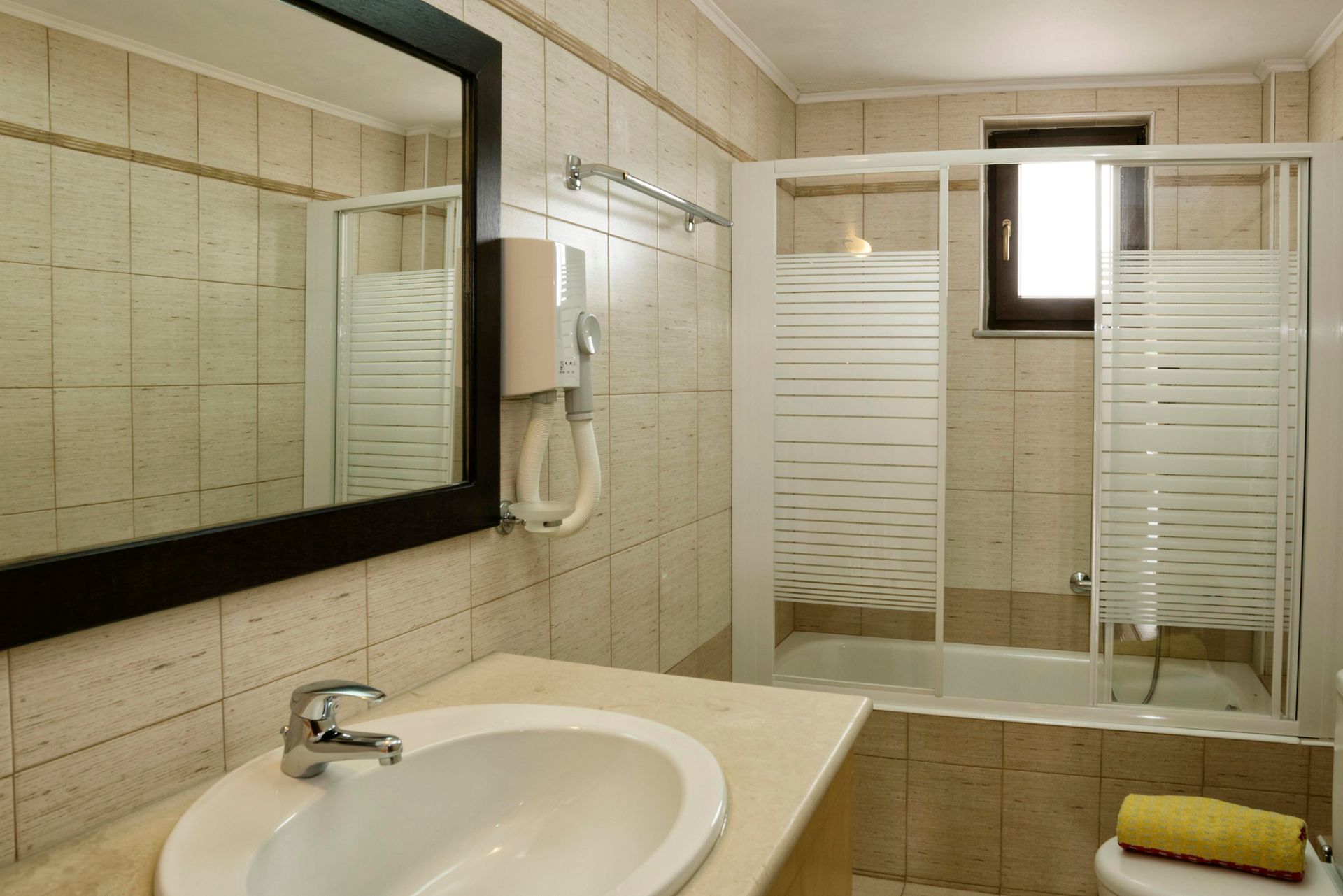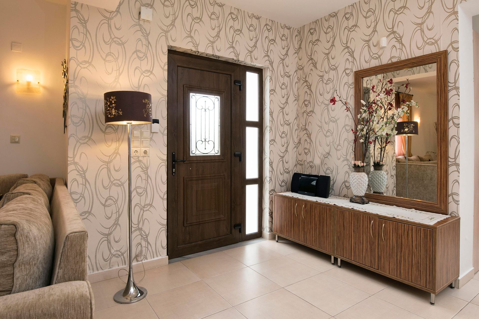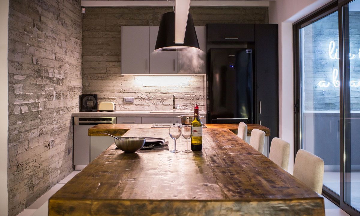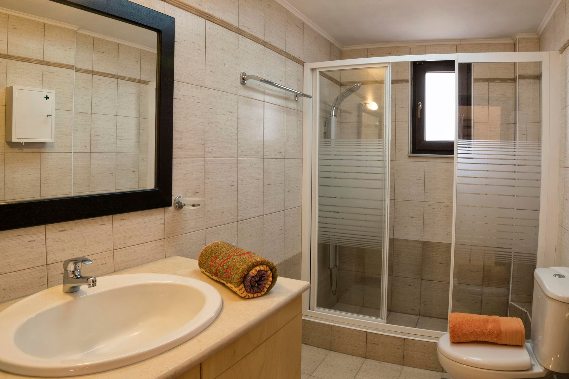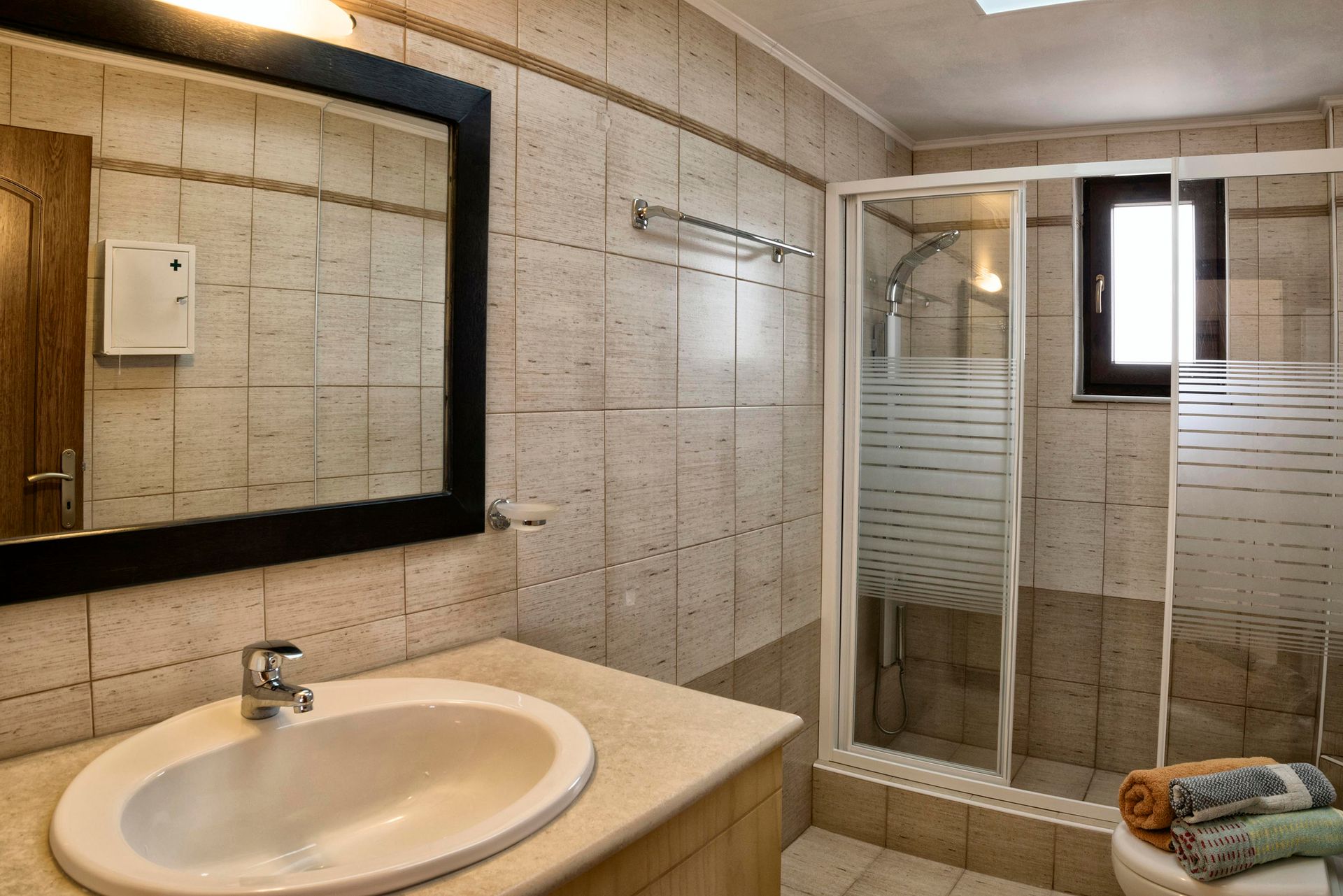 Stepping into the villa from the first floor, one finds himself in the living/lounge area, with its comfortable sofas, Flat screen TV, WIFI, etc. The fully fitted kitchen is well equipped with oven, hob, fridge, microwave, etc. On the same floor there are 2 bedrooms, one with double bed and the other one with 2 twin beds. All of them have their own bathroom, TV, air-condition, reading lamps, massive wardrobes.