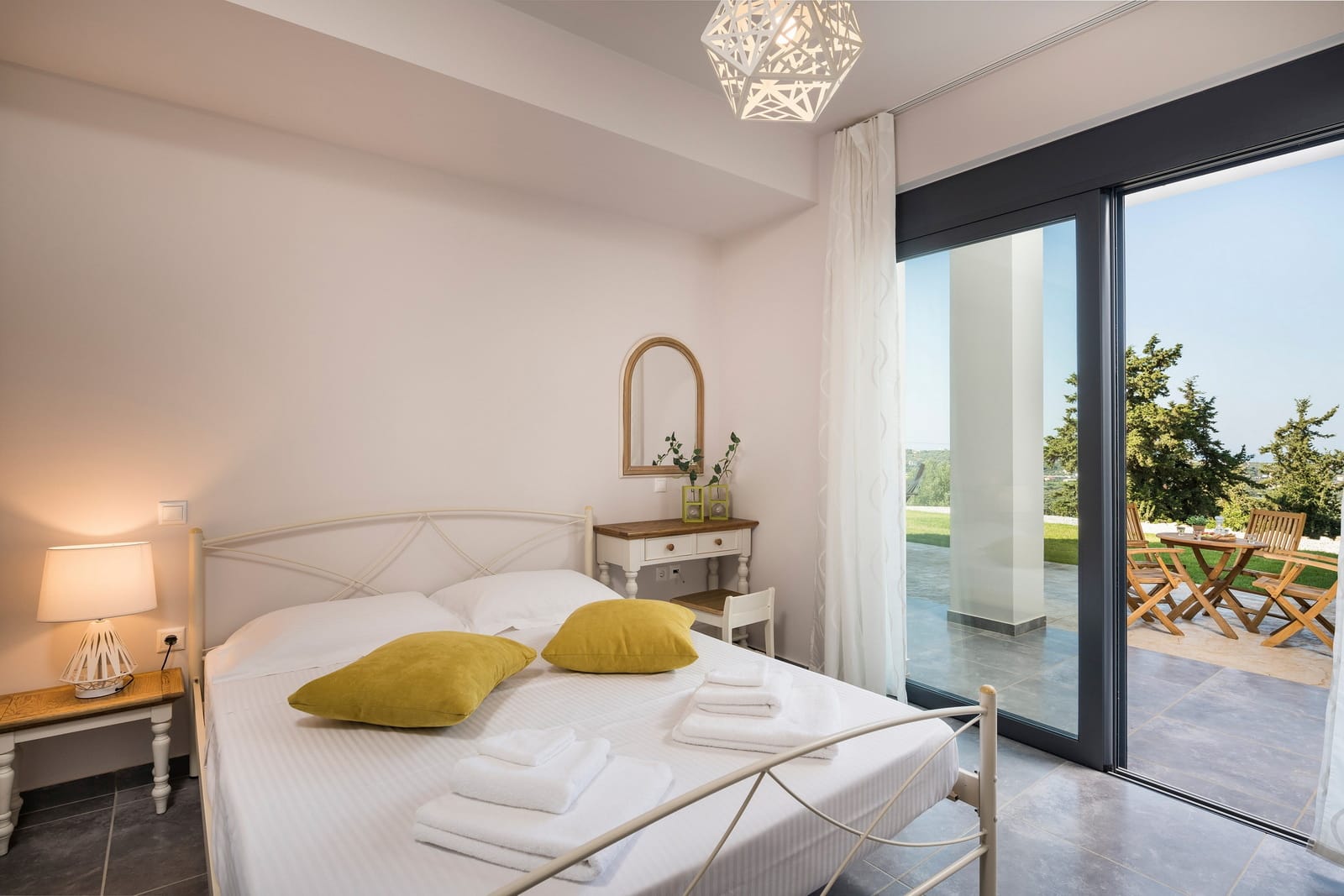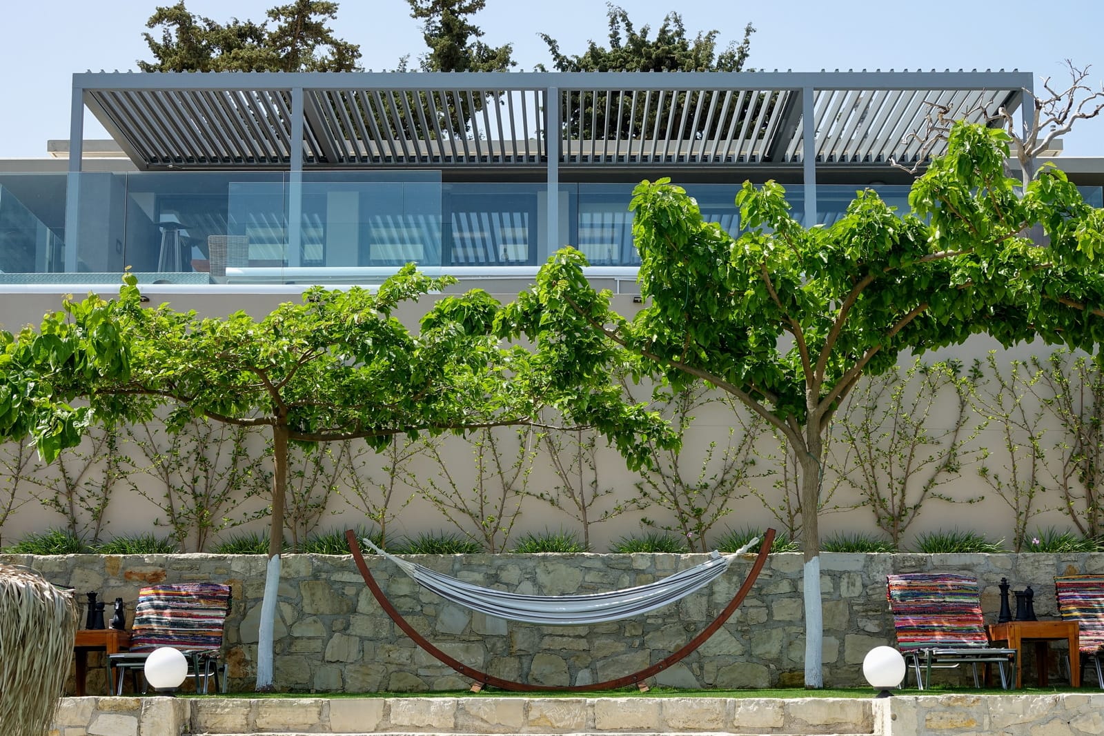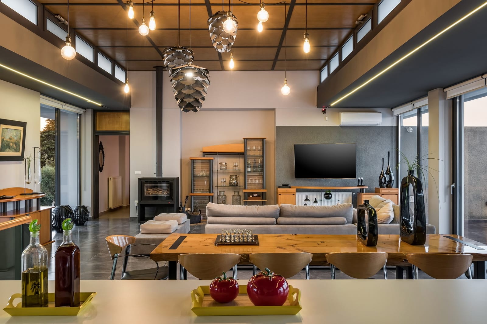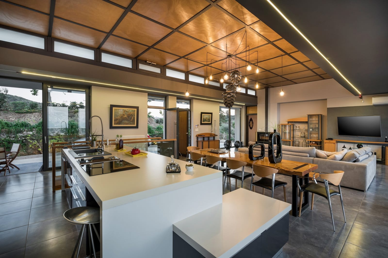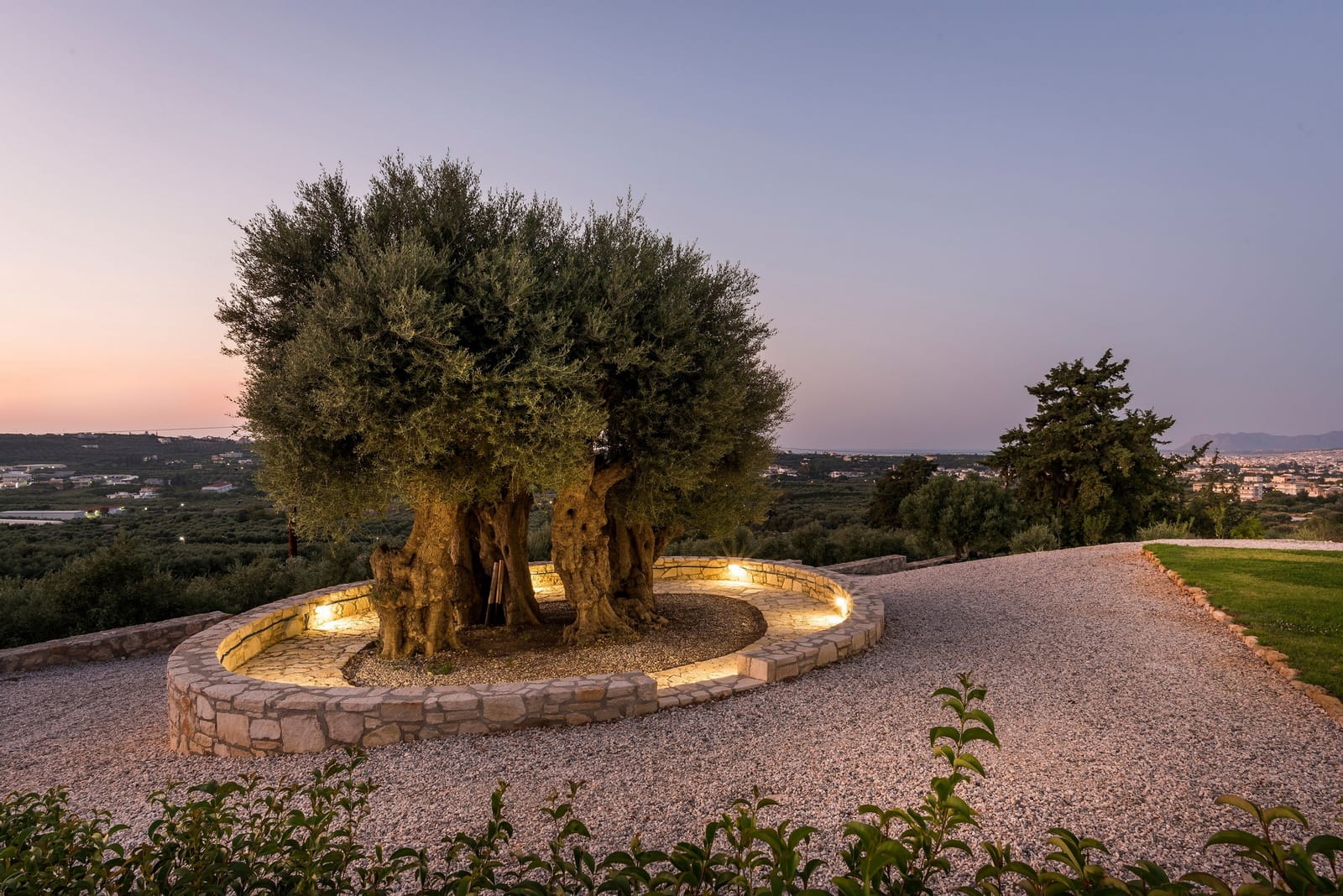 Olivenest Villa presents a picturesque location on the outskirts of Chania, for a family gathering or special occasion with the capacity to host 16 guests, and is outfitted with tasteful furnishing and modern comforts you require for a luxury holiday in Crete. Olivenest villa boasts a 500 m2 luxury living space, which is divided into a central part and 2 wings, functioning perfectly as 3 independent homes. There is an open plan living area with a terrace, plus a dining area and an ample kitchen with fantastic views over the pool and a centuries ’old olive tree. Outdoors, the glossy and comfort atmosphere is well-kept including multiple terraces, a private heated pool and lawn gardens with a BBQ. A small lawned area around the pool offers ample space for sunbeds surrounded by nature that will add value to your special moments. The view from the indoor and terrace is simply stunning, and the living areas are thoughtfully designed to offer maximum privacy and comfort; Olivenest Villa is spit in 3 separate and independent villas; the Royal floor (no stairs), with 3 bedrooms, 1 kitchen, 2 bathrooms, to accommodate 6 guests, the Imperial West Ground floor (no stairs), with 3 bedrooms, 1 kitchen, 1 bathroom to host 6 people and the Imperial East Ground floor (no stairs), with 2 bedrooms, 1 kitchen, 2 bathrooms, to host 4. Sink into the contemporary sofas in the central living room, which is laid out to the highest standards, cozy up to the kitchen’s facilities to prepare food and gather around the monastery type dining table for a special Greek meal with family or friends. You can sit back, relax and take in this fabulous setting from the massive balcony, or dive into the swimming pool and savor a vacation that allows you to connect with yourself at a leisurely pace.